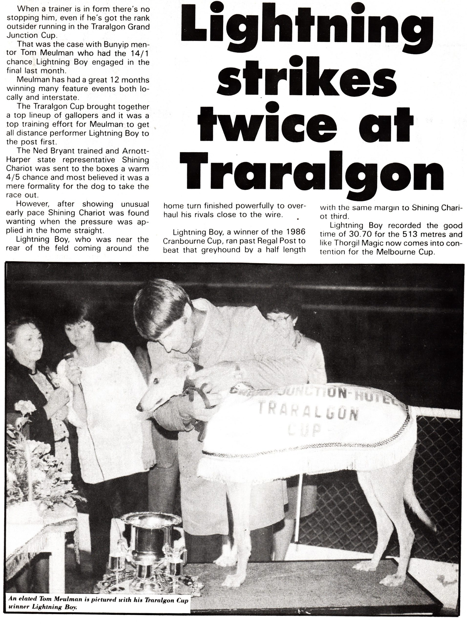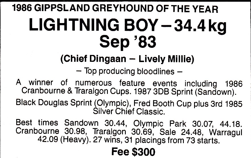 Lightning Boy (Chief Dingaan x Lively Millie) wins the 86 Traralgon Cup top field Regal Post second Shining Chariot third who he ran fourth to in the 87 Cranbourne Cup after winning that race in 1986. 54 Starts 19 wins and 20 placings $20,997. I think that’s our Marg in charge. Above shot after the 1986 Cranbourne Cup I am in the back corner of the pic acting as MC which I did for over 15 years at Cranbourne Cups.