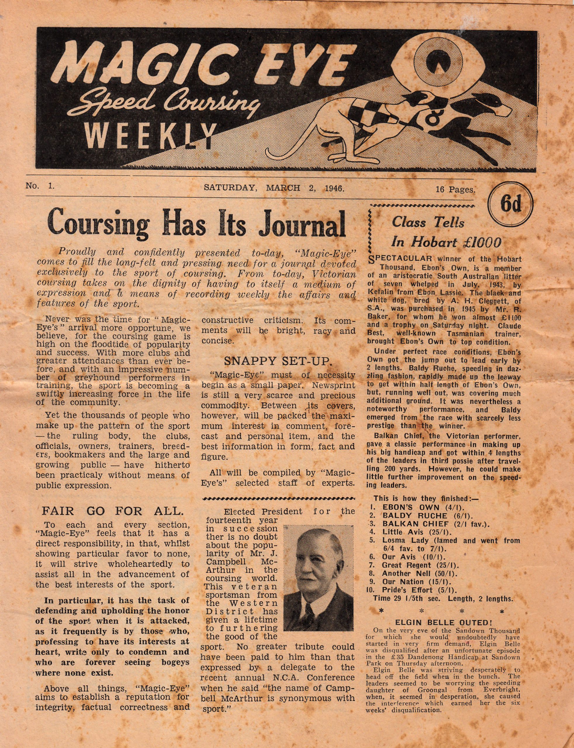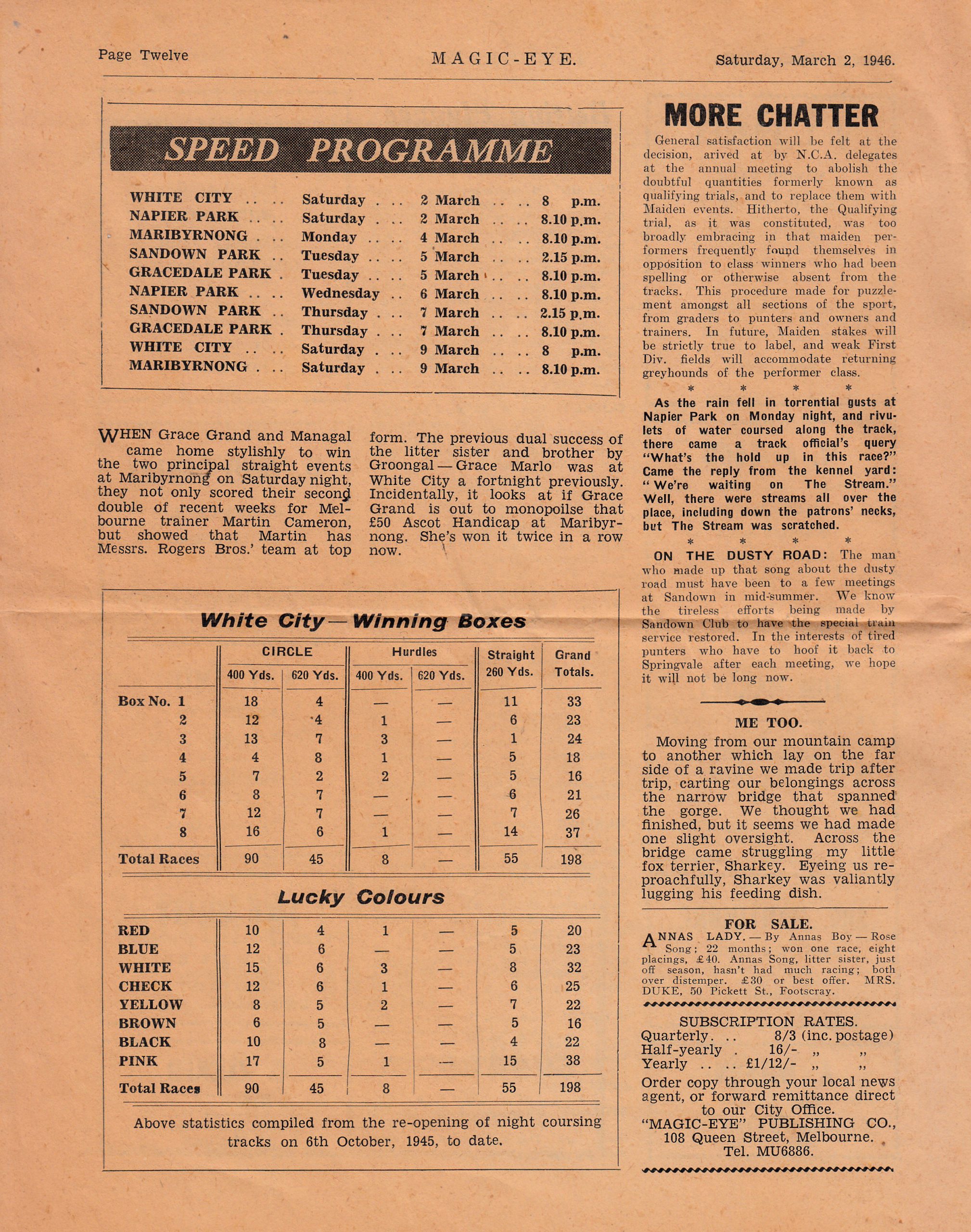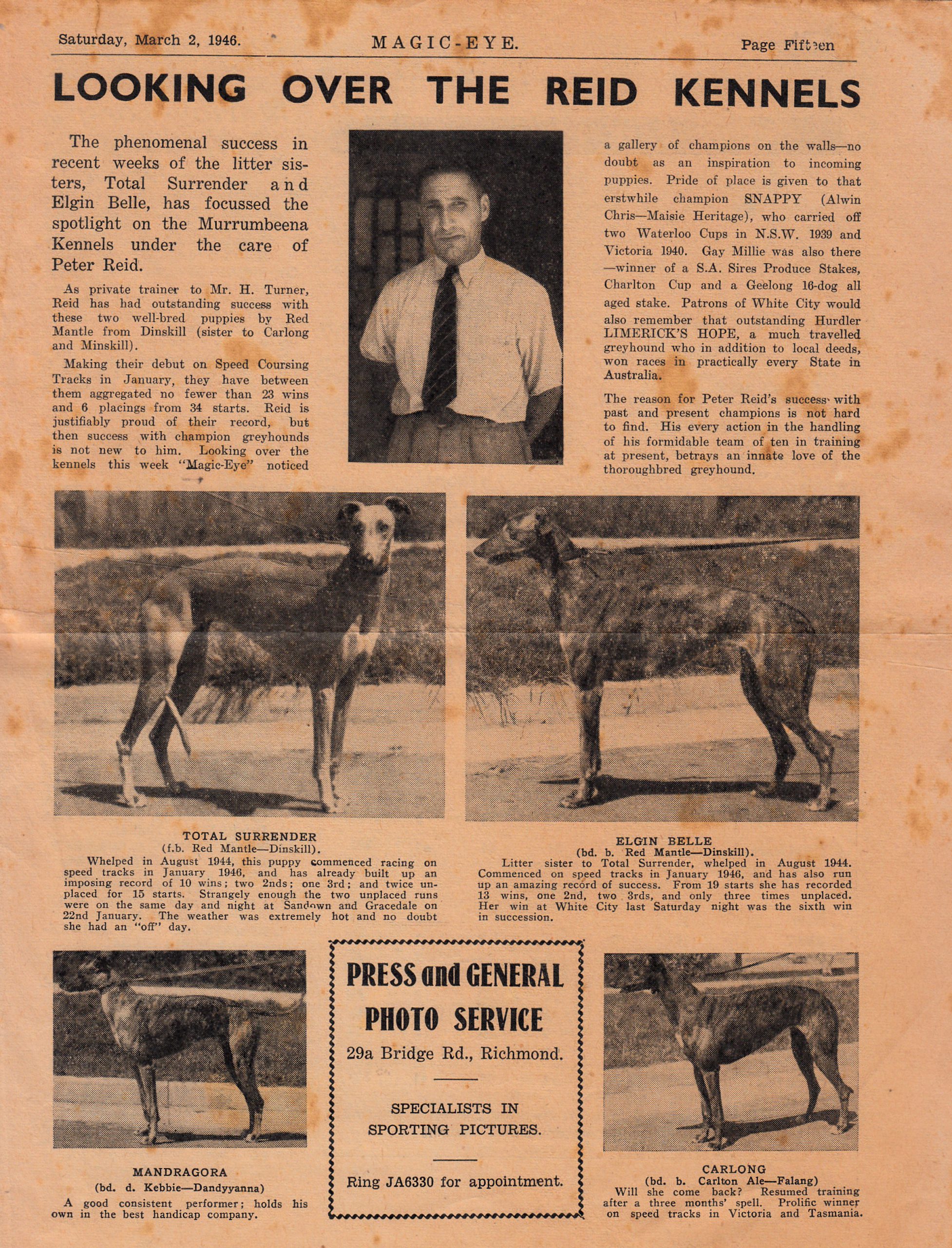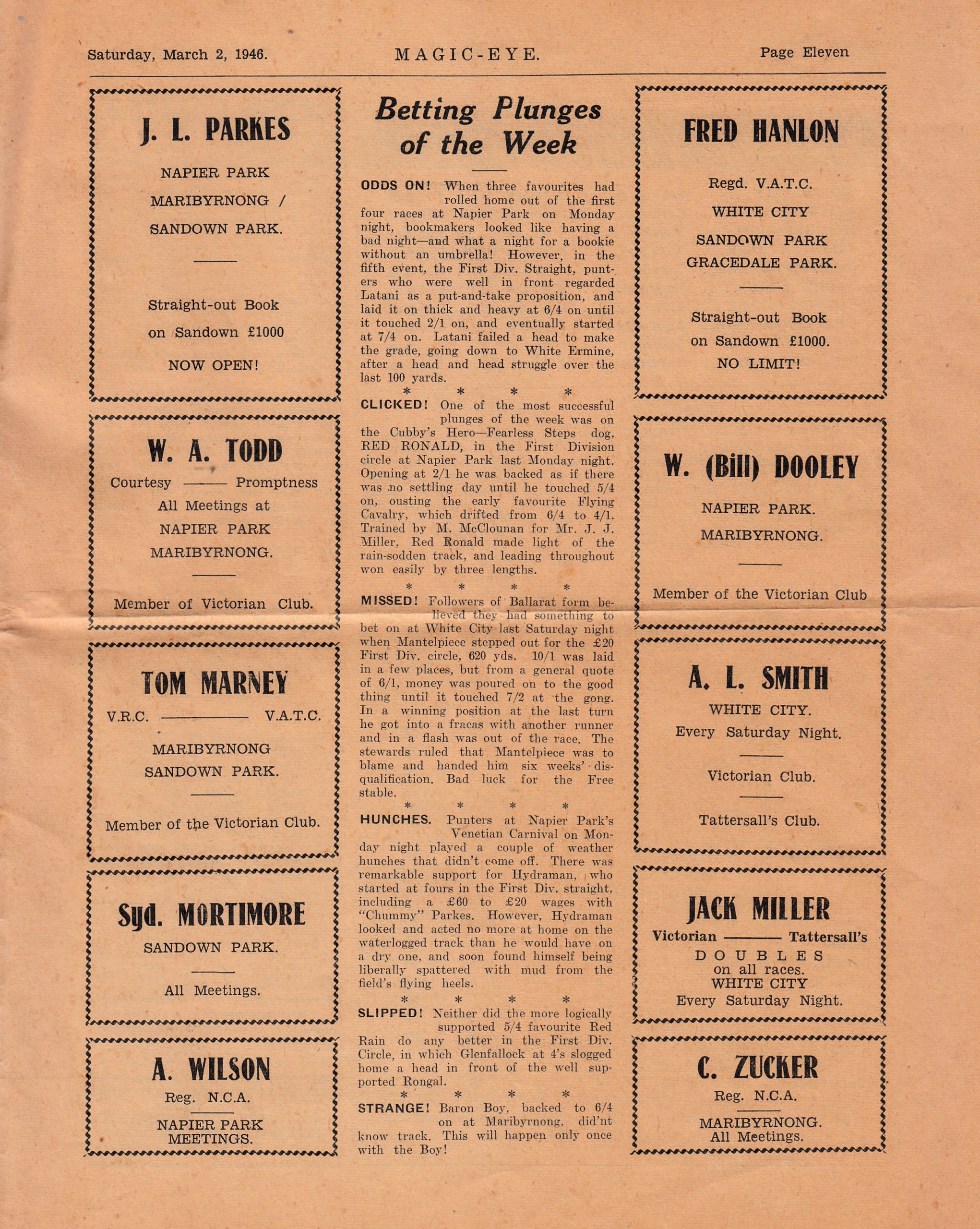 Jucinta Grant from the famious Sydney suburb of Balmain reached out to me by email with an offer of some artifacts she found while she was tidying up her late mother’s estate. Jacinta is the Granddaughter of the late Leo Confoy the legendary founder of the Napier Park Greyhound complex in the Melbourne suburb of Essendon in the non-proprietary days of the sport from the 1930’s until the late 1950’s. Jacinta kindly sent me a host of material she thought I might find interesting. The first item I came across was a publication called The Magic Eye 1946 first edition (interesting name for a weekly Greyhound form guide and paper). I got to page 15 and there was the Murrumbeena Maestro Peter Reid. I trust our member and elder statesman John Reid will enjoy the pics and story. A few more pages from the Magic Eye. Some famous names on the Bookies page and I love the Betting Plunges of the Week. The Speed Programme had plenty going on at the five suburban tracks. Seems the Sandown 1000 pound was a big deal. I like the ad The Flemington of Greyhound Racing Sandown Park. I think the Magic Eye was well-priced at six pence.