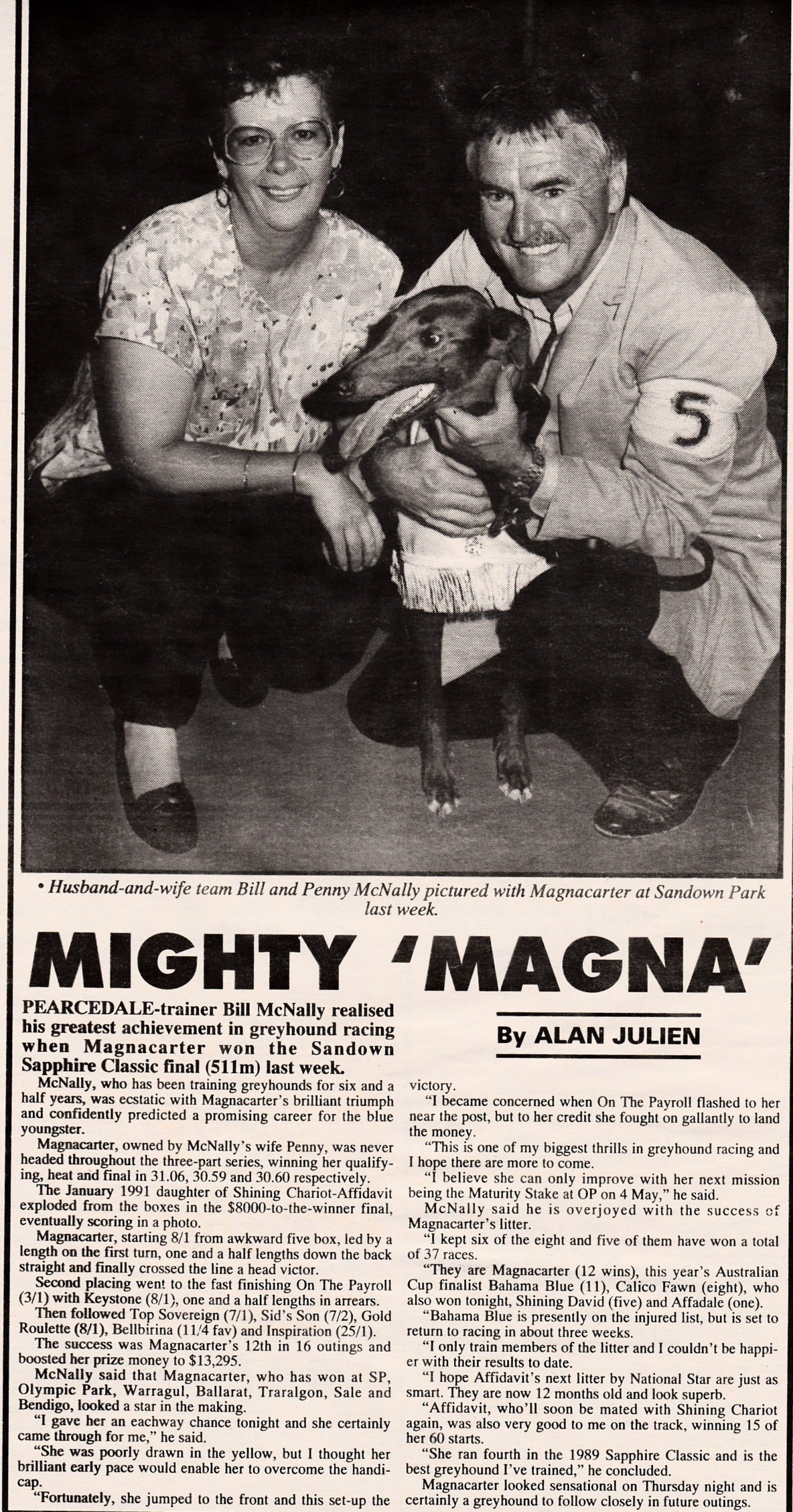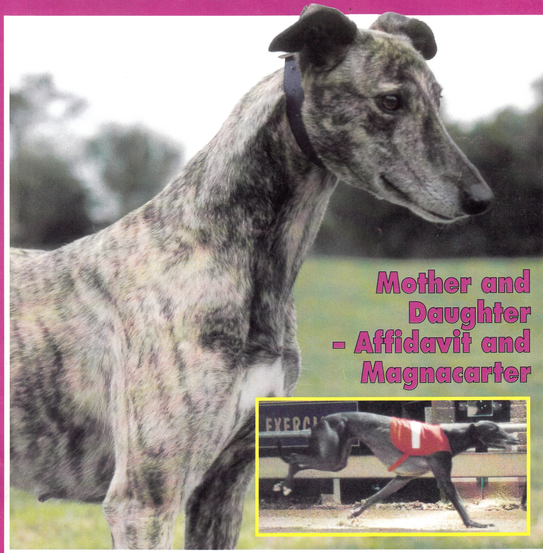 Bill and Penny McNally’s 1993 Sapphire Classic winner Magnacarter. Bred in the purple (Shining Chariot x Affidavit) 38 starts 13 wins and 8 placings $18,835. Hot field in those days it was mixed dogs and bitches. Result: SAPPHIRE CLASSIC. 511m APR 22, 1993. SANDOWN GRC. SANDOWN PARK. First Prize $8,000 Second $2,500 Third $1,200. Winner: MAGNACARTER 8/1 Others in finishing order: ON THE PAYROLL 3/1, KEYSTONE 8/1, TOP SOVEREIGN 7/1, SID’S SON 7/2, GOLD ROULETTE 8/1, BELLBIRINA 11/4F, INSPIRATION 25/1. Margin: 0.1 x 1.5. Time: 30.60. Winning Boxes 5, 7, 4. Great Pic of her dam Affidavit.