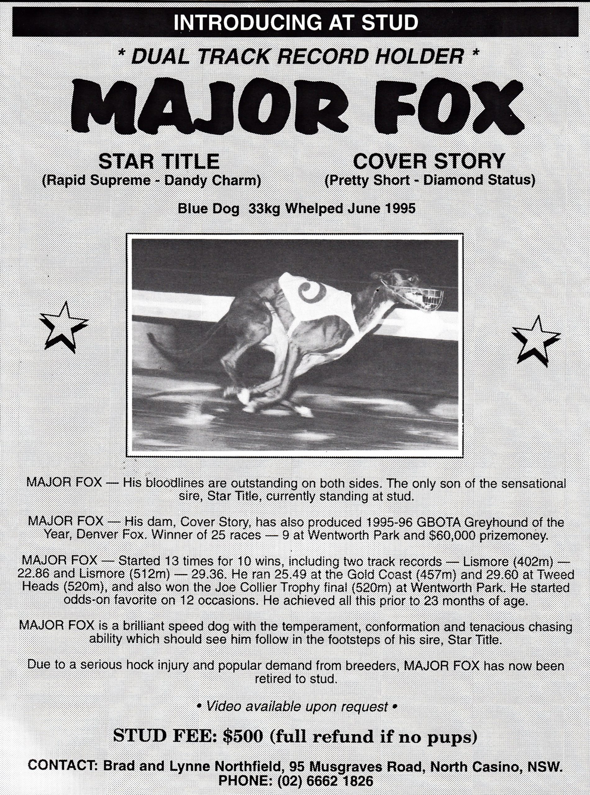 Fast dog of the middle 90’s Major Fox. Produced 141 litters for 567 offspring and limited success at stud.