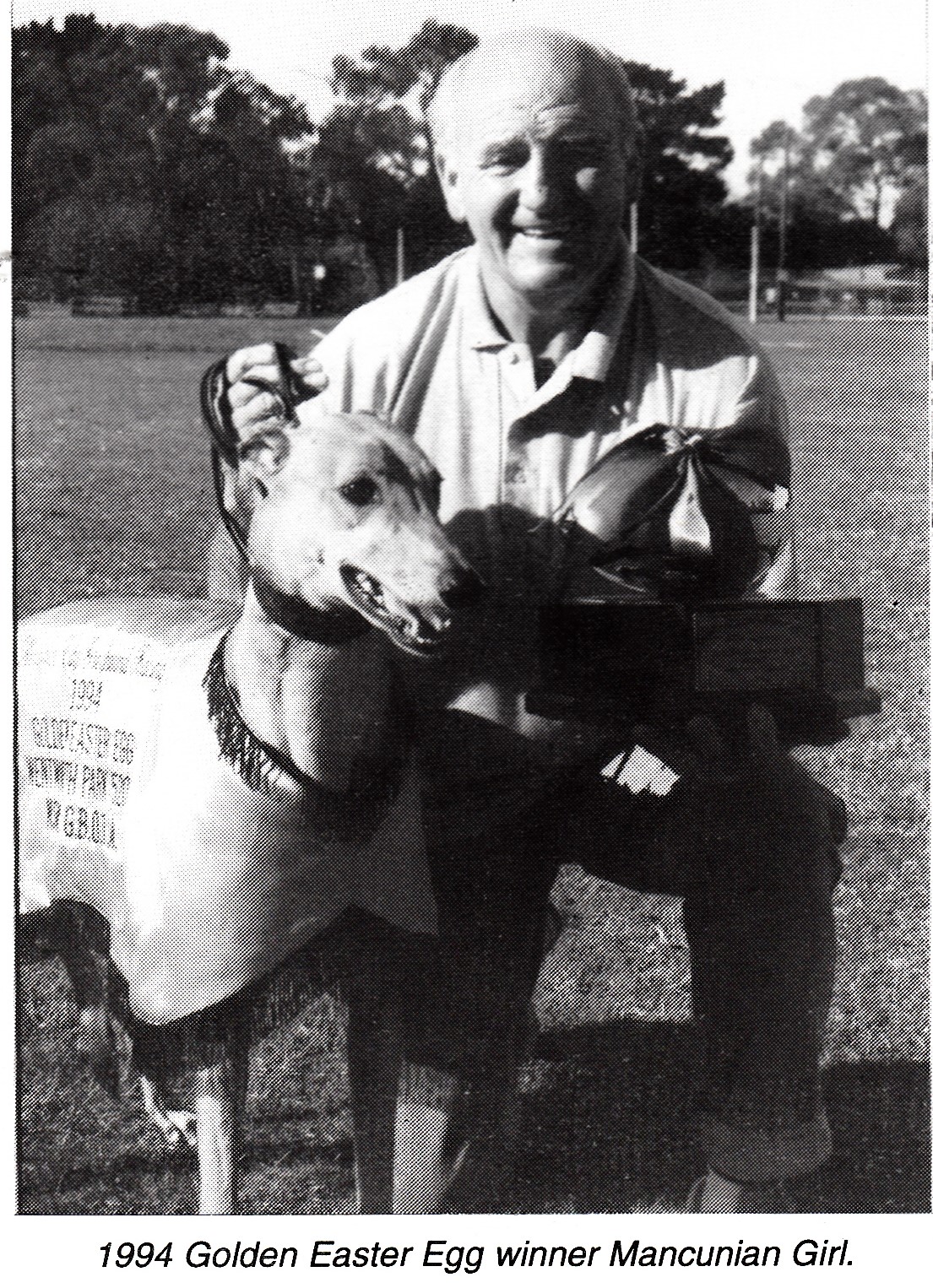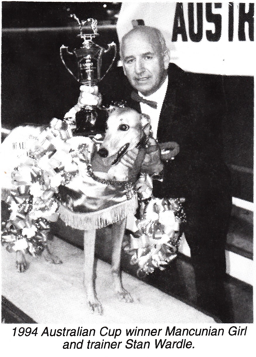 Mancunian Girl (Malawi x Raheen Star) Raheen Star was bred in the purple by National Star from Sheila’s Teresa. Whelped April 91 she had 35 starts for 19 wins and six placings won about $64,000. Won eight straight in top company including the Australian Cup and 94 Easter Egg. Top Brood Bitch produced 39 pups to Head Honcho, West Cape, World Title and Worthy Reward. Best Brookside Red, Fame and Glory, Mancunian Star and Amico Mio.