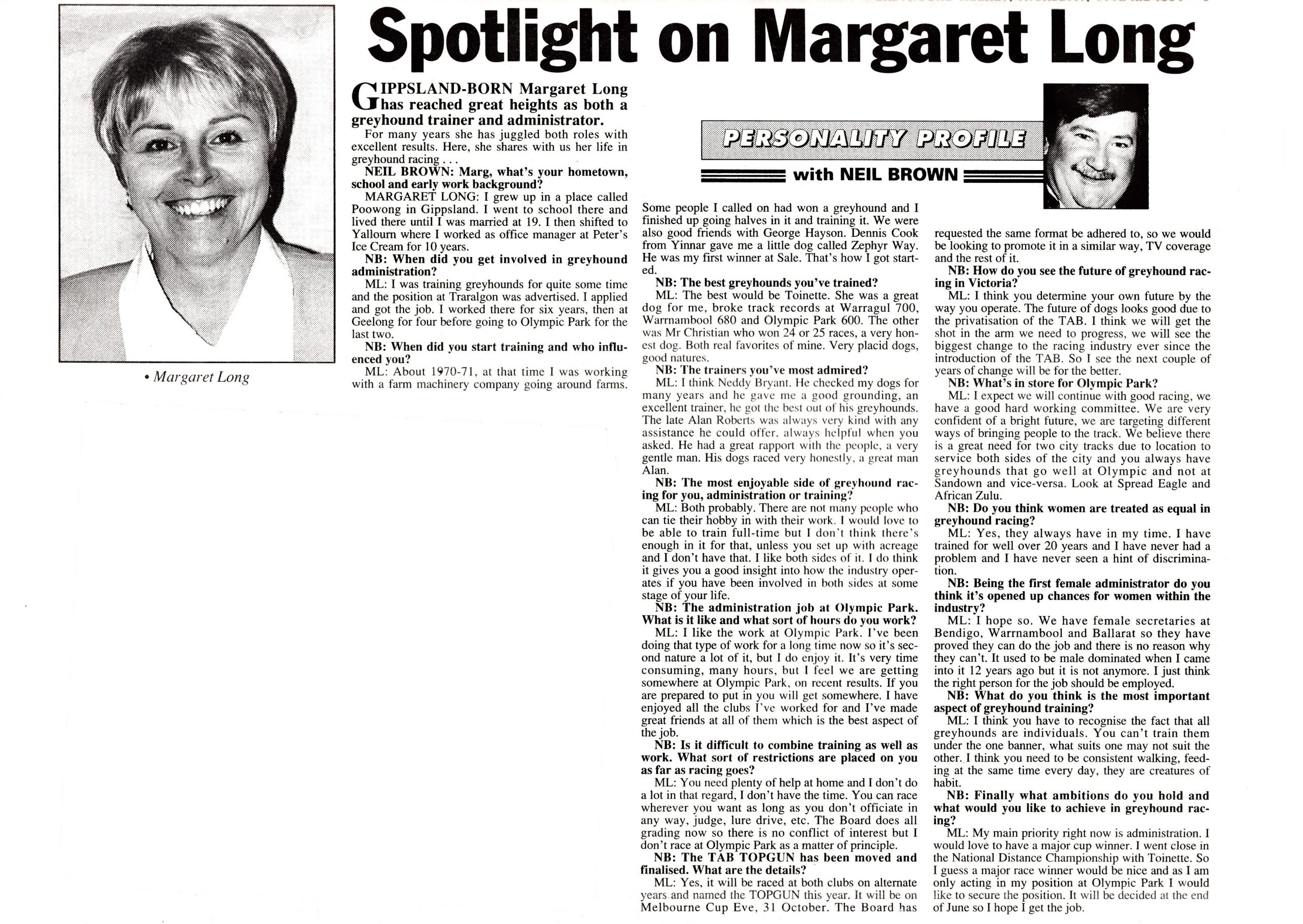 After cutting her administrative teeth at Traralgon and Geelong in the 1980s and ’90s, Marg assumed control of the Melbourne Greyhound Racing Association at a pivotal juncture in its history, overseeing the move from Olympic Park and the development of The Meadows, which opened in February 1999.