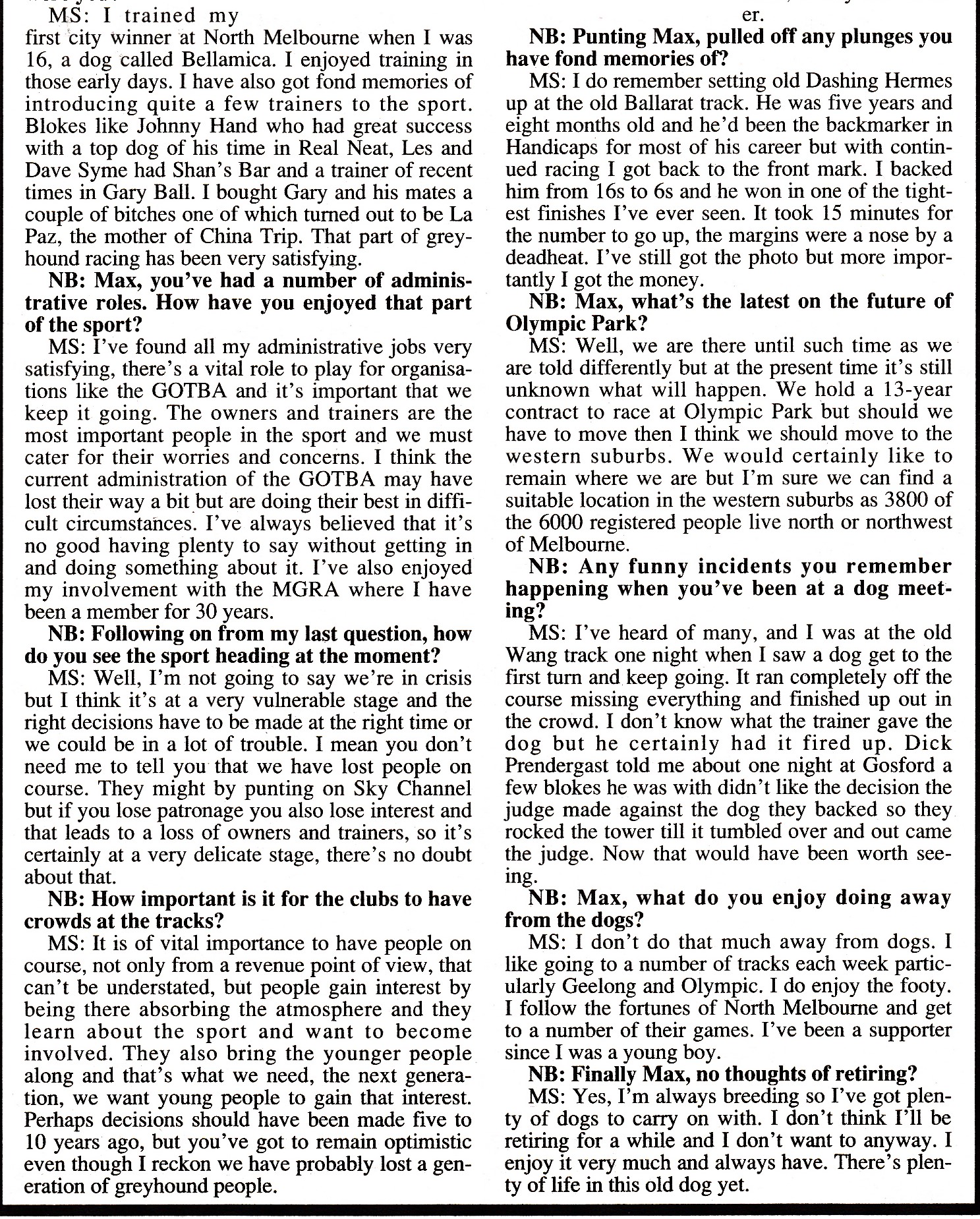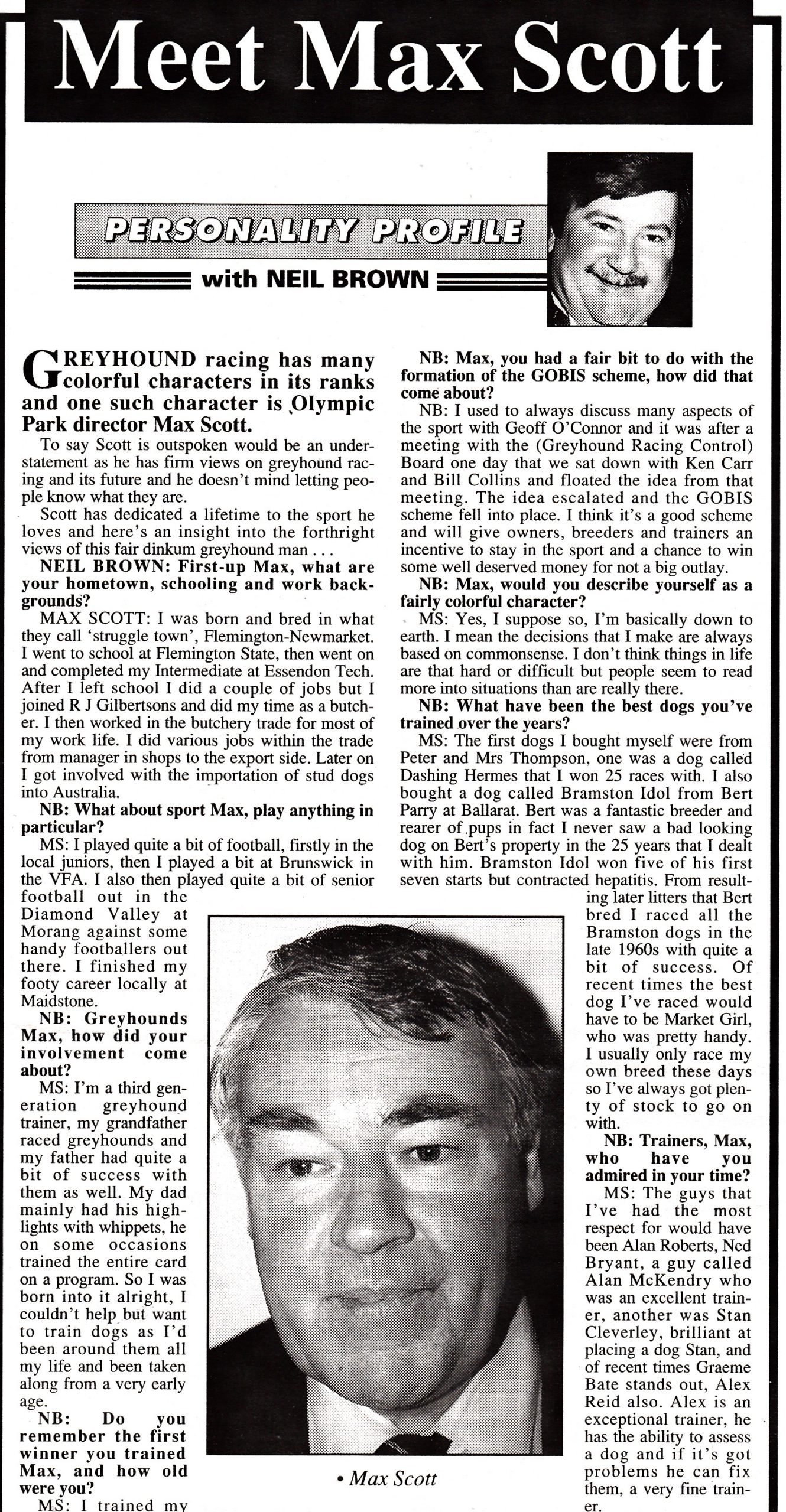 I spoke a few weeks ago about my old mate Max Scott former MGRA Director. Since then I have caught up with him on the phone. 76 these days living in the central Goldfields at Dunolly where the Welcome Stranger Gold Nugget was found in February 1869. He is keeping okay and remembered his active days in Greyhound racing with great clarity. Here’s a Personality profile I did with him in 1995.