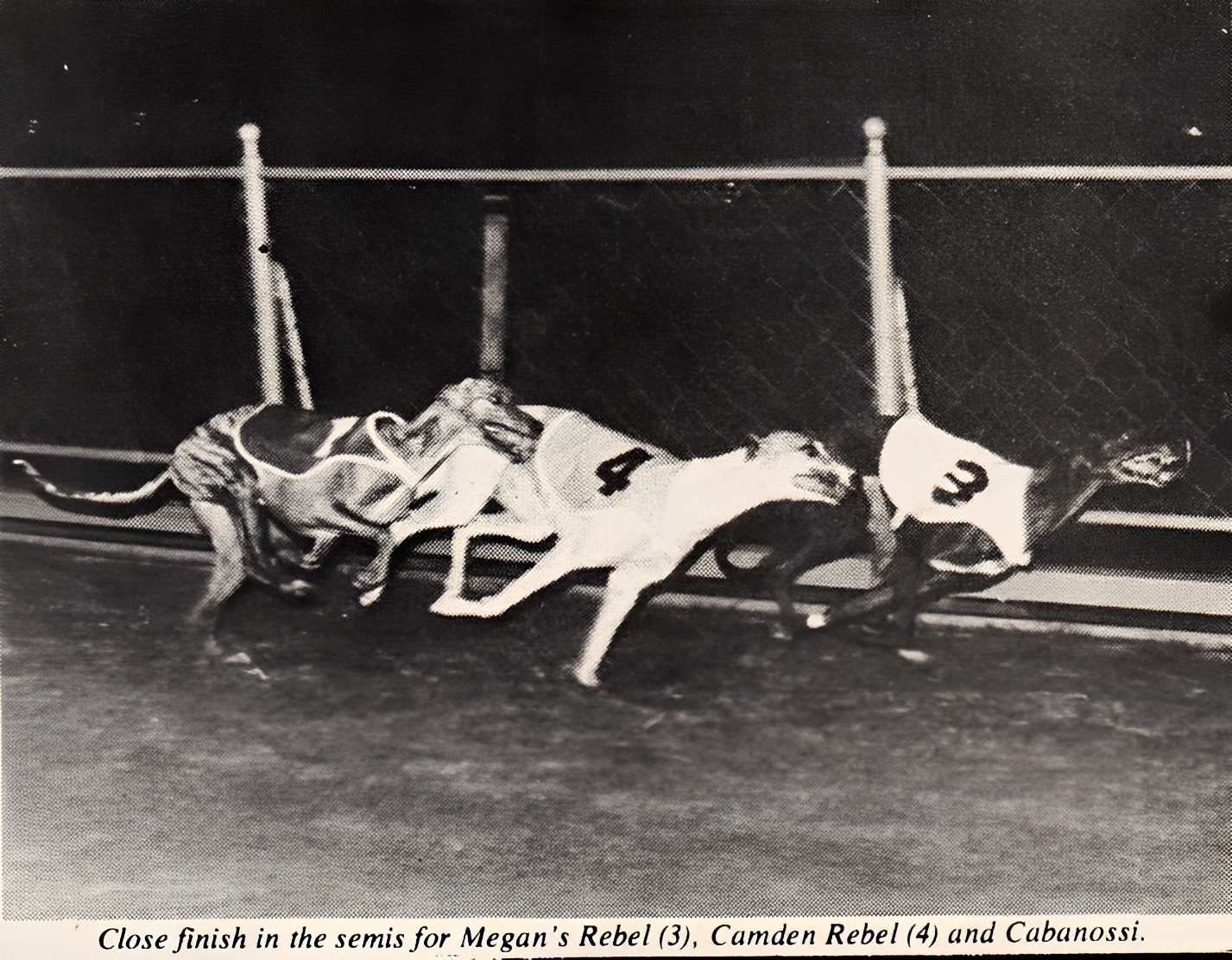 Rex Nairn asked if I could find anything on Megan’s Rebel, she won the 1976 Christmas Gift at Harold Park for three wins in a row. This included the McCallams Whisky Trophy at Dapto beating Woolly Wong by 7 lengths in track record time of 43.40 for the 722m. She won the heat and final of Christmas Gift and then an Invitation at Harold Park. After those four wins I guess she could have been classed as the best stayer in NSW. From 50 starts she won 20 with 17 seconds and 3 thirds, with 17 starts at Harold Park for 7 wins 4 seconds 1 third, best time 43.37for 732 metres. She won $13, 160 in her career. She certainly was a star of her time as Rex explained above. I found this photo of her winning a heat of the Summer Cup.