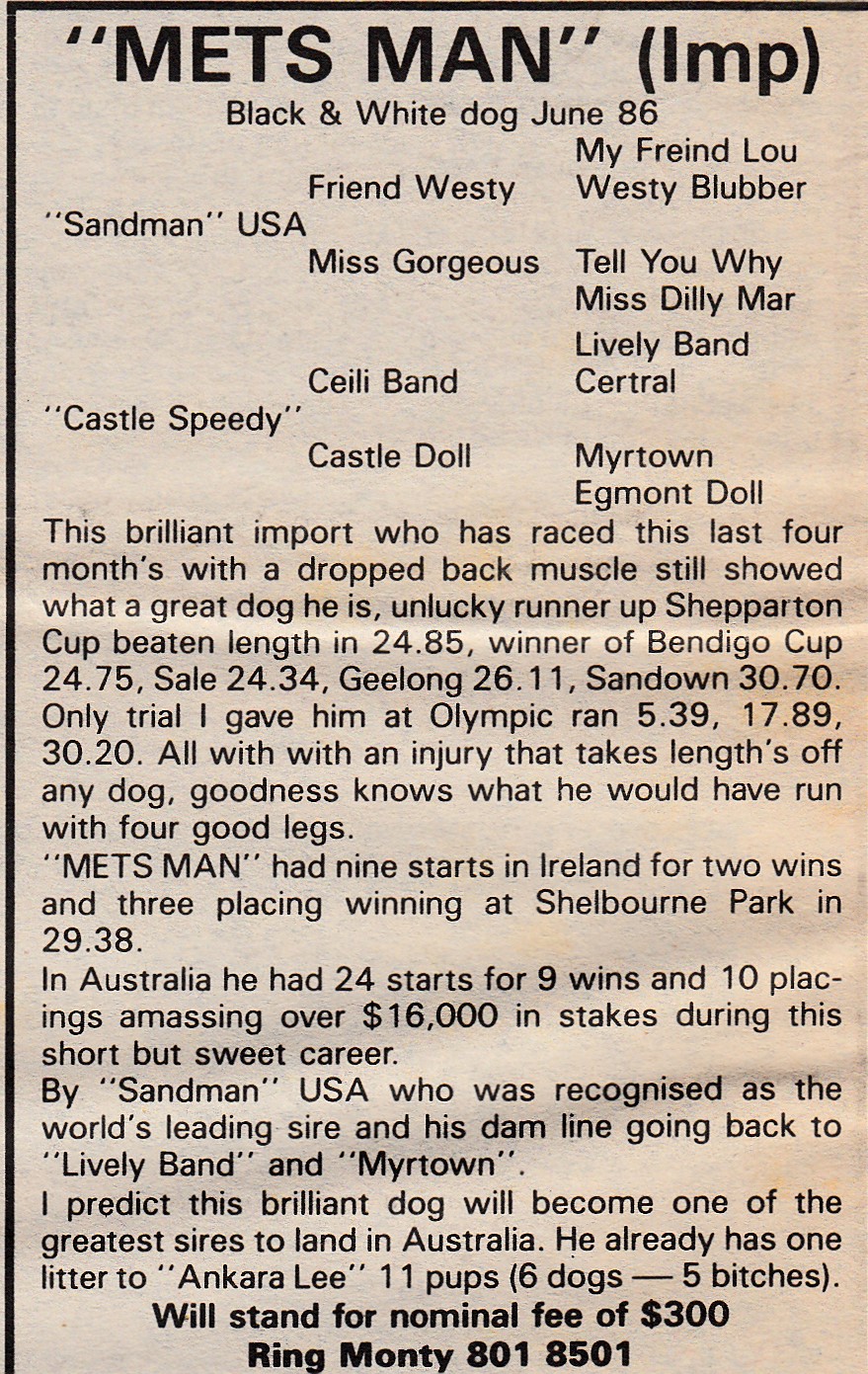 Smart sprinter of the late 80’s Met’s Man with outstanding mentor Monty Tomblin and Bendigo President Barry Hiscock after he won the 89 Cup. Won in two countries back in Ireland before coming over here.