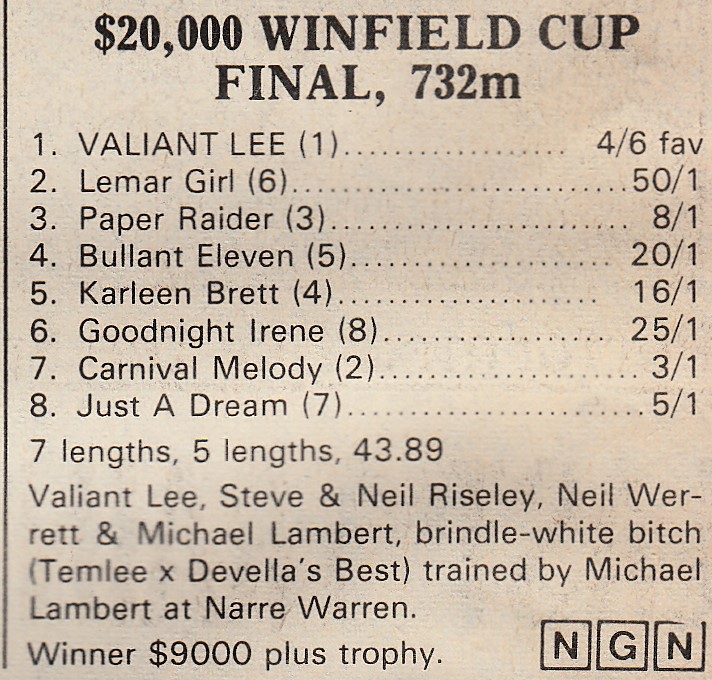 Mick Lambert with Valiant Lee. Good bloke Mick played Cricket against him in the local comp. From memory and I stand corrected if wrong I think Mick used to work the bag for a bookie at one stage. Had some nice dogs over the years his late father Beau was a top footballer for my club Springvale in the 60’s. I think one of the part owners of Valiant Lee was prominent horse racing identity another local Neil Werrett.