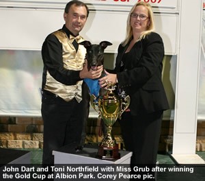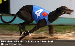 Ben Duclos asked for some info on high class stayer Miss Grub a Black Bitch – November 2003 Solve The Puzzle from Arenia Miss. She raced 89 times for 24 wins and 40 placings, with prizemoney of $253,060. Raced and bred by Charlie Northfield and trained by John & Glenda Dart in Queensland and Kelvin Greenough when in Victoria. She won the 2007 Group 1 Albion Park Gold Cup, Group 2 Maidment Memorial, Group 2 Zoom Top, Group 2 McKenna Memorial, Group 3 West End Distance Championship. Finalist: Group 1 Gleeson & Tonta (3rd), Group 1 Perth Galaxy (5th), Group 1 National Distance Championship (4th) Group 3 Easter Chase (3rd) Group 2 Sydney Cup (2nd) Group 1 2006 Albion Park Gold Cup (3rd). For her many last to first wins she also won a number of AGRA Runs of the Month and took out the Run of the Year in 2007.