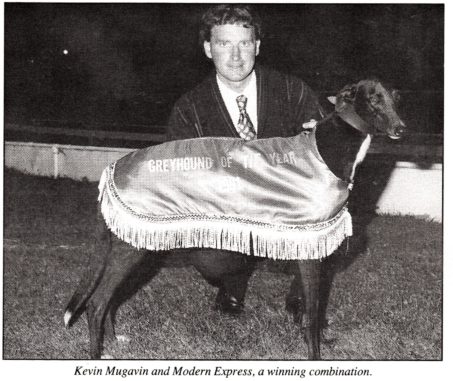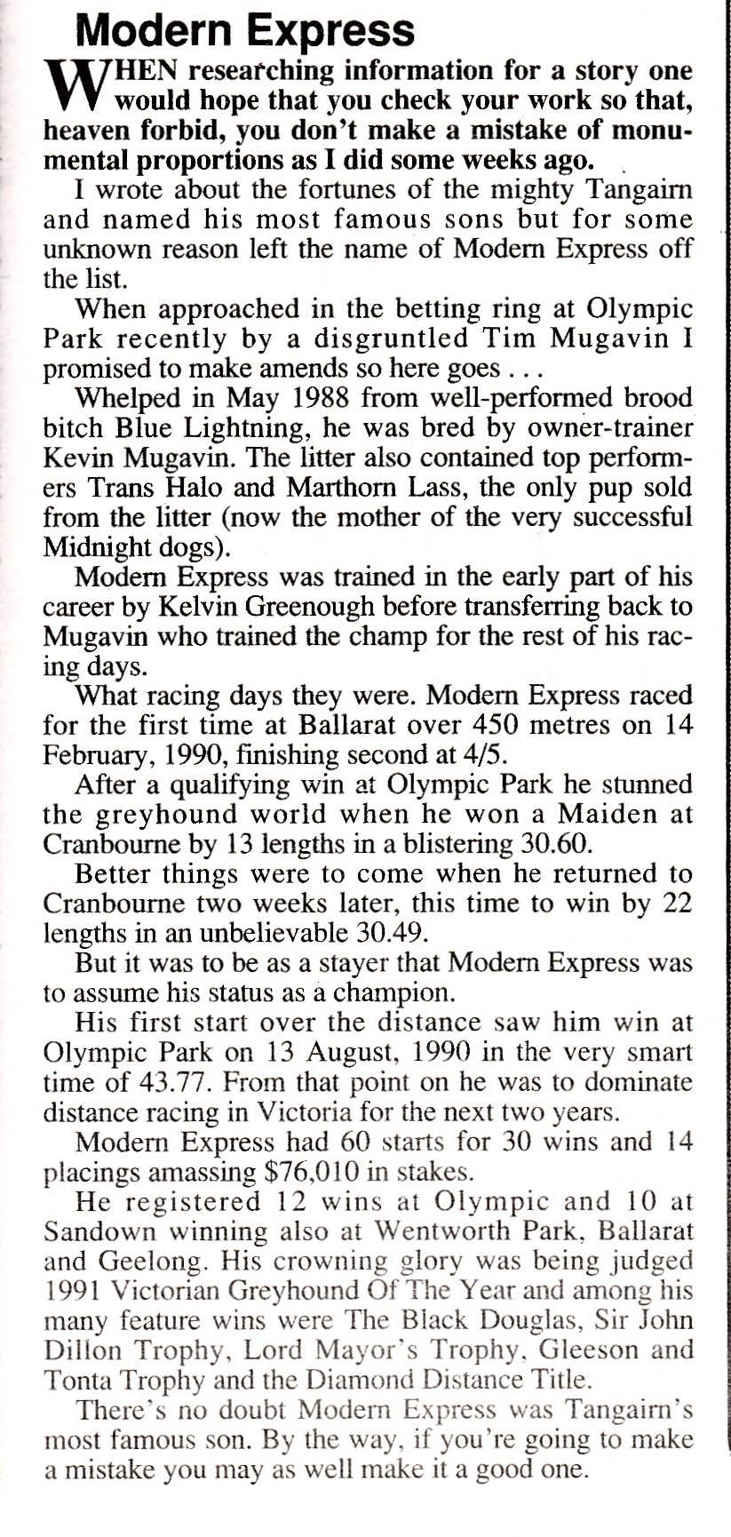 Perhaps Tangairn’s best son 1991 Victorian Greyhound of the Year Modern Express. Owned and trained for most part of his career by Kevin Mugavin. No stranger to an above average performer. Another great bloke from the Western District. Won in the city 23 times several feature events. This piece I wrote in the Weekly in 1996 after making a mistake.
