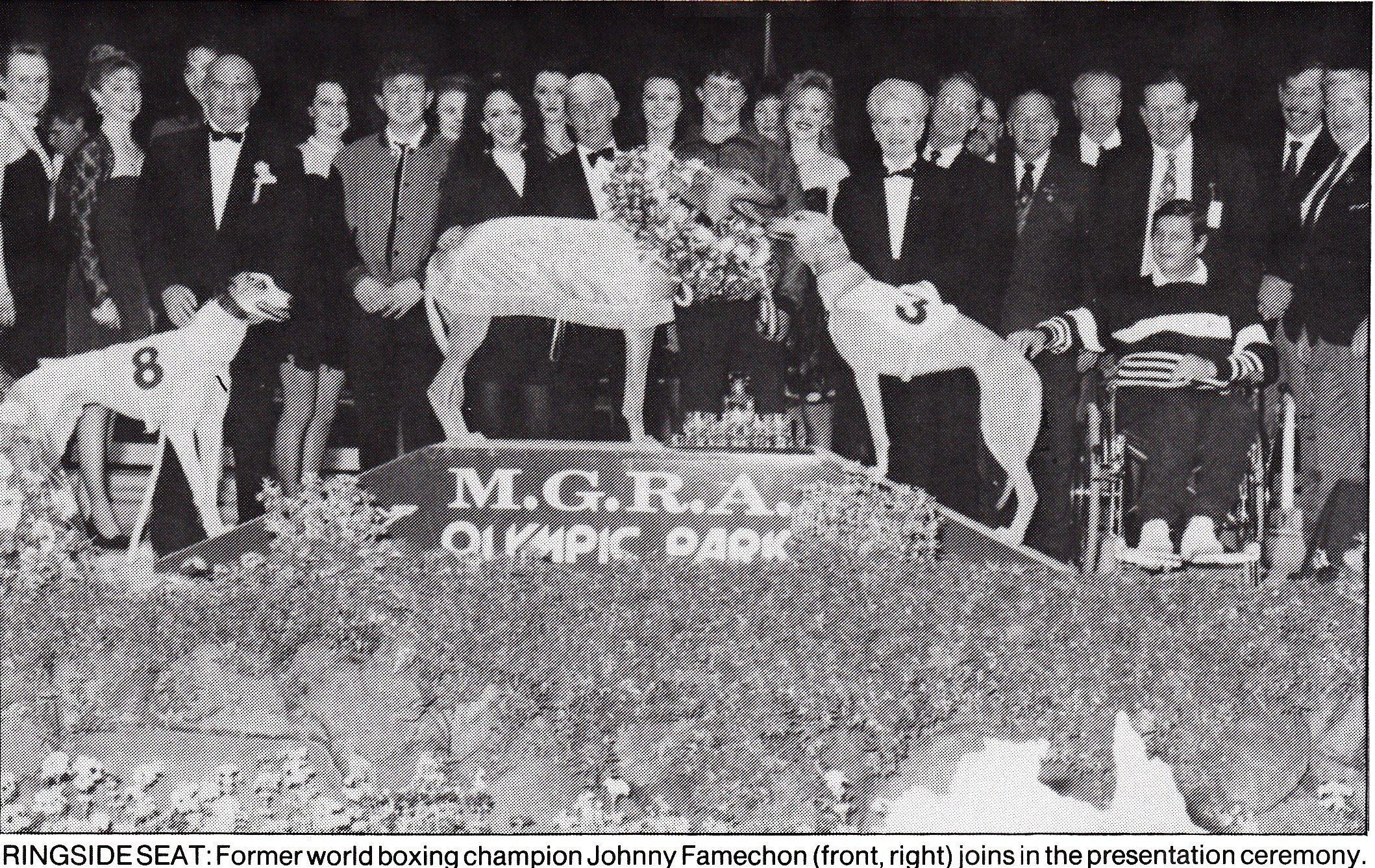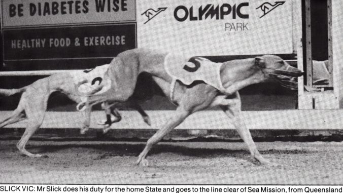 Here is a couple of pics remembering the 1992 National Sprint Champ Mr. Slick. Handy dog by Rossberg from Lindy Sofia he had 46 starts for 17 wins and 10 Placings. Held at Olympic Park where he won six. He Beat Sea Mission, Major Fleet and Iceni Princess was fourth in the final starting at $7 and recording 30.02. He was raced and trained by John Gould. I recall the night, well guest of honour was the late great Johnny Famechon. Mr Slick also won at Shepparton, Wentworth, Bendigo, Geelong and Wentworth Park.
