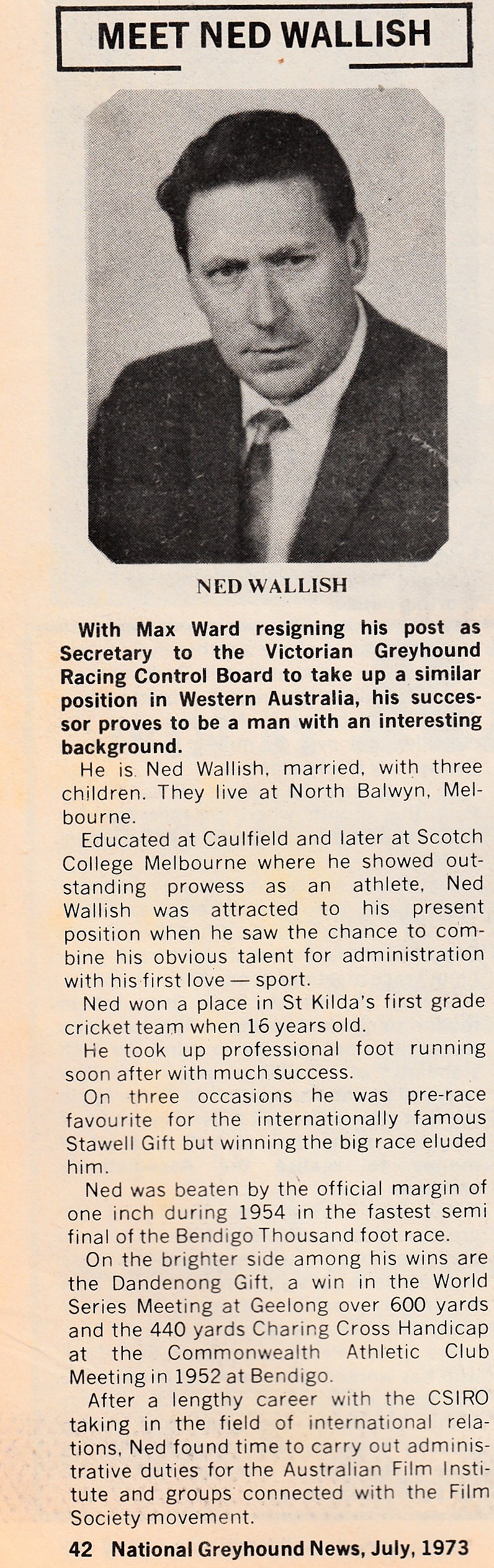 Former GRCB boss Ned Wallish here is a bit about him. I didn’t know Ned but he delivered the best eulogy I have ever heard in my life when he honoured the great Noel Banks at Noel’s home in Cranbourne. The late Ron Nestor told me it would be special.