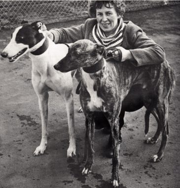 Irish trainer Mrs Minnie Morrow with the Irish wonder dog Newdown Heather on the left. Winner 1964 Puppy Cup at Dunmore (435 yds), 1966 Ulster Cup at Ballymena (coursing). The Daddy Of Them All. 1562 offspring. His pedigree can be found world-wide in all the top stud dogs including Brett Lee and Bombastic Shiraz. The other dog is Dillies Pigalle National track record holder for 525 yards.