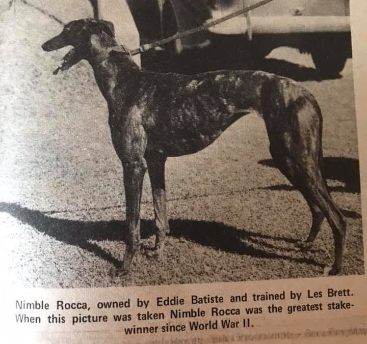 Champion race dog and dam of the 40’s Nimble Rocca. Whelped May 1941 a Brindle and White bitch by Roccabright from Nimble Sally. Raced by Eddie Batiste and trained by Les Brett. 33 wins and 30 placings. Held both the Sprint and Distance Record at Harold Park. Dam of super producer Dream’s Image. Pics https://www.facebook.com/GreyhoundRacingHistory/photos/
