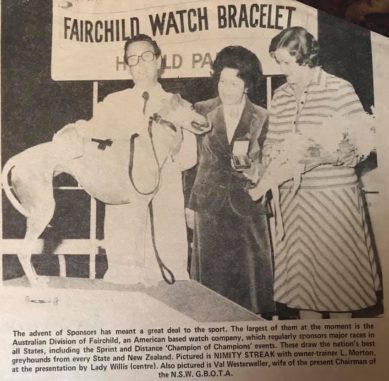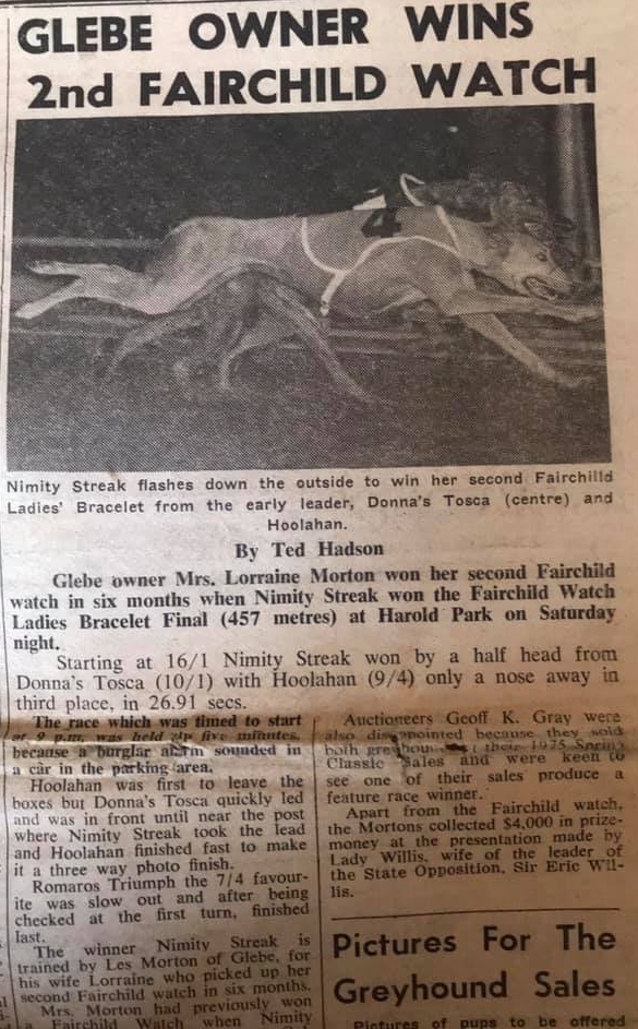 Winner of the 1977 Ladies Bracelet Nimity Streak a fawn bitch bred by the Wheelers she was Whelped Nov 74 by Nimrod Boy (Millers Moss x Gail’s Beauty) from Jen’s Streak. The feature was held at Harold Park over 457 she started 16/1 winning by a half head in 26.91. Her breeding went back to Nimble Rocca through Dream’s Image. Pics https://www.facebook.com/GreyhoundRacingHistory/photos/
