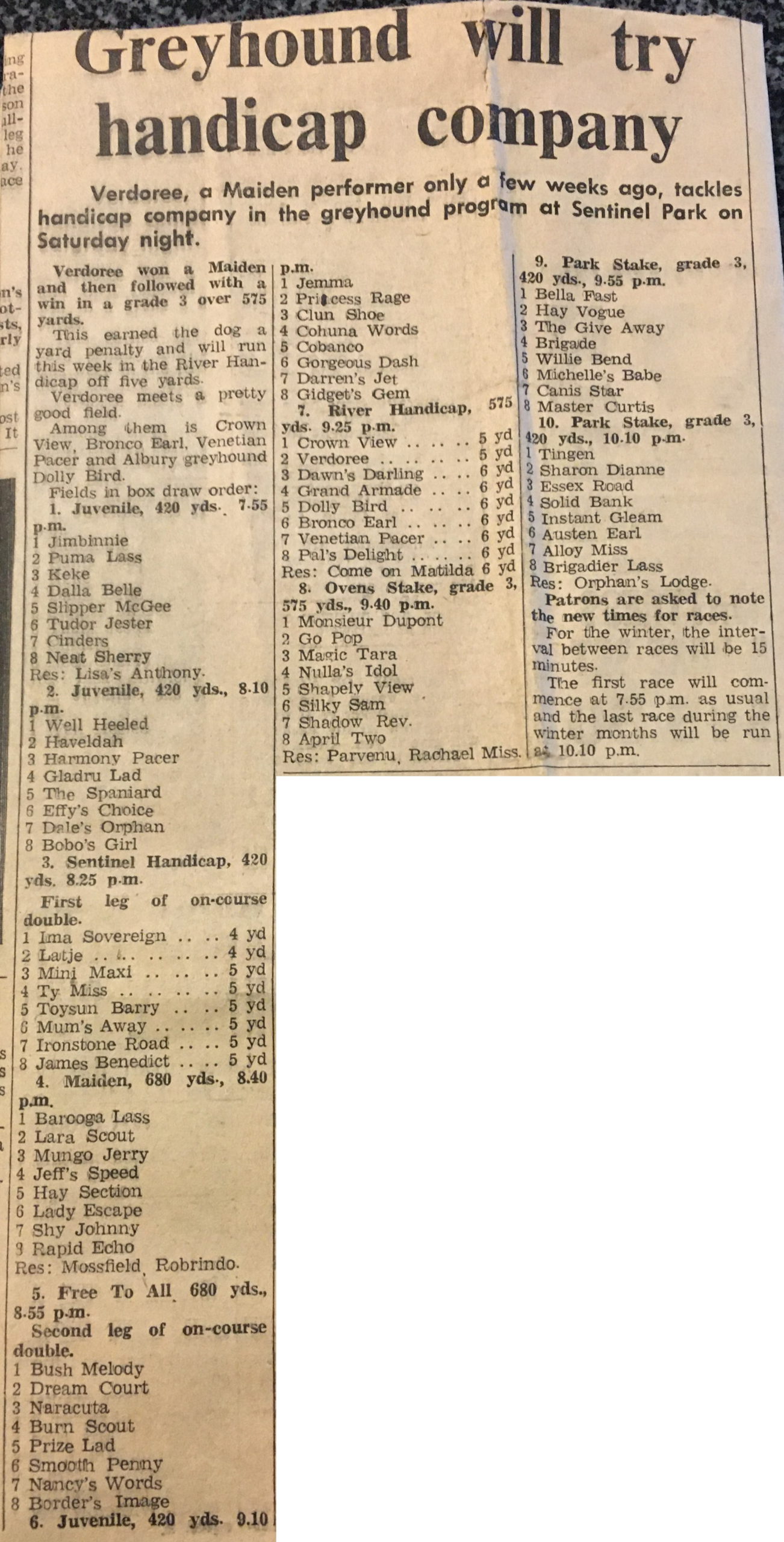 Been looking for some pics for over a year of the old Wangaratta track Gary Smith made the request. Now I don’t know what the name of the dog is but it is 1970 and it looks to me like it’s the Wang Cup. My records tell me the 1970 Wang Cup over 575 yards was won by Cool Comfort in 30.14/16ths for Bendigo trainer Syd Hall. I might be mistaken but it also looks like Raymore J Millard was a special guest. The colour shot is what it looks like today. Also there is no doubt the shot of Lizrene I questioned is of her winning at the old Wang Track.