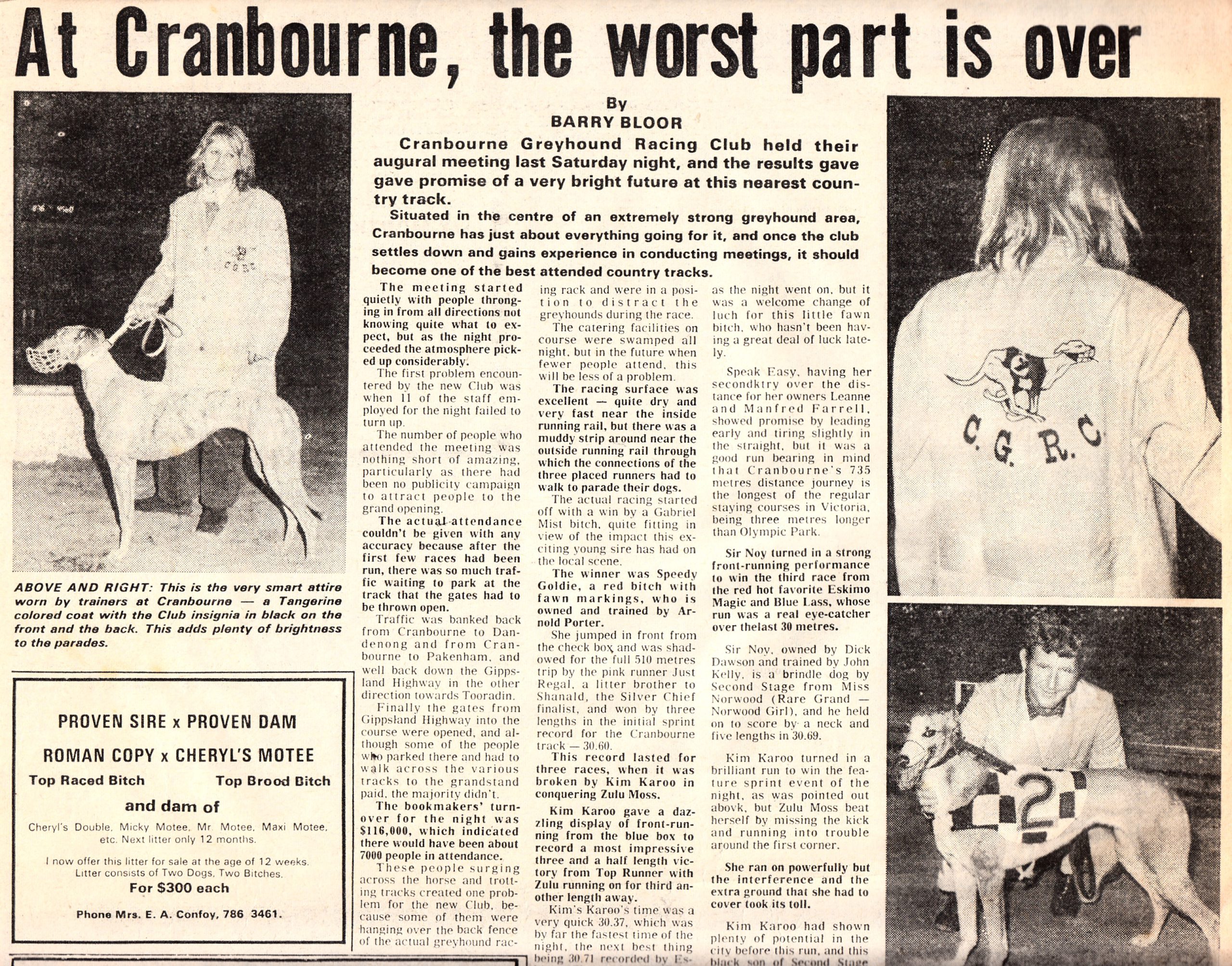 Today is the 50th anniversary of the opening night of the Cranbourne Greyhound Racing Club. What a night it was 7000 people in attendance. Ron Hawkswell in the commentary box his late brother Allan next door in the Judges Box. I remember the night fondly the much-anticipated opening went like clockwork and everyone who attended had a great night. The first race was won by city-class sprinter Speedy Goldie trained by the late Arnold Porter who put the polish on the Hall of Fame hurdler Odearo. Cranbourne thrived for many years to come, and I like many was a regular on Saturday nights. My greatest highlight was making the 1988 Cranbourne Cup. Couldn’t win it but what a thrill to be in it with the who’s who of trainers. Sadly, the track sits in limbo at the moment but we can be optimistic that a return to racing is possible. Long live Craney.