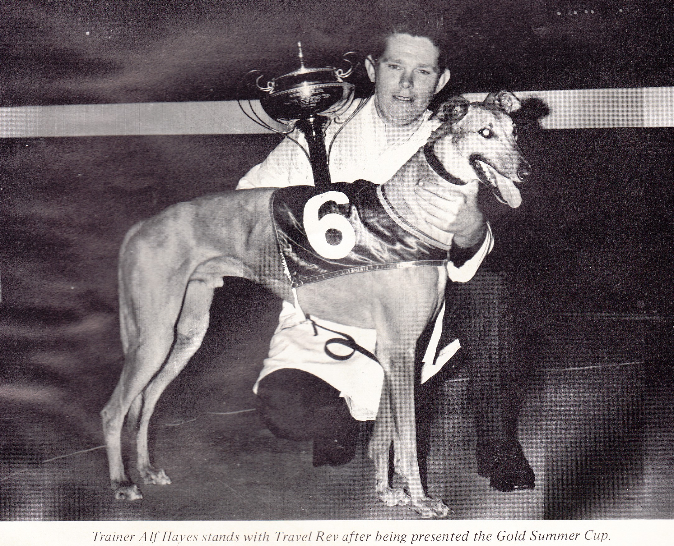 Jeff Collerson – Alfie Hayes, his trainer pictured here, passed away only a few months ago. Travel Rev was without doubt the best Harold Park 800 yards dog I have seen and I think most keen racegoers would agree he was the tops. He was so dominant they began constructing handicap boxes for his rivals but they weren’t used as Travel Rev was retired.