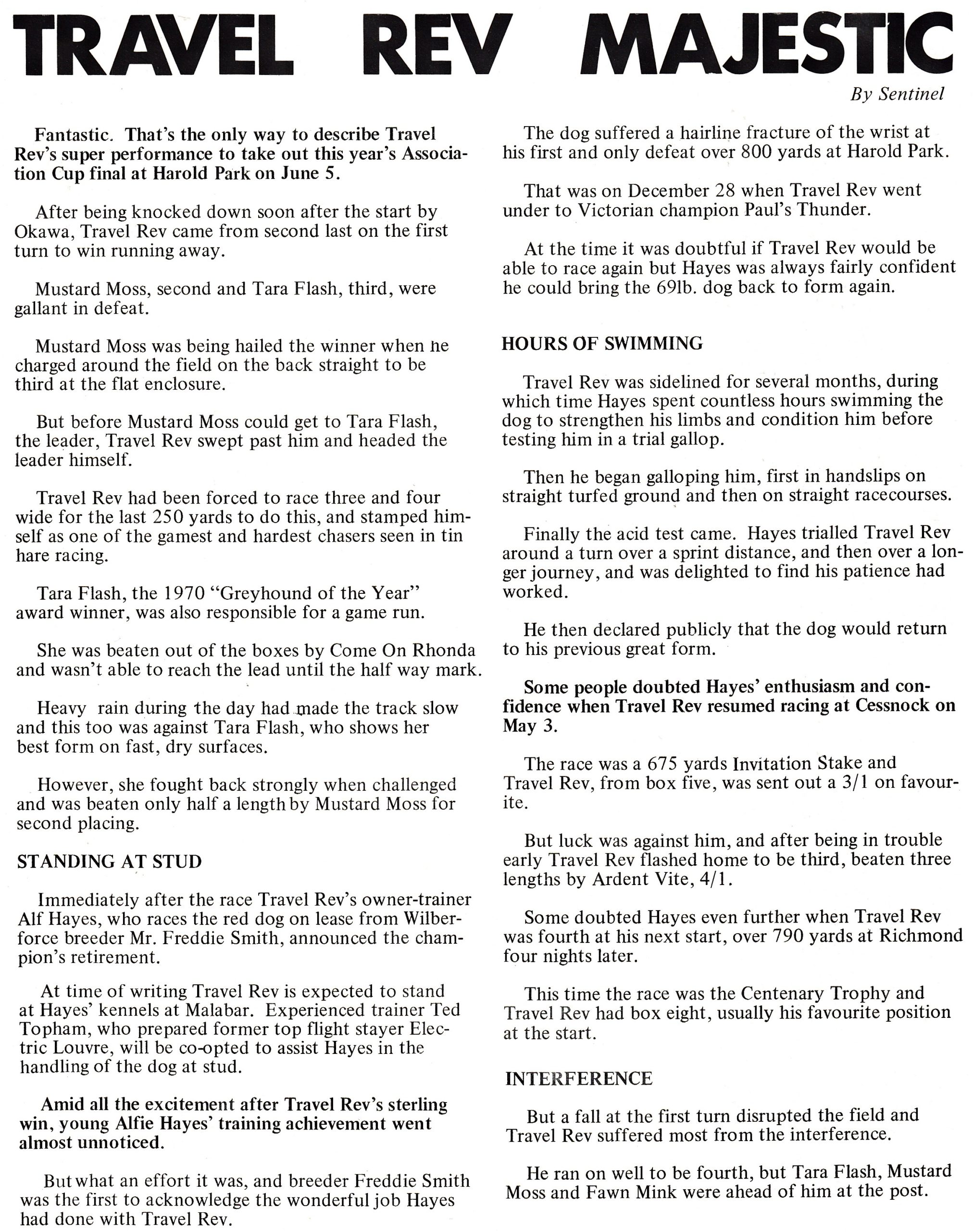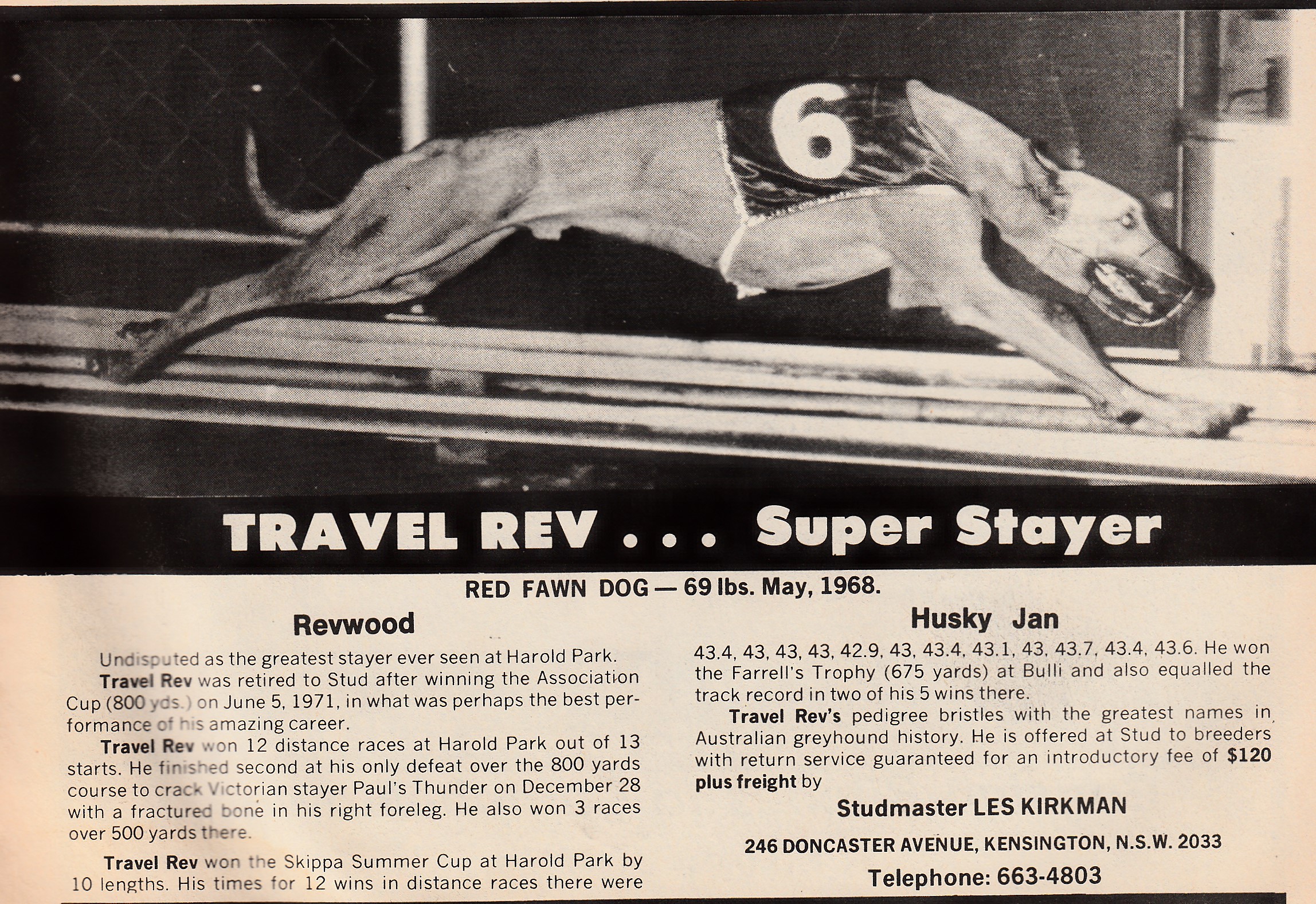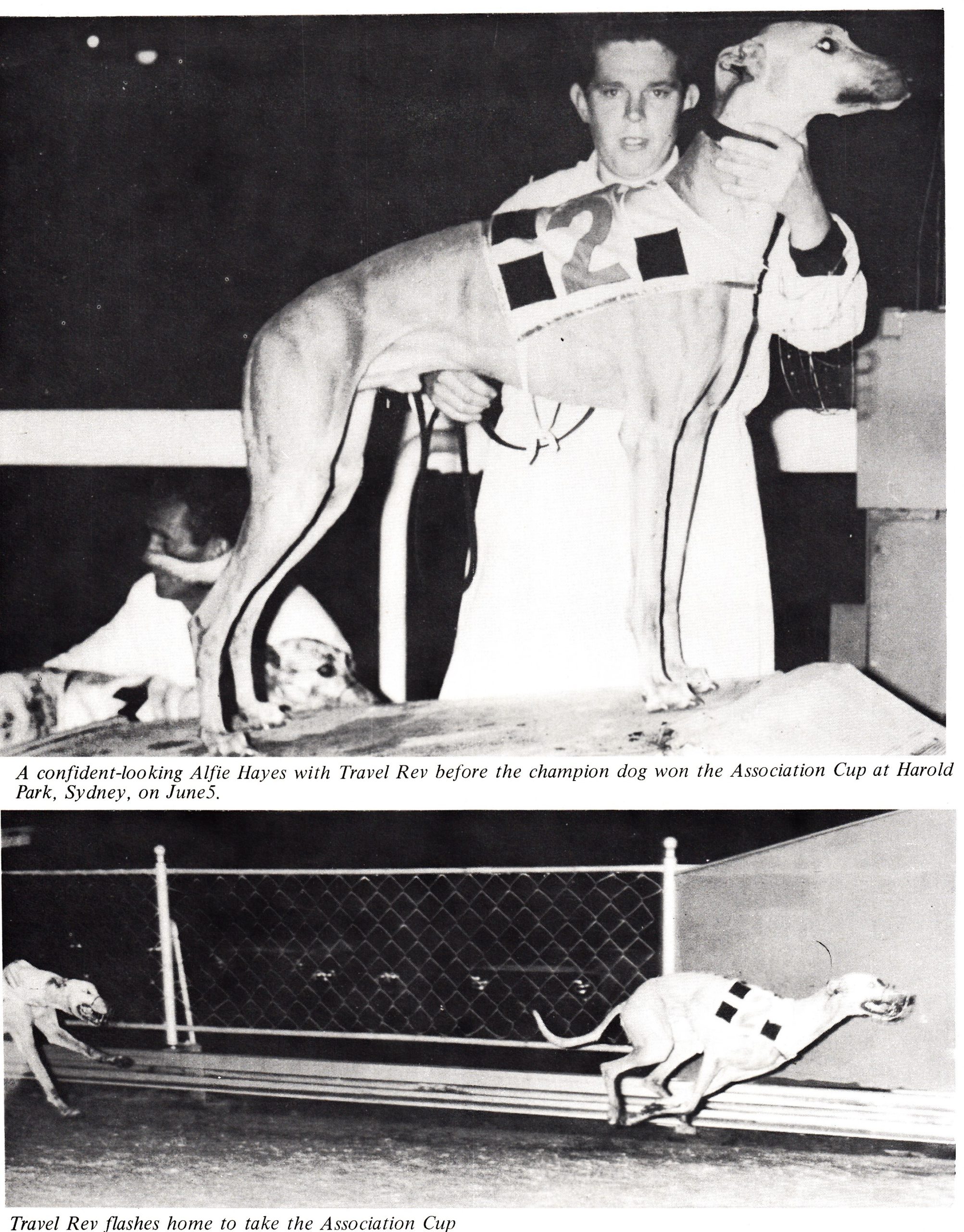 Jeff Collerson – Alfie Hayes, his trainer pictured here, passed away only a few months ago. Travel Rev was without doubt the best Harold Park 800 yards dog I have seen and I think most keen racegoers would agree he was the tops. He was so dominant they began constructing handicap boxes for his rivals but they weren’t used as Travel Rev was retired.