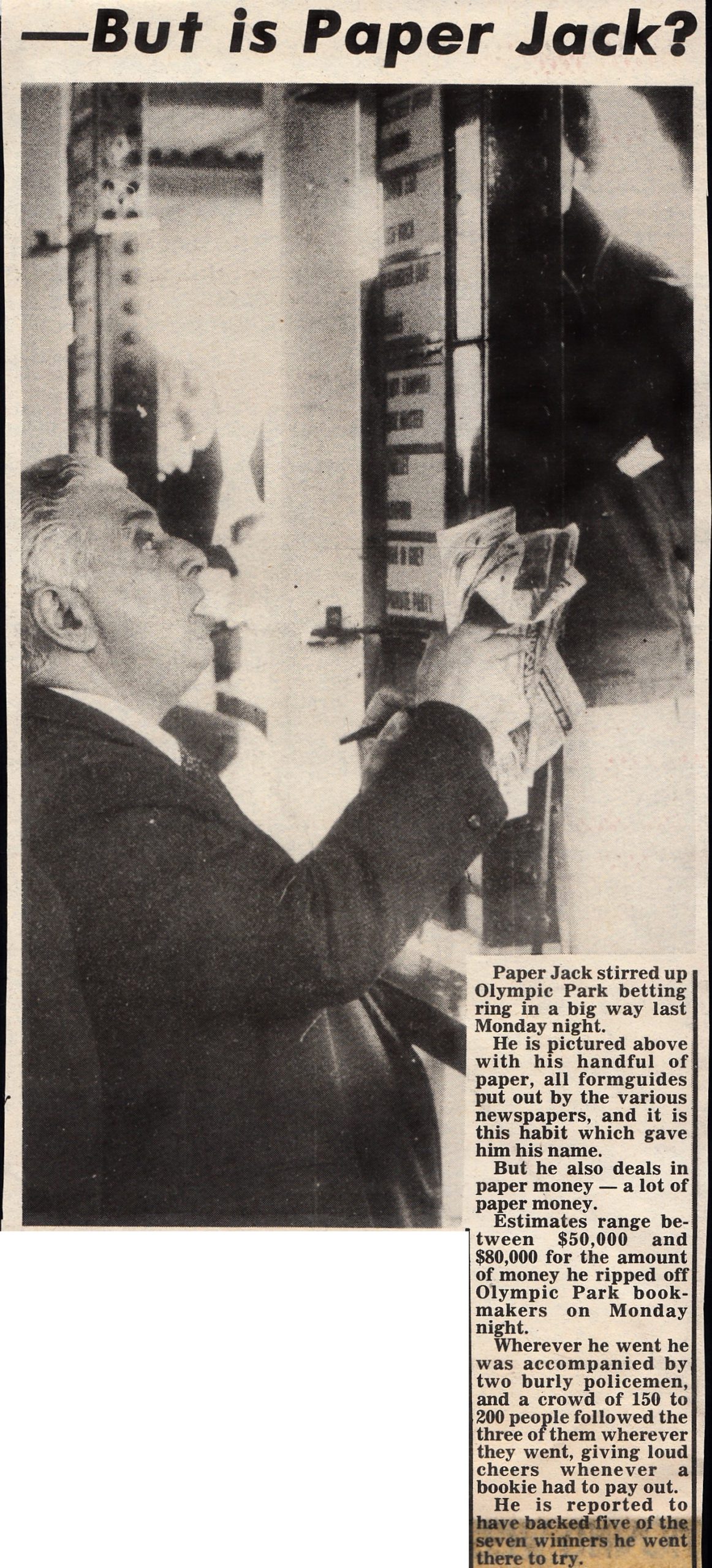 Does any of the old timers remember punter Paper Jack seems he had a big night at Olympic Park back in the 70’s. He backed five winners of the seven he fancied and had a police escort wherever he went on the night in question. The punters 150 to 200 people who follow the party around cheered every time he was paid out by a bookie. Fun and games in those days.