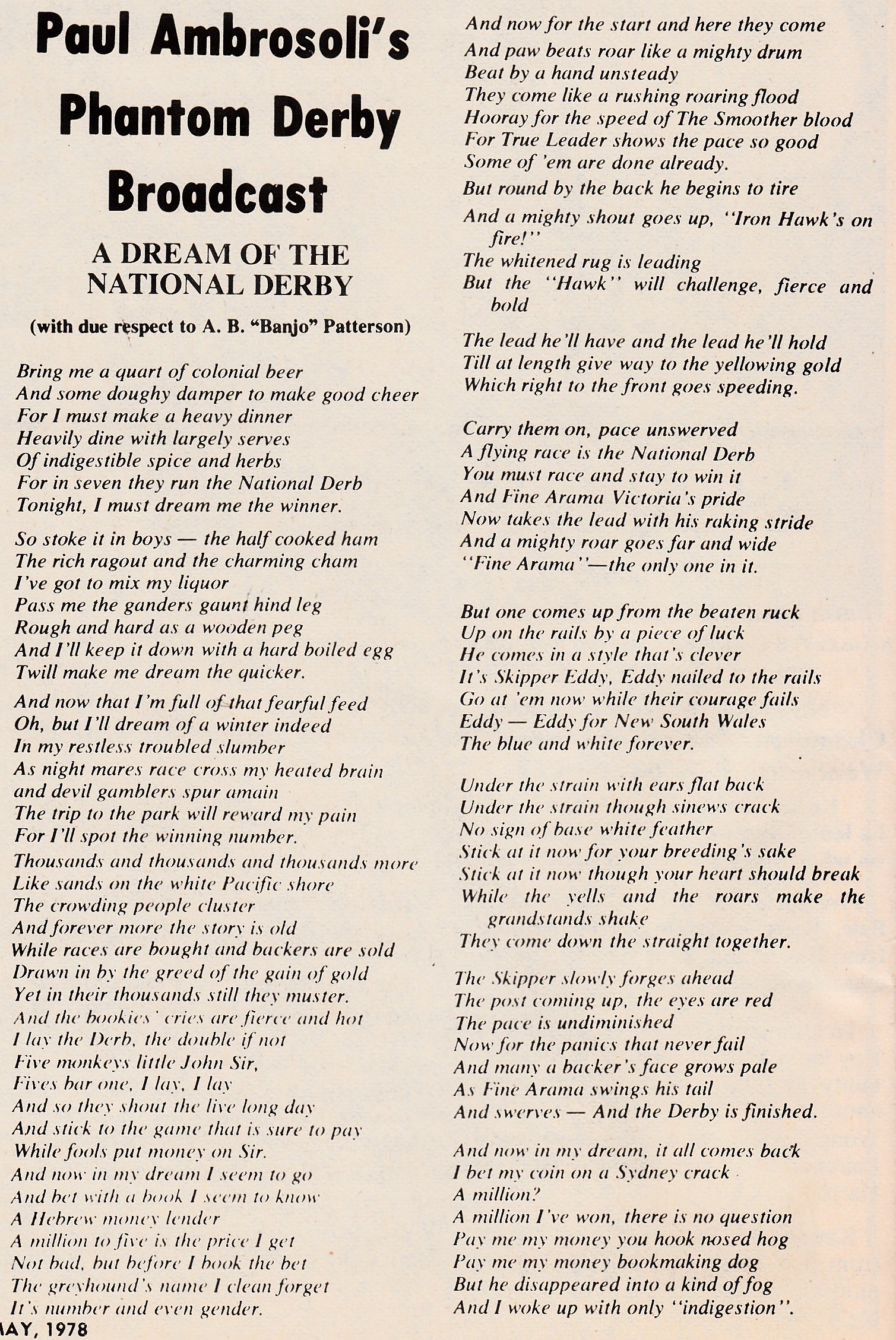 I am sure everyone connected to Greyhound Racing marvelled at the talent of New South Wales Racecaller Paul Ambrosoli. Acknowledged as the best of his craft with good reason he was also equal as any as an event Host or any number of entertaining past times he has chosen to partake of over the years. There has not being many poems penned over the years in regard to Greyhound Racing and the GBOTA struck a winner commissioning well renowned Australian Rupert McCall who wrote and performed a classic for this year’s Easter Egg. Another famious poem was written about the mighty Chief Havoc by Neville J Fisher. Here is one penned by Paul Ambrosoli in 1978, I am sure many of us have had the privilege of wittnessing it performed live by the great man himself.