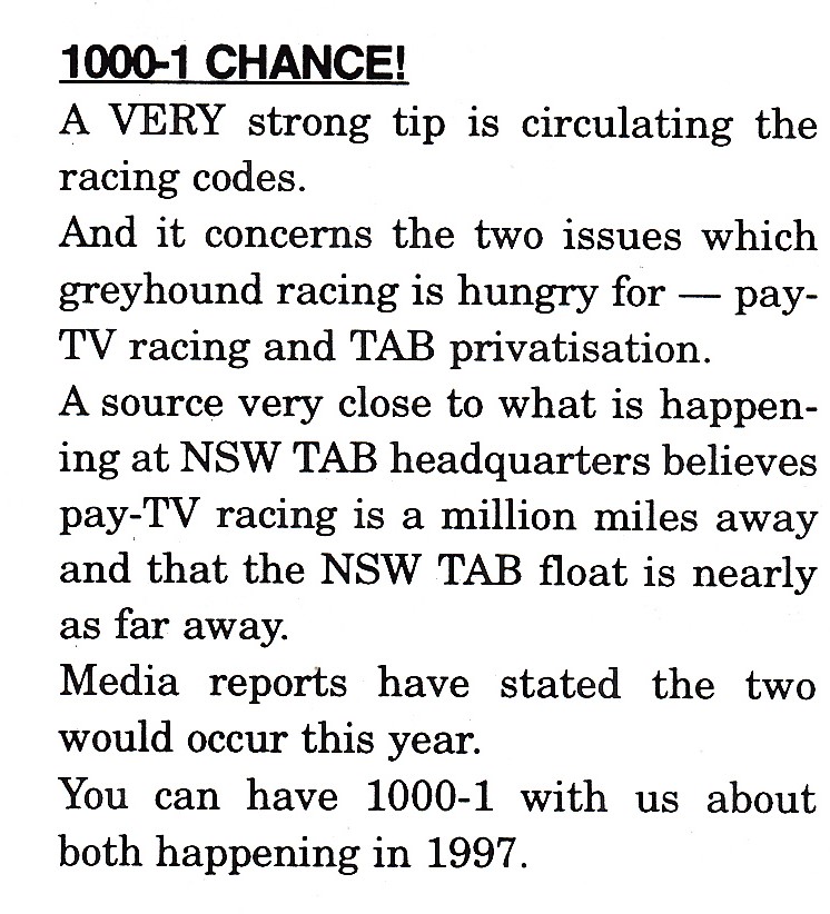Nothing like big odds about something that might happen. I like this media report back in 1995. Seems you can get it right; it certainly took its time. We got Pay-TV in August 1998. That was after Sky was purchased from Murdoch & Packer interests and the float occurred in June 1998. Not sure how the good old TAB is going these days.