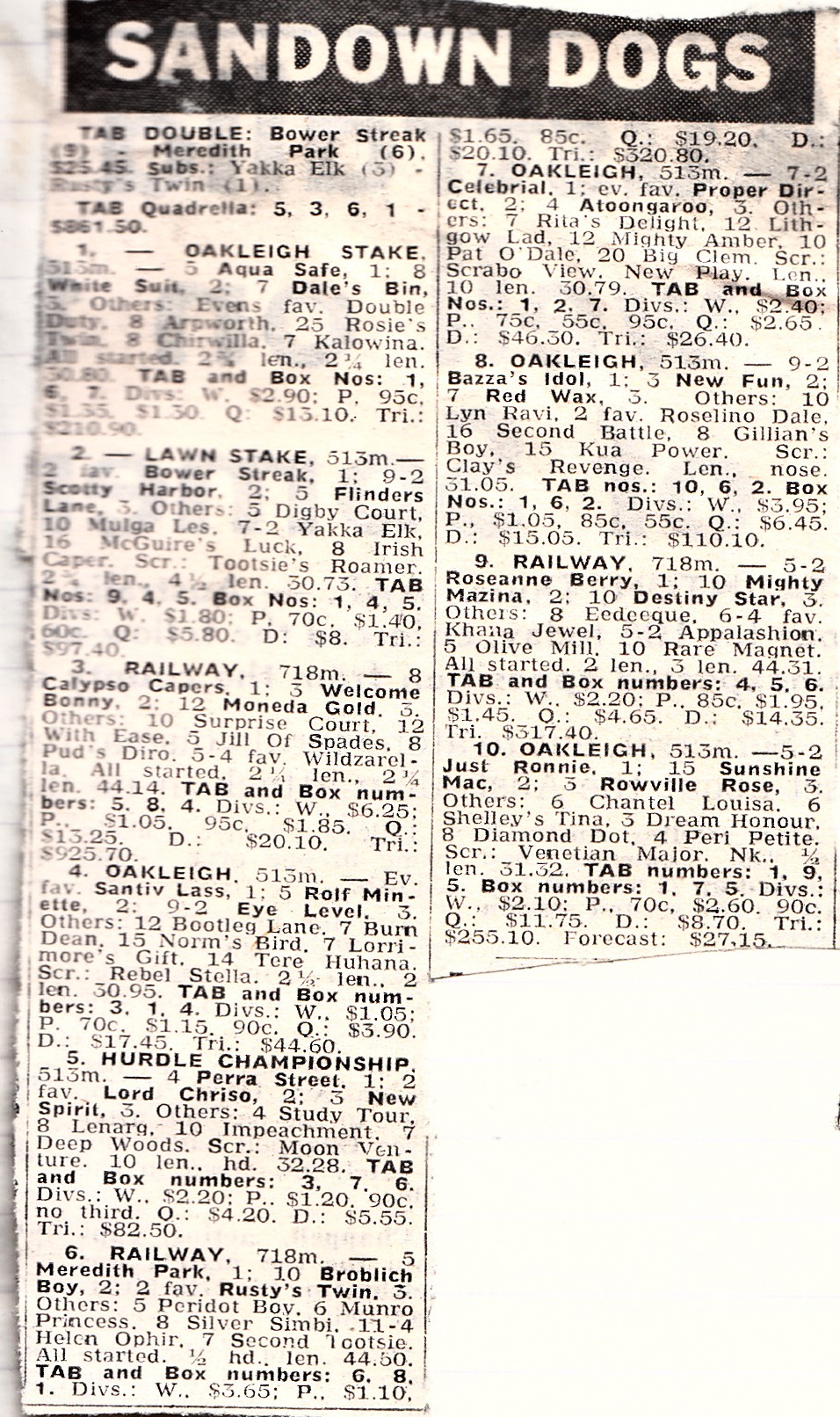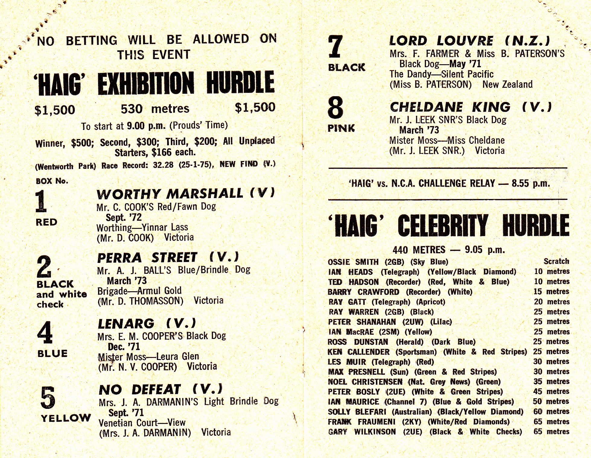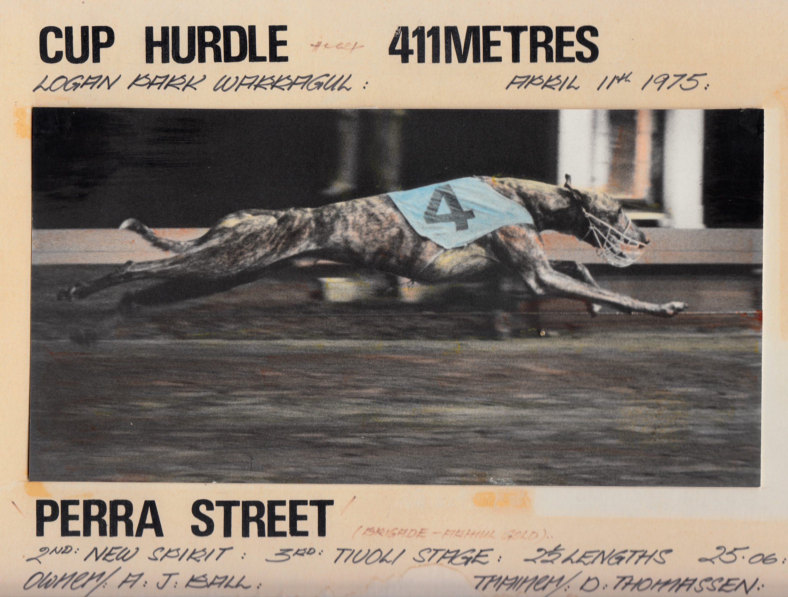 It is amazing what greyhound trainers keep. Basin mentor David Thomassen started training back in 1949 and had his biggest success when he won 1975 Sandown Hurdle Championship with (Tim) Perra Street. Now most members are aware of my love of the Up and Overs so to be passed on David’s box of memorabilia was a delight. David left his treasured memories with Vet Nurse Melanie Tochner from the Sandown Vet Clinic. The level of detail is as good as you will see. Among the items was a DVD of the Championship win filmed prior to Video Tape days on a reel-to-reel camera a top the Sandown Grandstand in those days by the Cafiso brothers. The boys raced star sprinter Roo Power. There is no commentary and unfortunately the soundtrack of my all-time favourite band The Eagles a world powerhouse of the 70’s had copyright issues so only Leo Sayer’s Long Tall Glasses remains. The other interesting find was a letter from Ken Norquay welcoming David to Sydney for a Hurdle Exhibition race in January 1976. The classic Race book has some interesting stuff in it none the less the Bookies fielding in those days. Hope you find the package interesting.