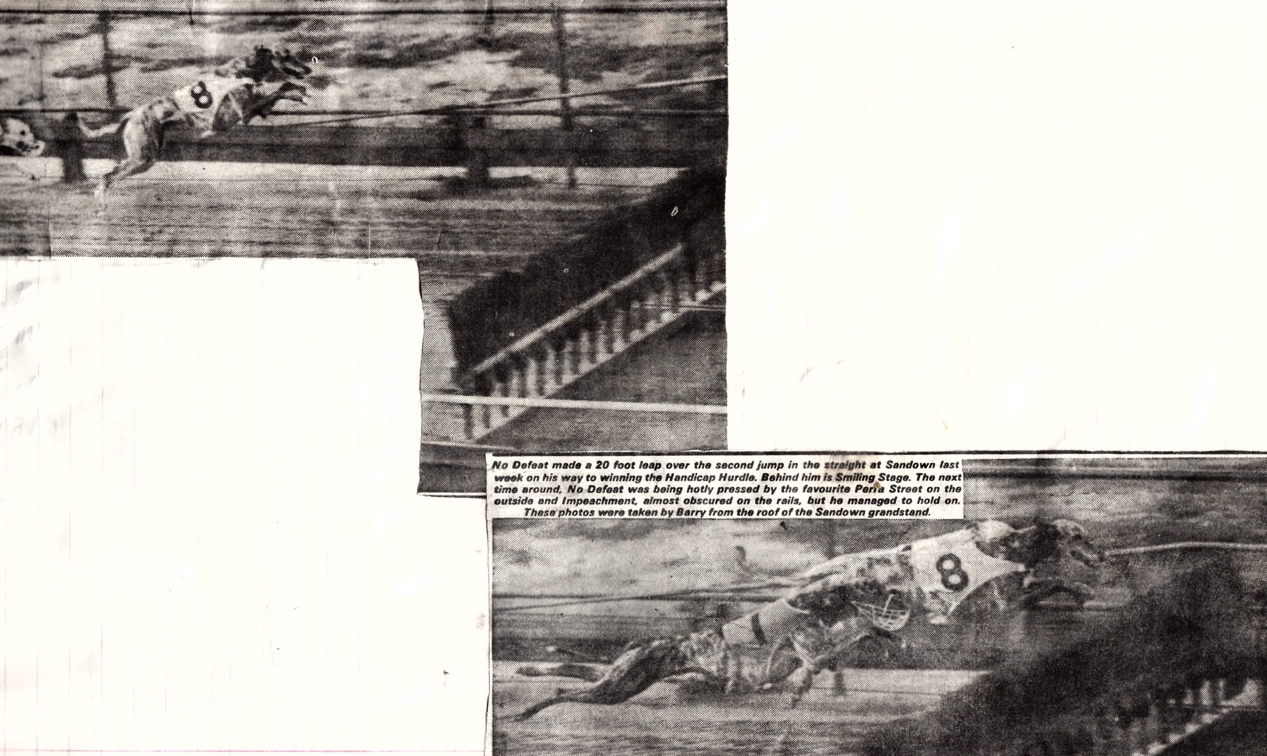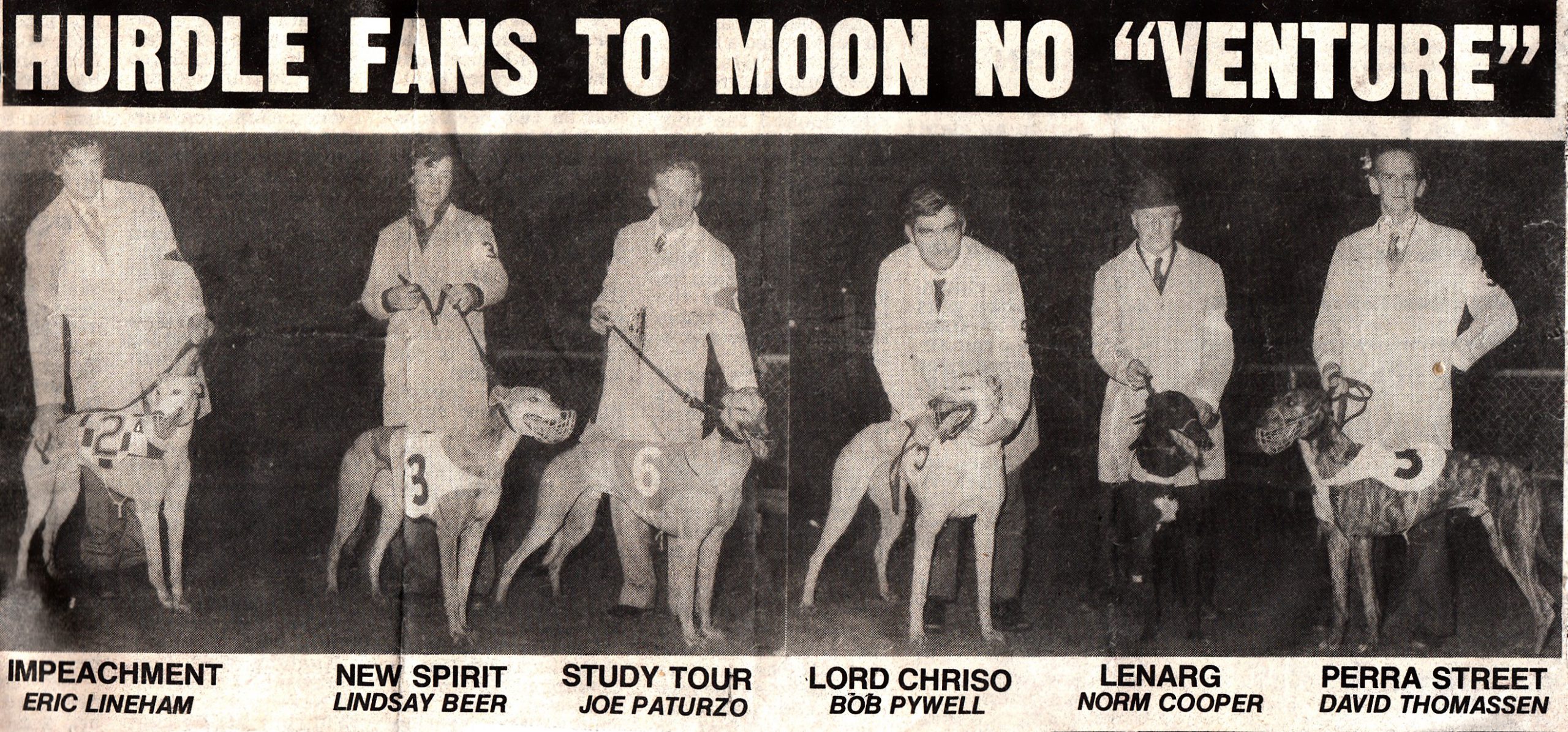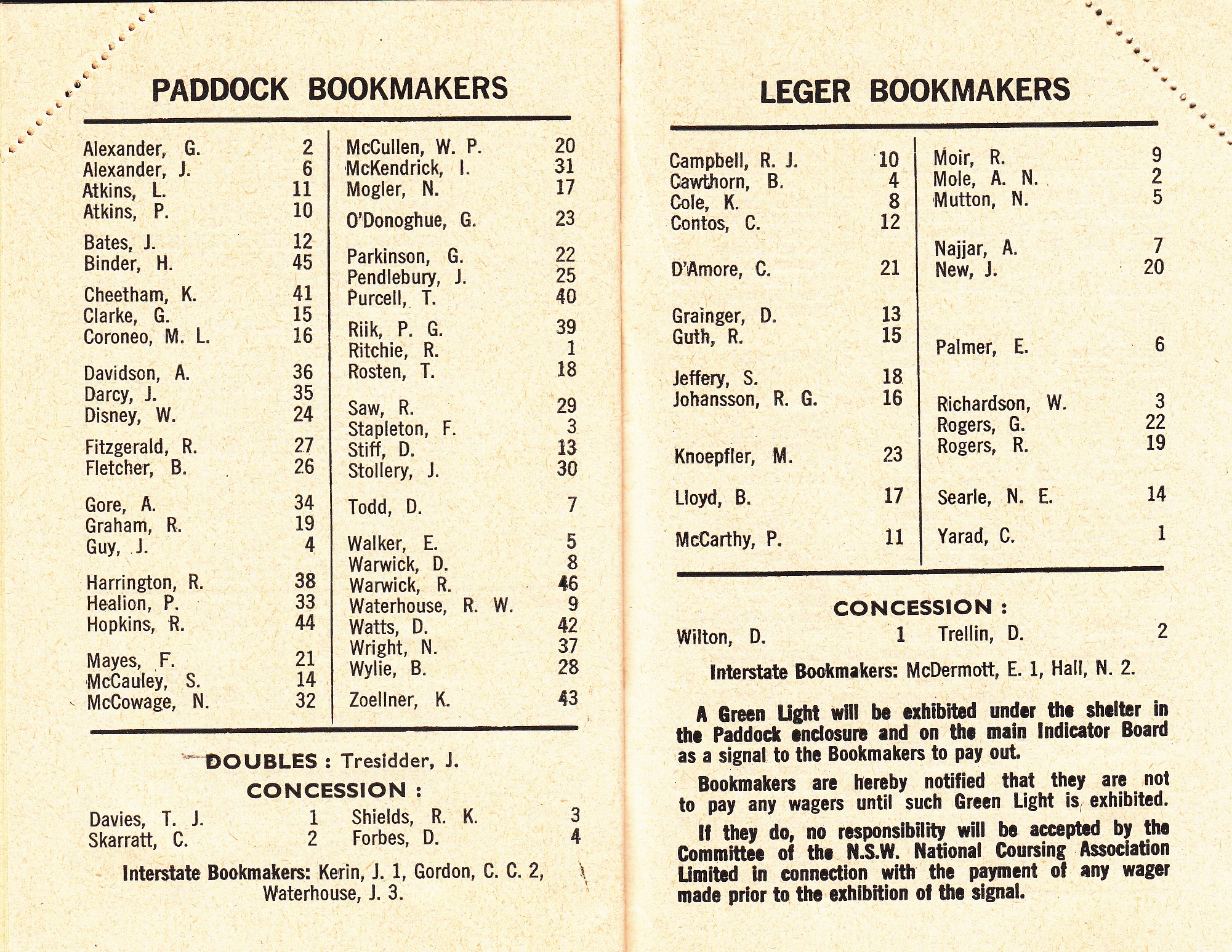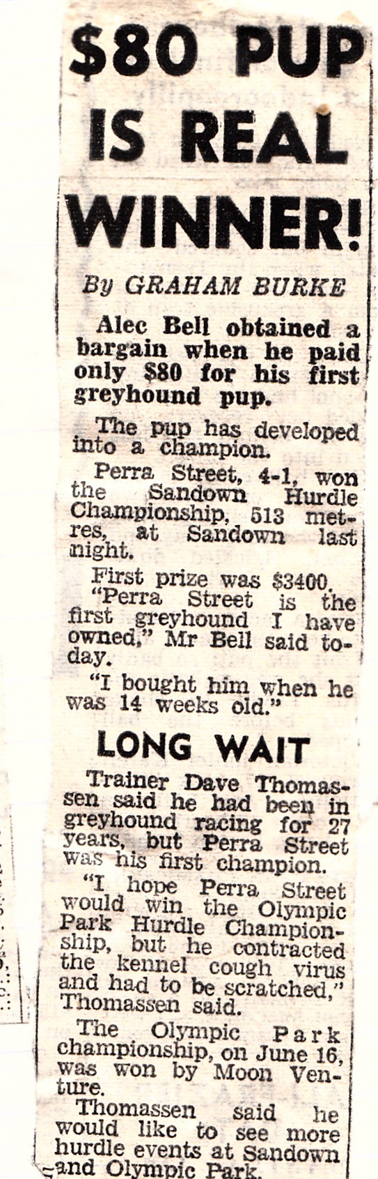 It is amazing what greyhound trainers keep. Basin mentor David Thomassen started training back in 1949 and had his biggest success when he won 1975 Sandown Hurdle Championship with (Tim) Perra Street. Now most members are aware of my love of the Up and Overs so to be passed on David’s box of memorabilia was a delight. David left his treasured memories with Vet Nurse Melanie Tochner from the Sandown Vet Clinic. The level of detail is as good as you will see. Among the items was a DVD of the Championship win filmed prior to Video Tape days on a reel-to-reel camera a top the Sandown Grandstand in those days by the Cafiso brothers. The boys raced star sprinter Roo Power. There is no commentary and unfortunately the soundtrack of my all-time favourite band The Eagles a world powerhouse of the 70’s had copyright issues so only Leo Sayer’s Long Tall Glasses remains. The other interesting find was a letter from Ken Norquay welcoming David to Sydney for a Hurdle Exhibition race in January 1976. The classic Race book has some interesting stuff in it none the less the Bookies fielding in those days. Hope you find the package interesting.