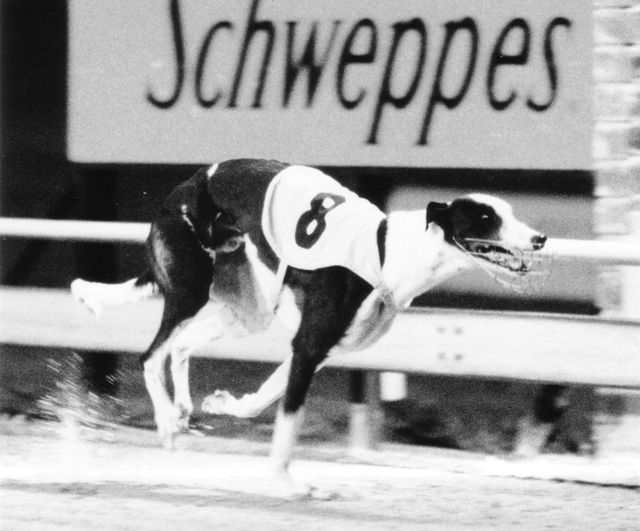 A smart sprinter of the middle 90’s was Phantom Fire a Black and White Dog February 1995 whelp by Fire Cape from Just Peggy he had 68 starts for 27 wins and 8 placings he won from 457-550 metres winning $37,991. Trained by Graeme Bate he won most of his races at Sandown with a number Best Of Night efforts his best a fast 29.66. He also won Geelong, Ballarat, Horsham, Shepparton, Wentworth Park and Hobart. Graeme also stood him at stud and he produced 256 offspring. His best pups were Mystical Gem, Skull Ring, Great Challenge, Scobes and Brittney Bale.