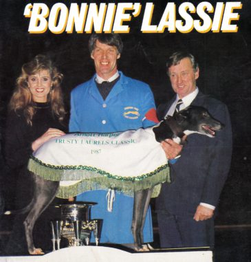 The Laurels is on this Thursday night here is the 1987 winner Playgirl Bonnie for trainer Tom Meulman. By (Bowetzel x Lilydale Lee) Blue bitch September 1985. 15 starts for six wins and four placings. She won at Sandown, Olympic, Shepparton and Sale. Pictured with Arnott Harper man Bob Golightly and hostess, the lovely Charlie.