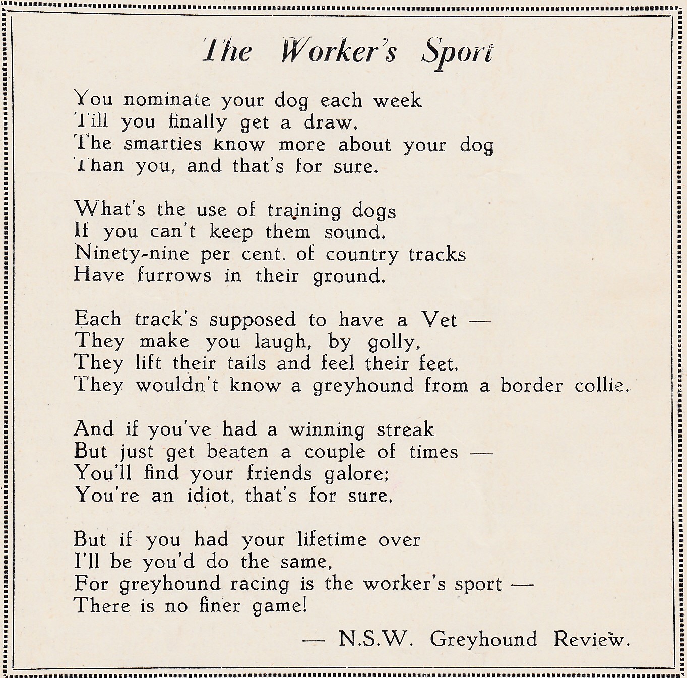 Rolland Parry– Few true words in that poem even today, always queried why they vet and weigh dogs but not horses
