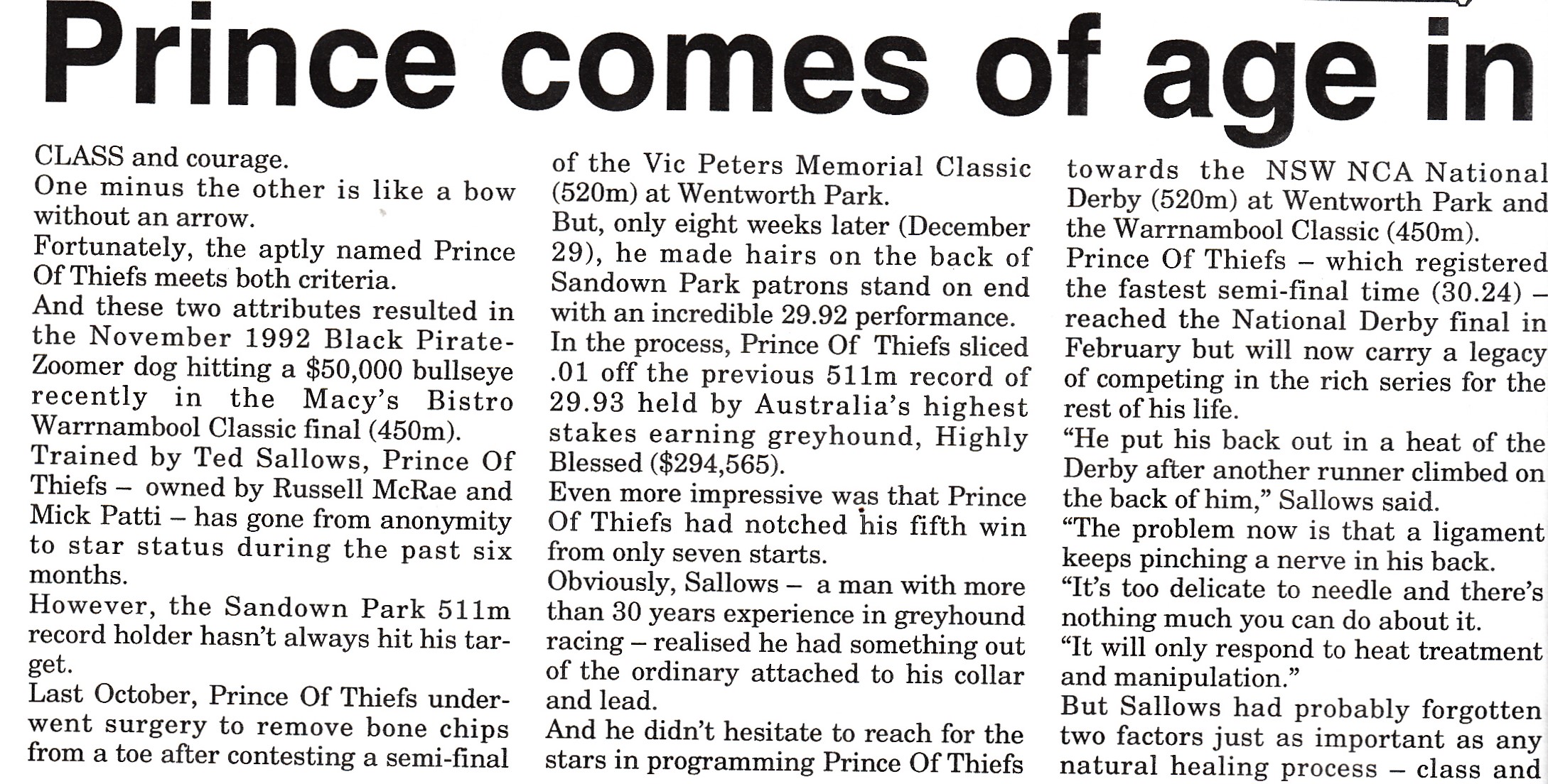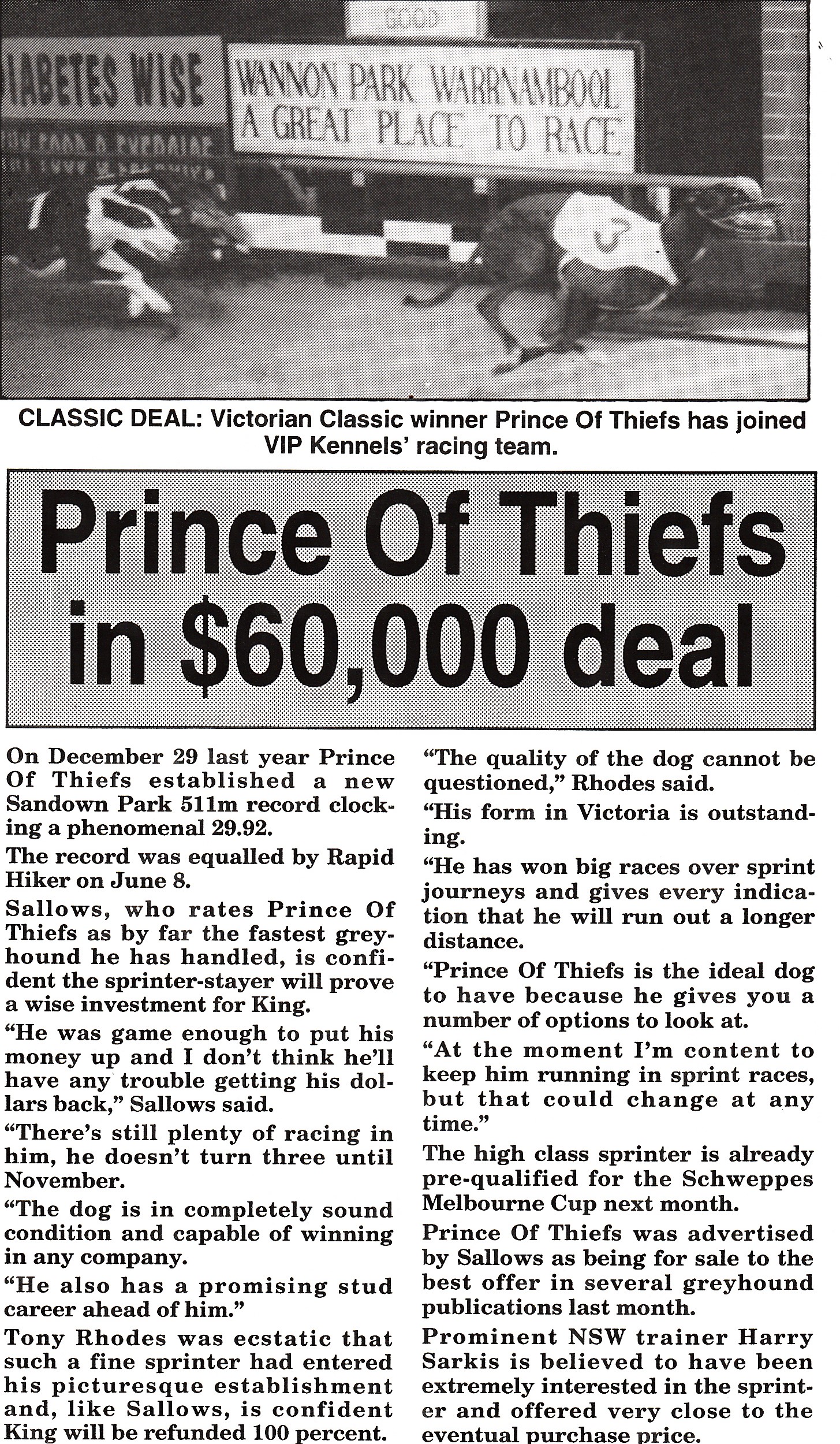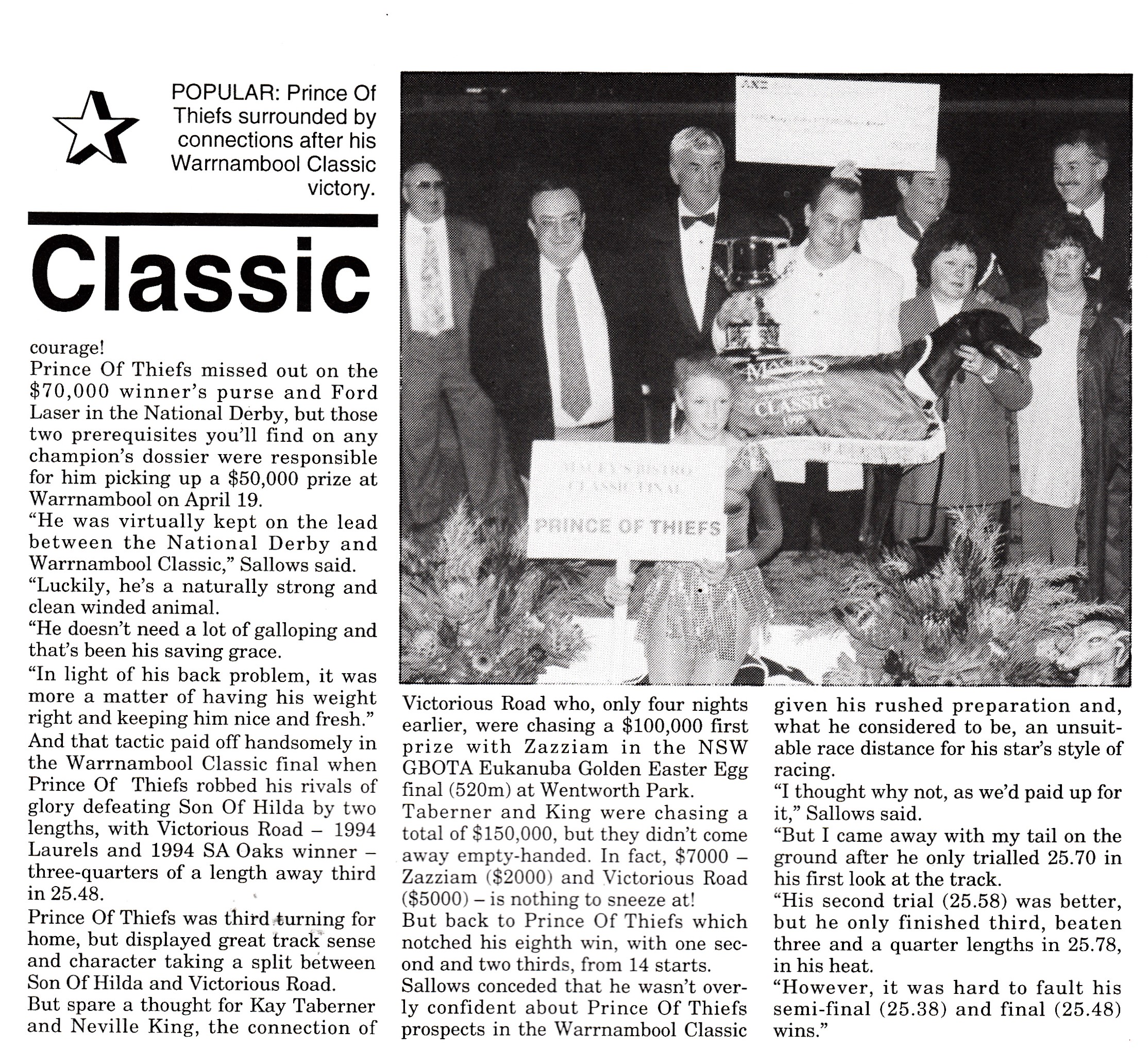 Injury plagued sprint star for Ted Sallows Prince Of Thiefs. (Black Pirate x Zoomer) 27 starts for 10 wins and five placings for $62,890 in prizemoney. Winner of the 1995 Warrnambool Classic. He won at Healesville, Geelong, Olympic Park 511 and 600. Plus, Sandown over 716 also finshing unplaced in the 1995 Australian Cup final behind Bonjase. He was sold for $60,000 in October 1995 story attached.