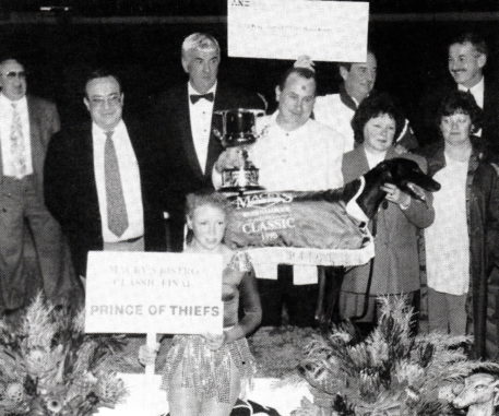 Injury plagued sprint star for Ted Sallows Prince Of Thiefs. (Black Pirate x Zoomer) 27 starts for 10 wins and five placings for $62,890 in prizemoney. Winner of the 1995 Warrnambool Classic. He won at Healesville, Geelong, Olympic Park 511 and 600. Plus, Sandown over 716 also finshing unplaced in the 1995 Australian Cup final behind Bonjase. He was sold for $60,000 in October 1995 story attached.