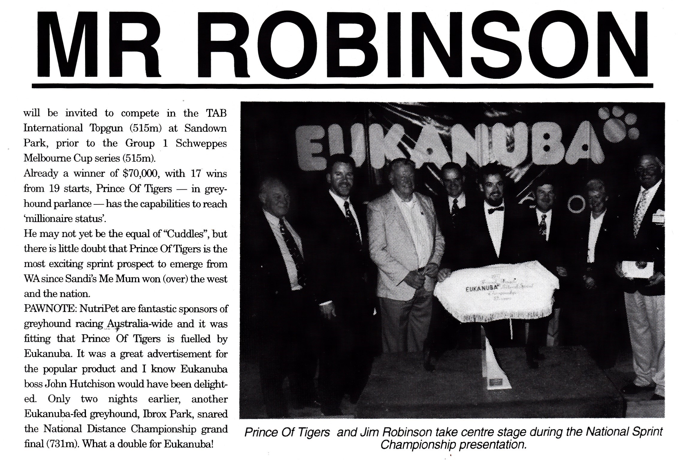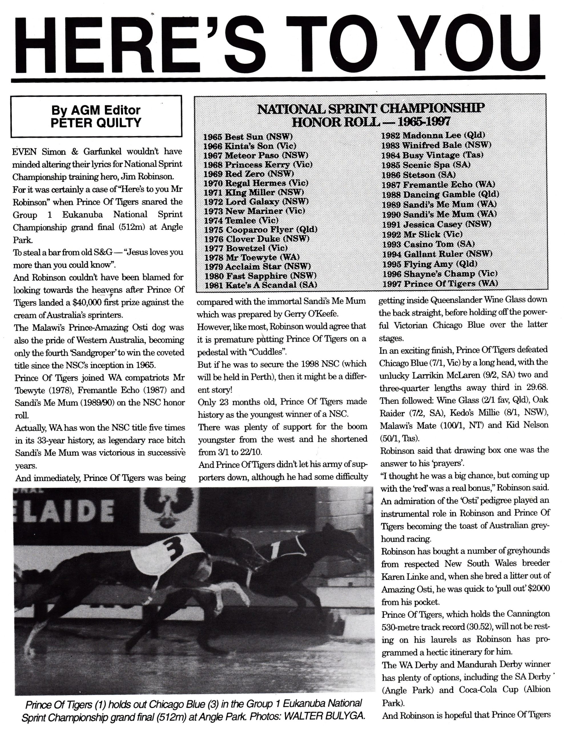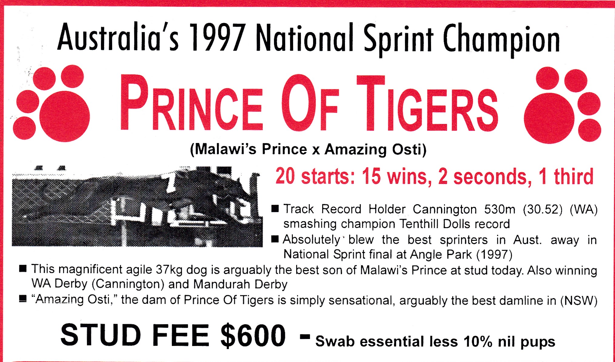 1997 National Sprint Champ Prince Of Tigers very fast dog. Held the record at Cannington.