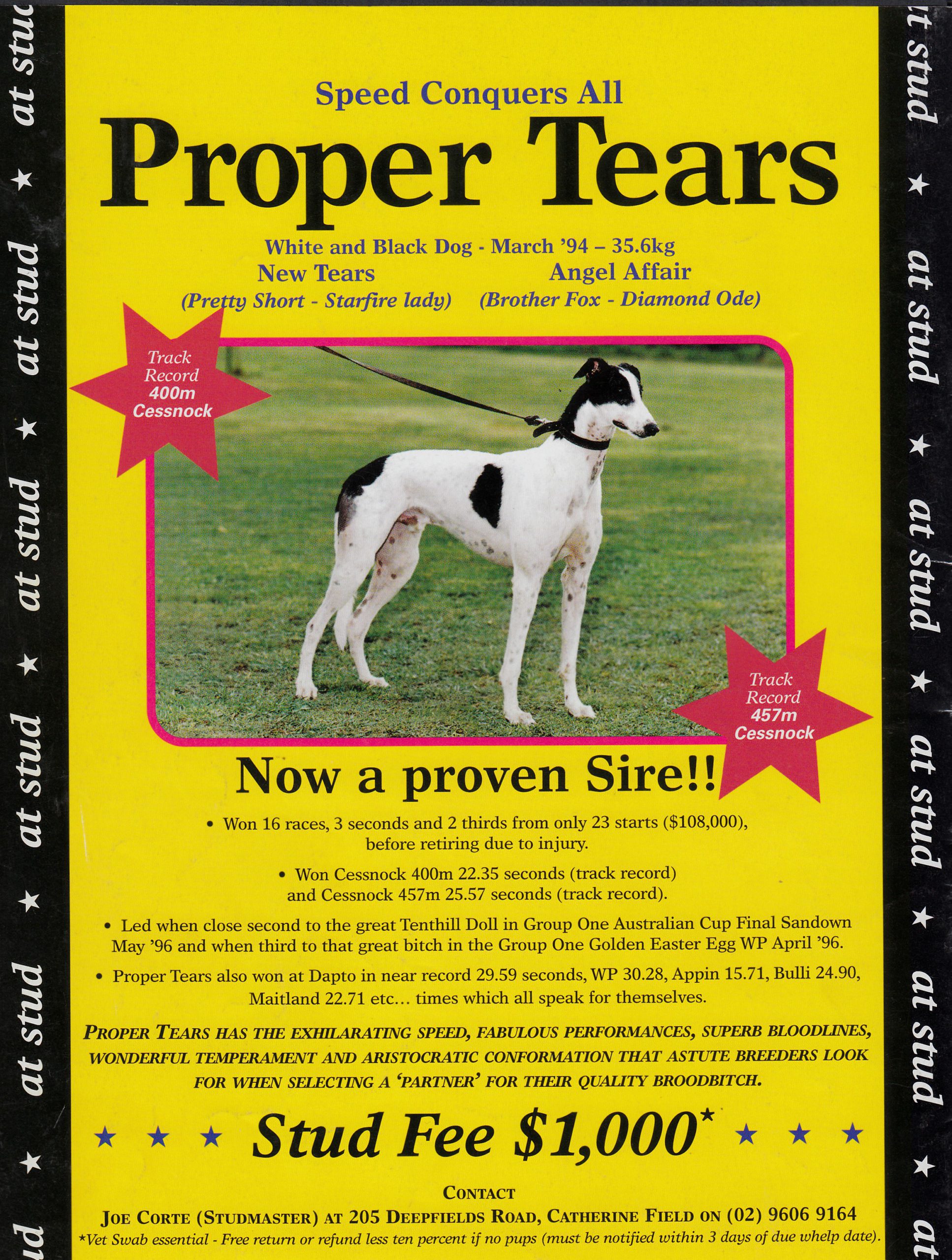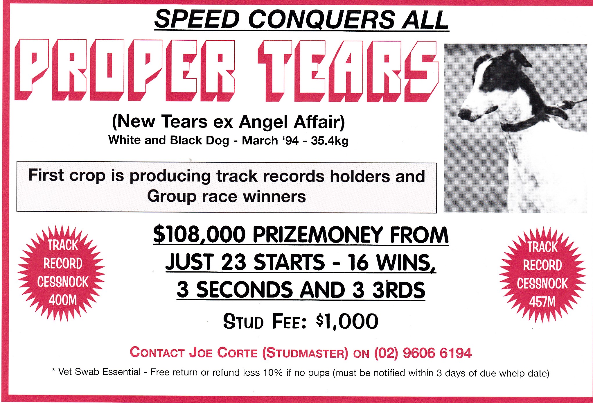 A very quick dog of the early 90’s Proper Tears. Successful stud career produced 289 litters for 978 pups. Best that come to mind Big Sam Banner, Give Me Dosh, Woy Woy Boy, Big Bad Raymond and Luther and Cawbourne Frank.