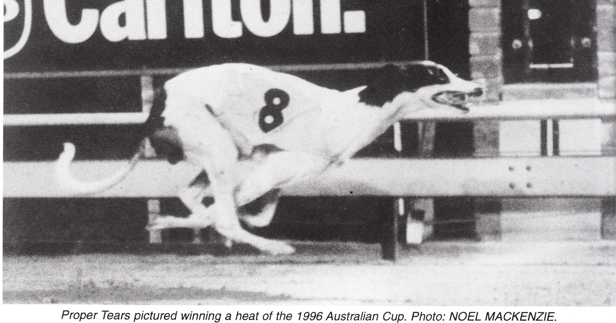 A very quick dog of the early 90’s Proper Tears. Successful stud career produced 289 litters for 978 pups. Best that come to mind Big Sam Banner, Give Me Dosh, Woy Woy Boy, Big Bad Raymond and Luther and Cawbourne Frank.