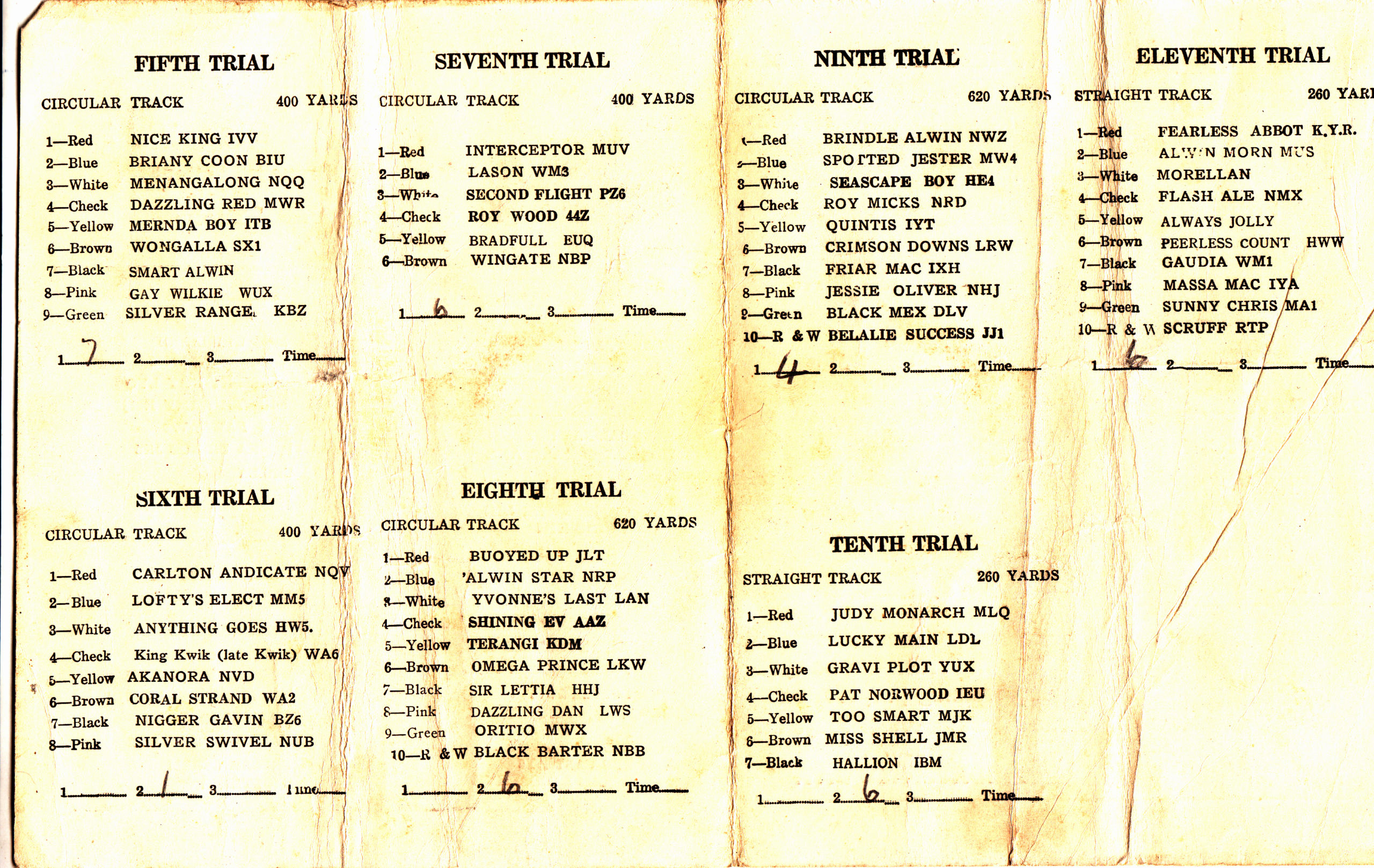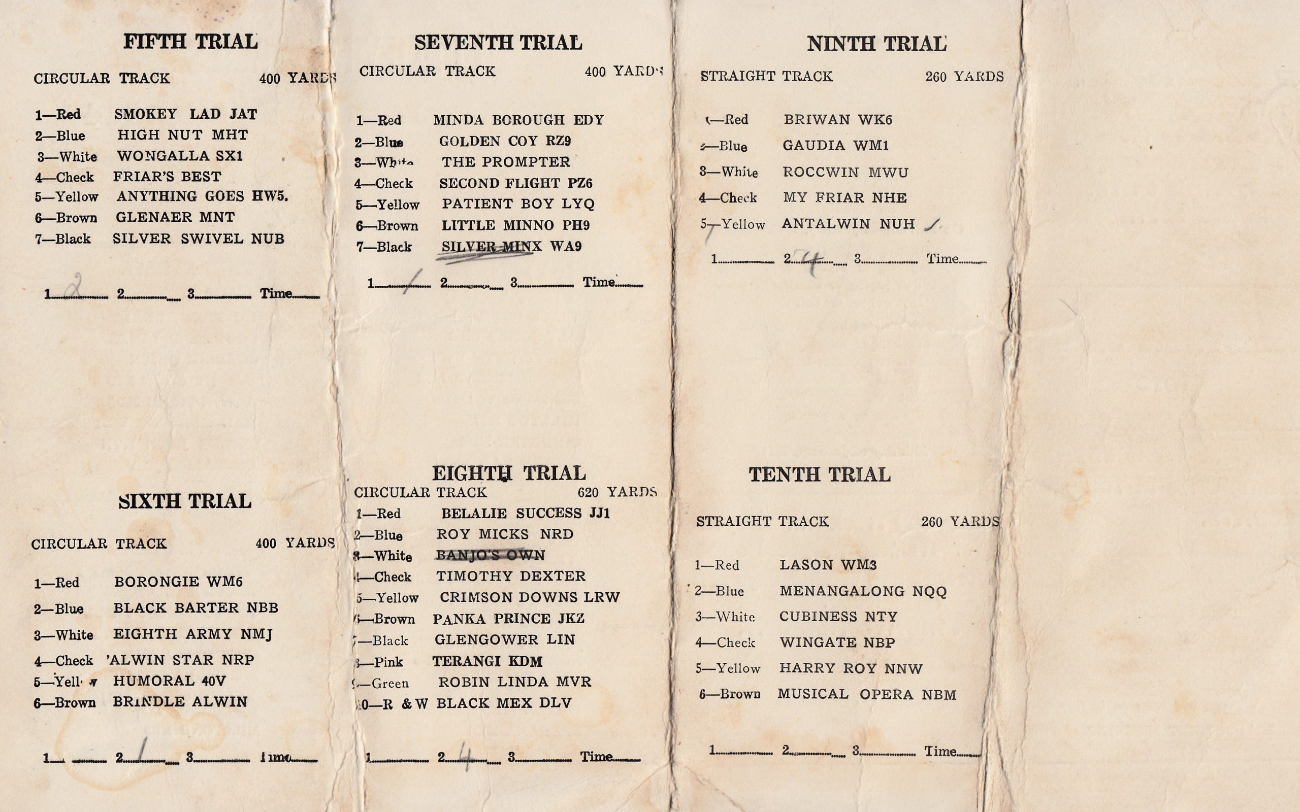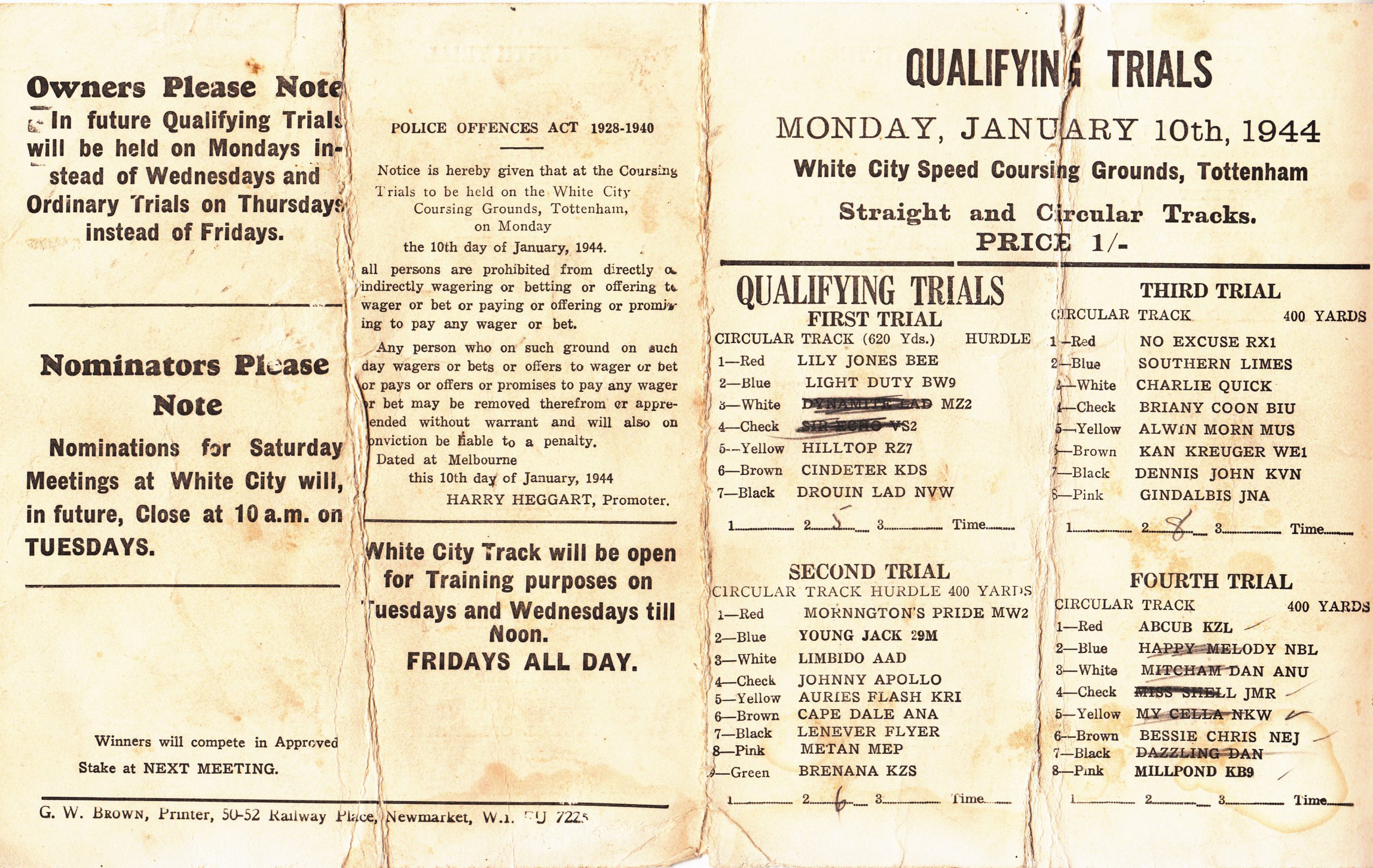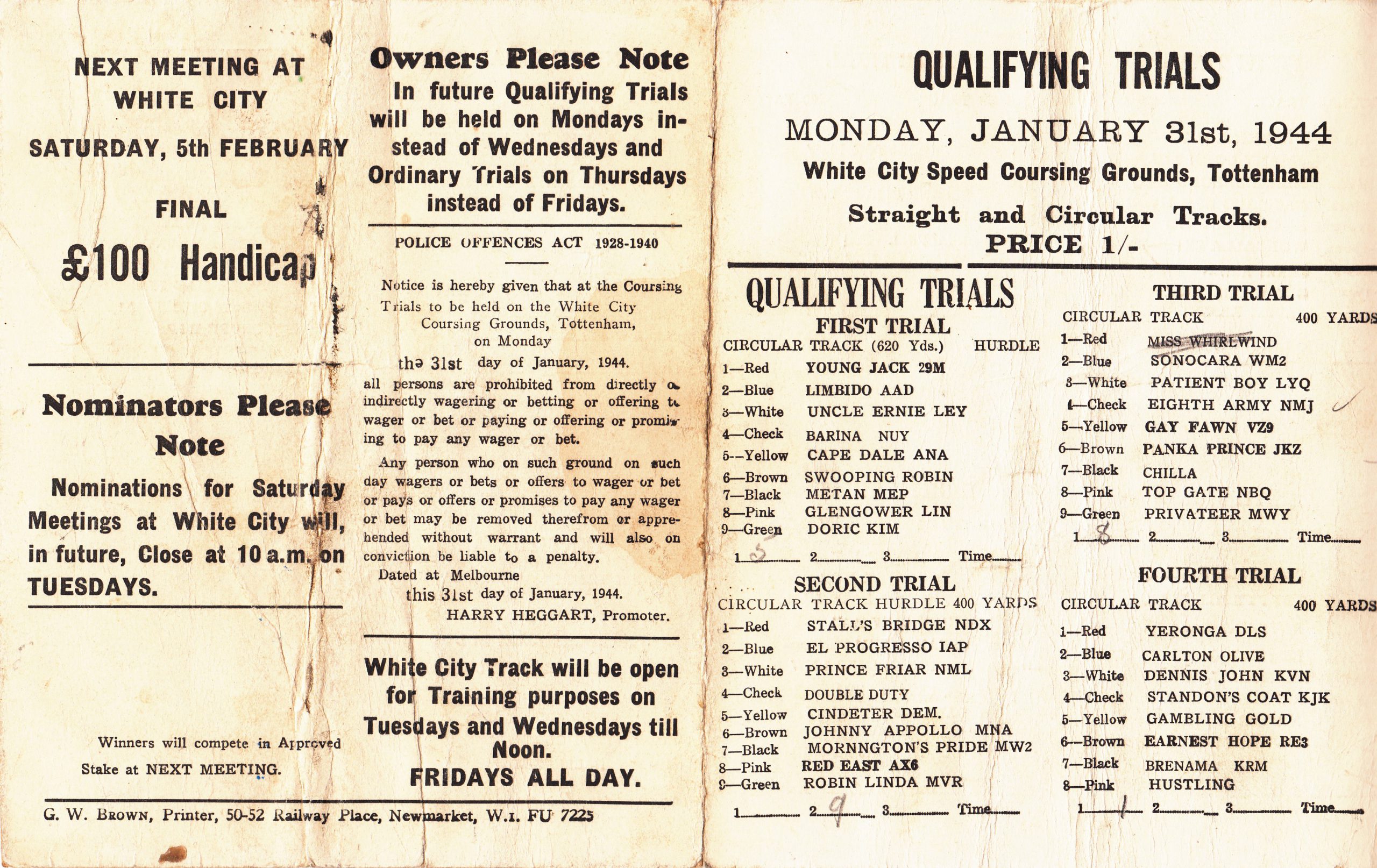 Eddie gave me these yesterday at the Melbourne Cup box draw. Great man Ed it’s pretty cool when you only have to use his first name and everyone knows who your talking about. Got them giving to him they are Program cards of the Qualifying Trials on Monday January 10th and 31st 1944. They were held at White City on the Straight and Circle tracks over different distances. I’m tipping not to many people have seen these. I like the price 1 shilling.