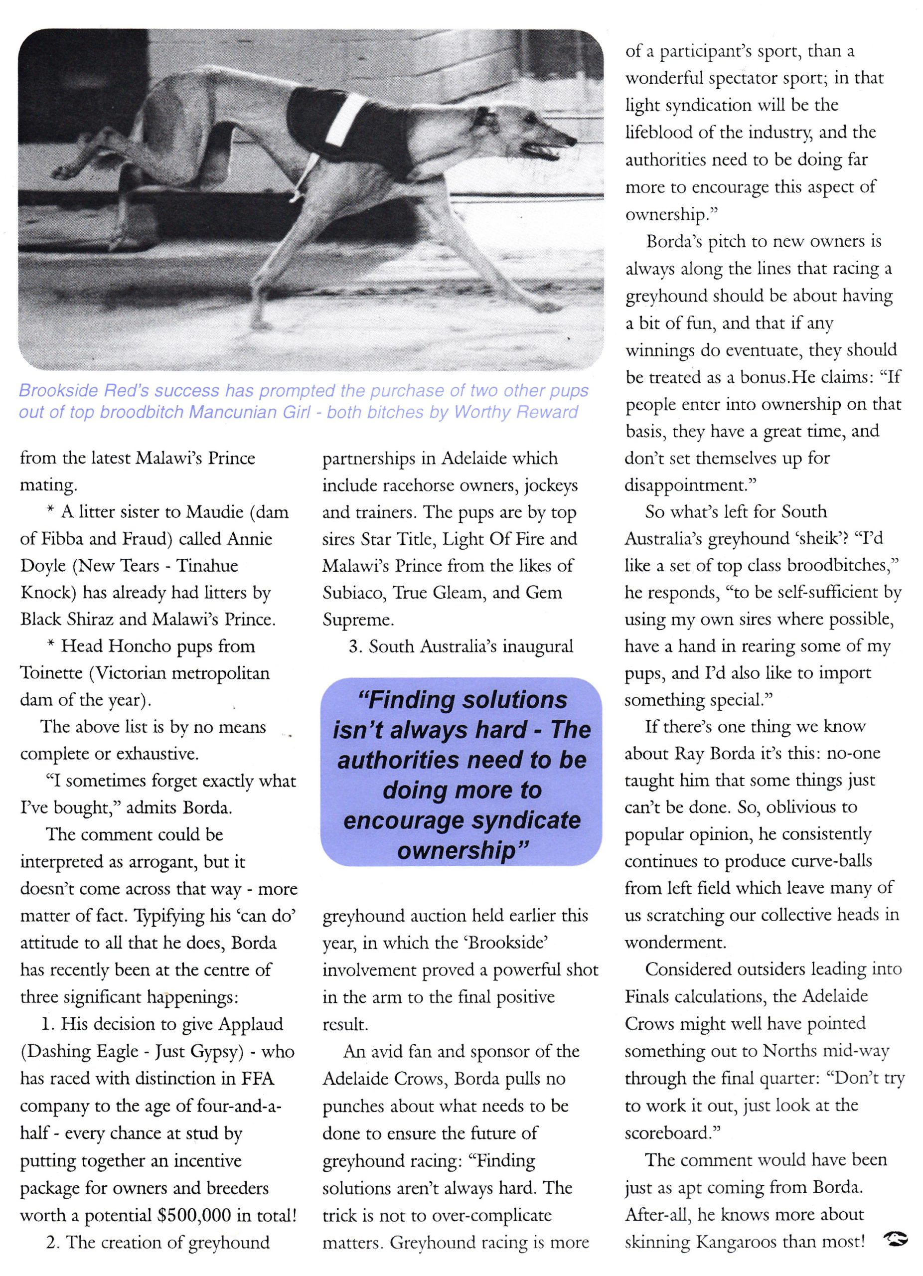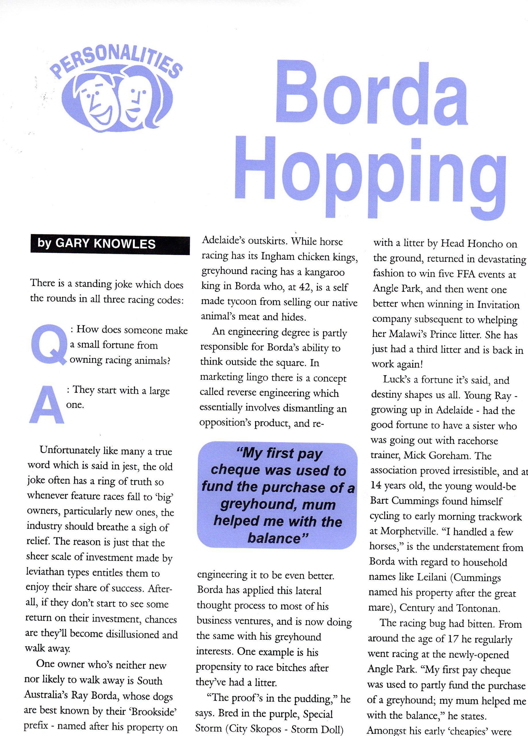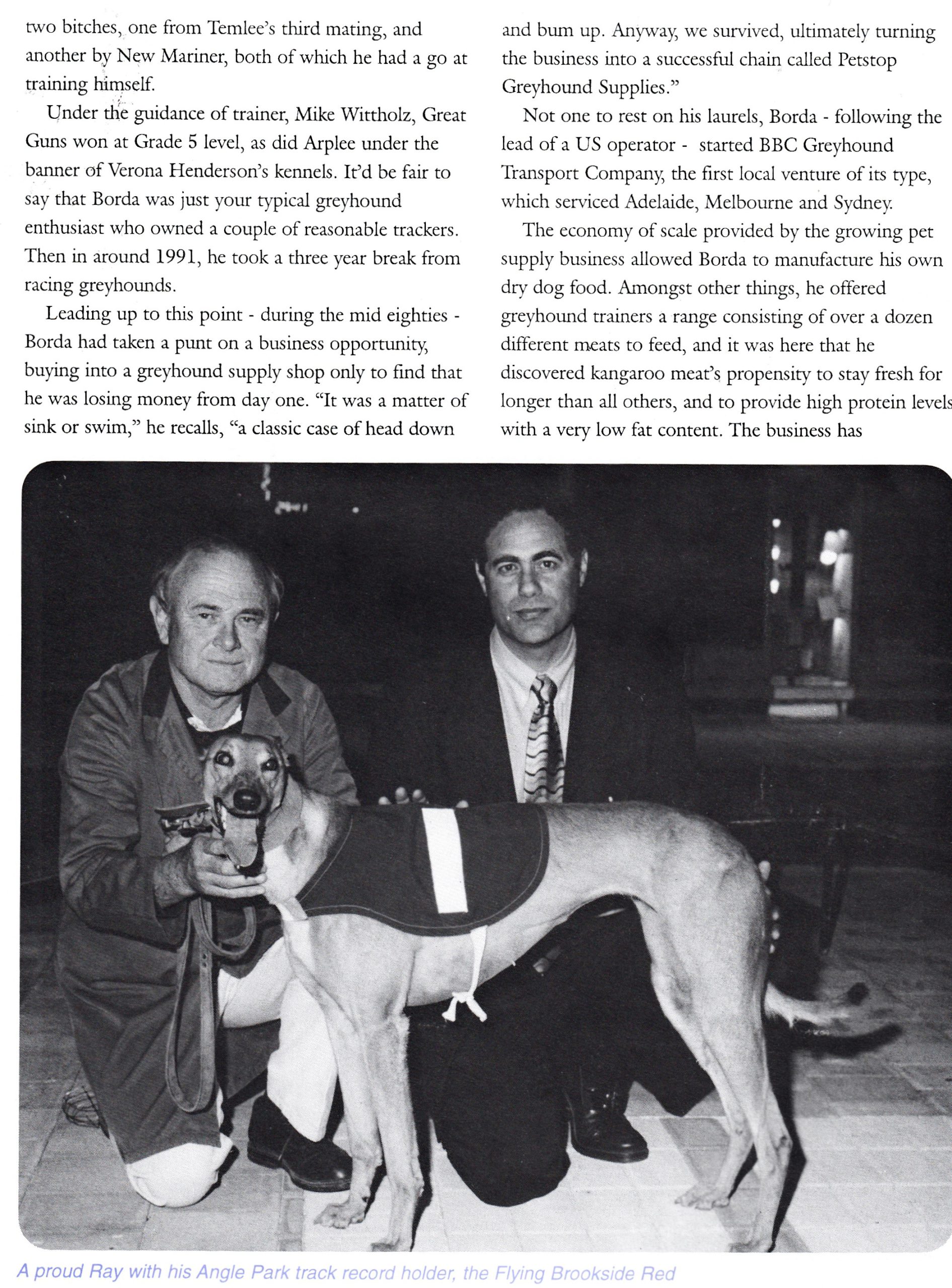 I wouldn’t normal put up a wordy document as I have on this occasion but it does explain how someone gets to where they are. Things don’t happen overnight. Ray Borda has been an enormous contributor to Greyhound Racing over a long period of time. He has embraced as many aspects of the industry as anyone could in a lifetime and he is as passionate today as he was when he first started. Here is a piece on Ray written in 1998.