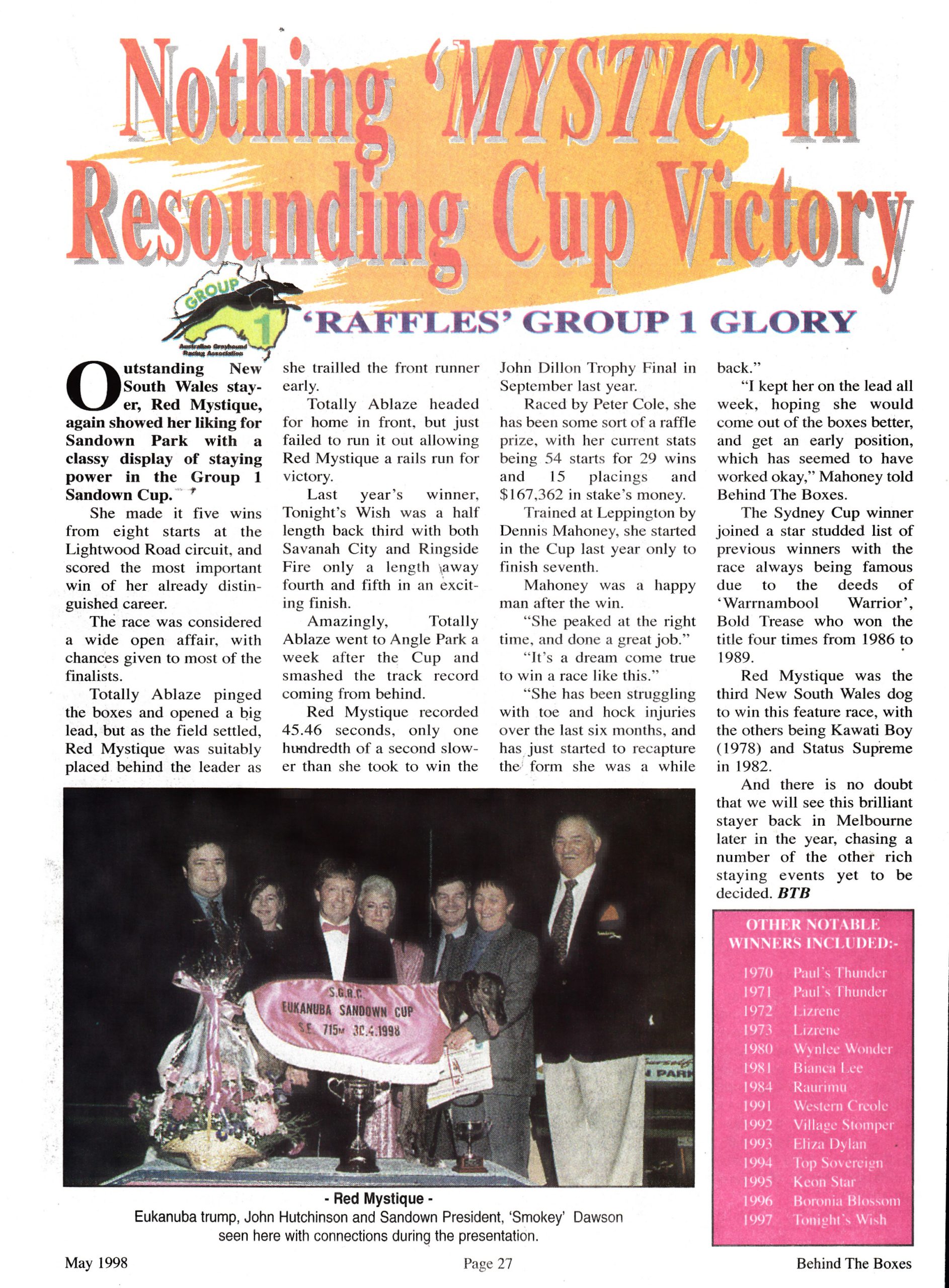 Read a story detailing Red Mystique’s career written by Duncan Stearn. Plus a report on her Sandown Cup win in 1998.