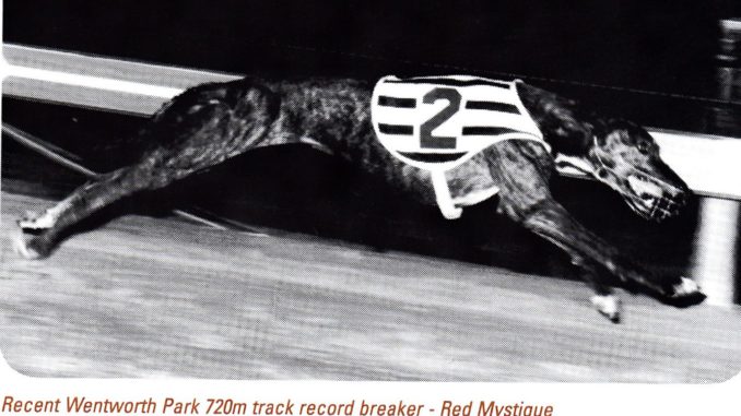 During 1997, Red Mystique had contested 31 races, notching 20 wins, four seconds and three thirds. Those efforts made her one of three finalists for the 1997 NSW Greyhound of the Year title, along with eventual winner Bobniak, and former Tasmanian sprinter Elle’s Commando.