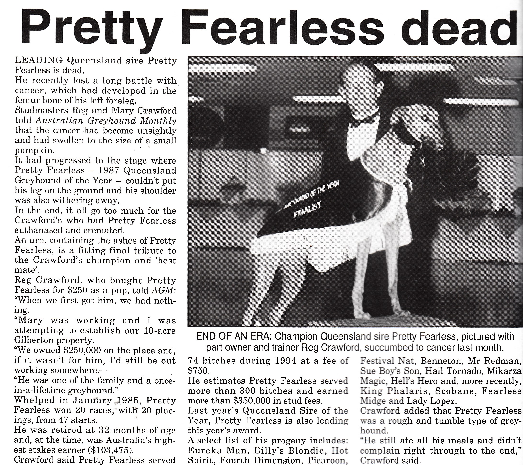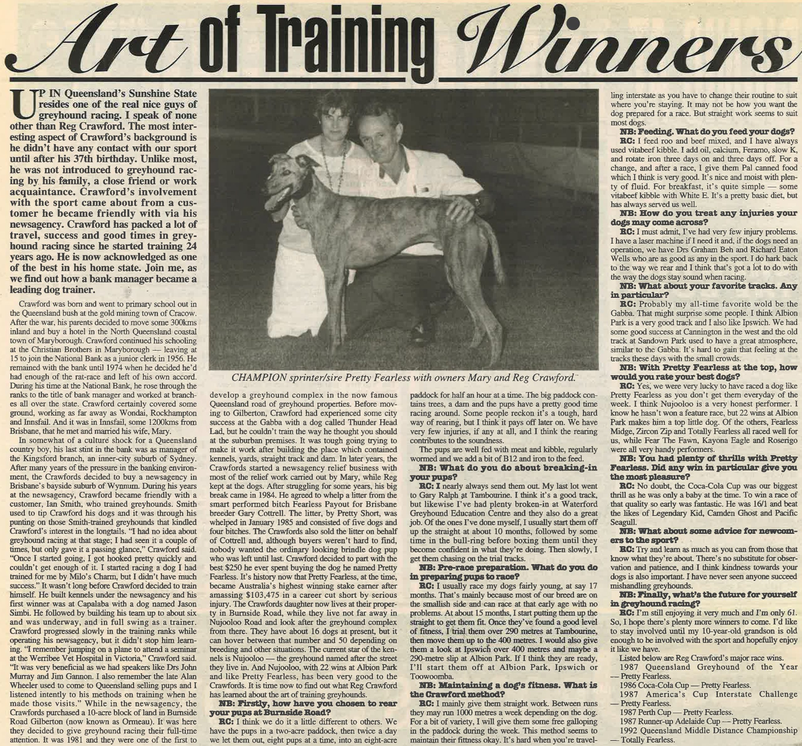 I did a number of articles for the Greyhound Weekly on how the top trainers go about their work. Here is one of Queensland’s best Reg Crawford. Plus, a story when he lost his champion Pretty Fearless.