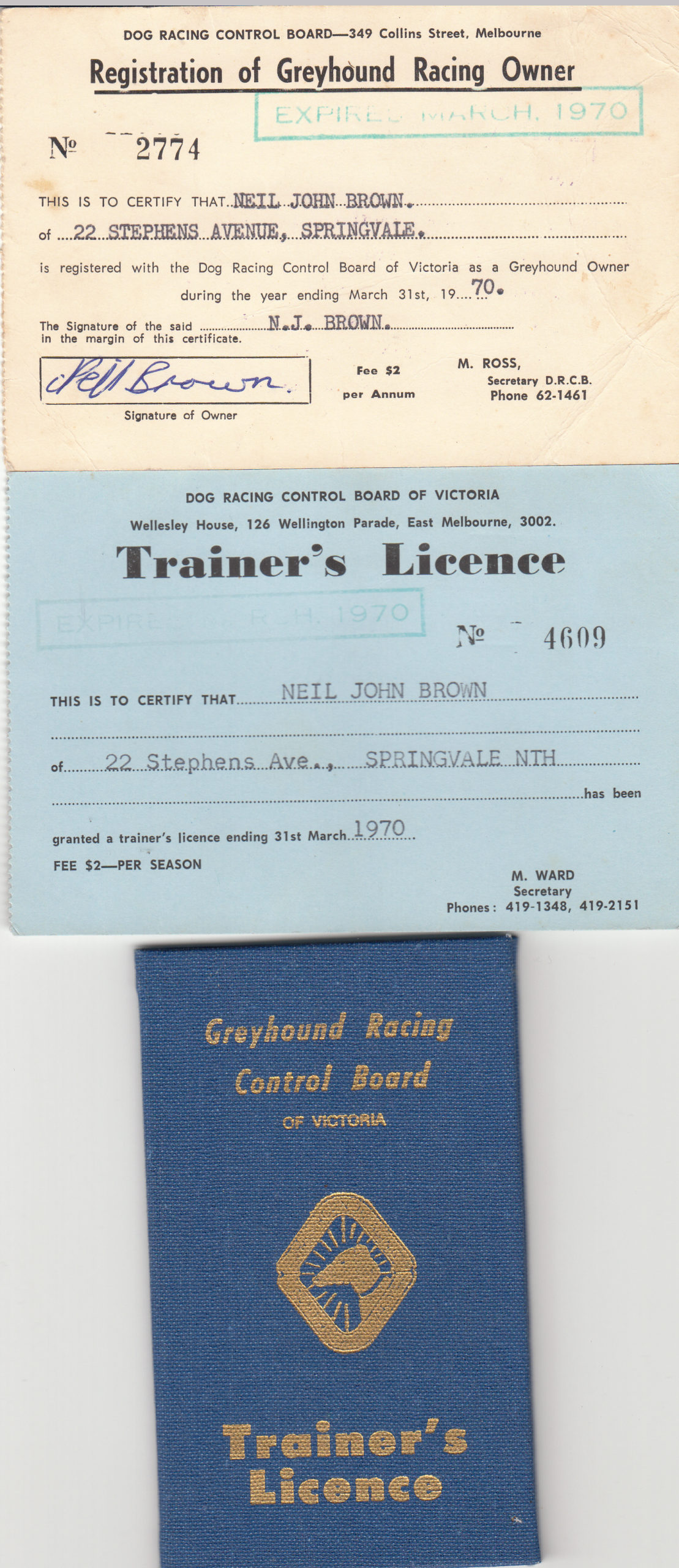 I found these on Wednesday means I have been a registered owner since 1969 until the present day. I noticed here the Board office changed from Collins Street to Wellington Parade that same year. Then I got the fancy hard cover trainer’s licence in the early 80’s. Last held a trainer’s licence about 2006.