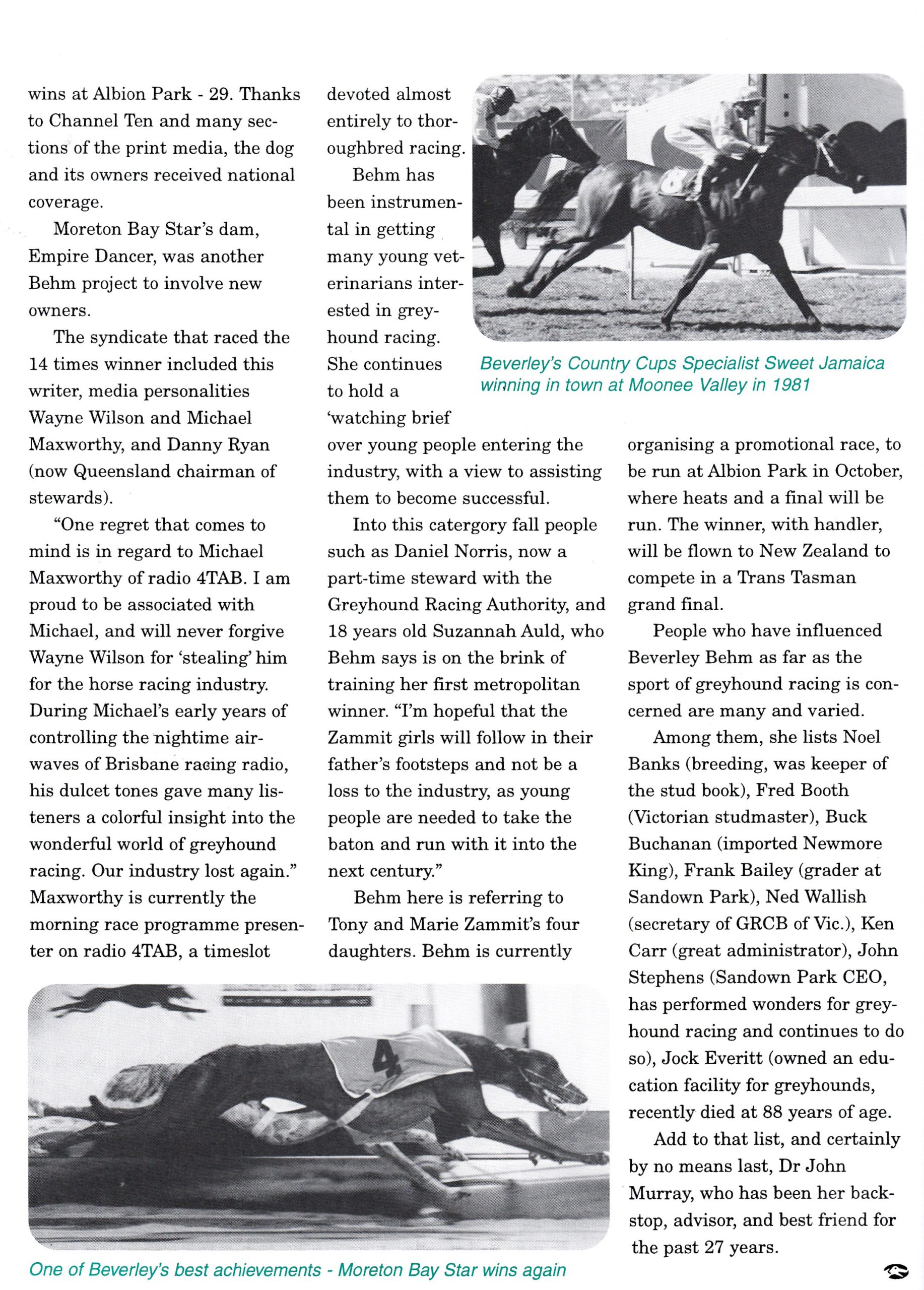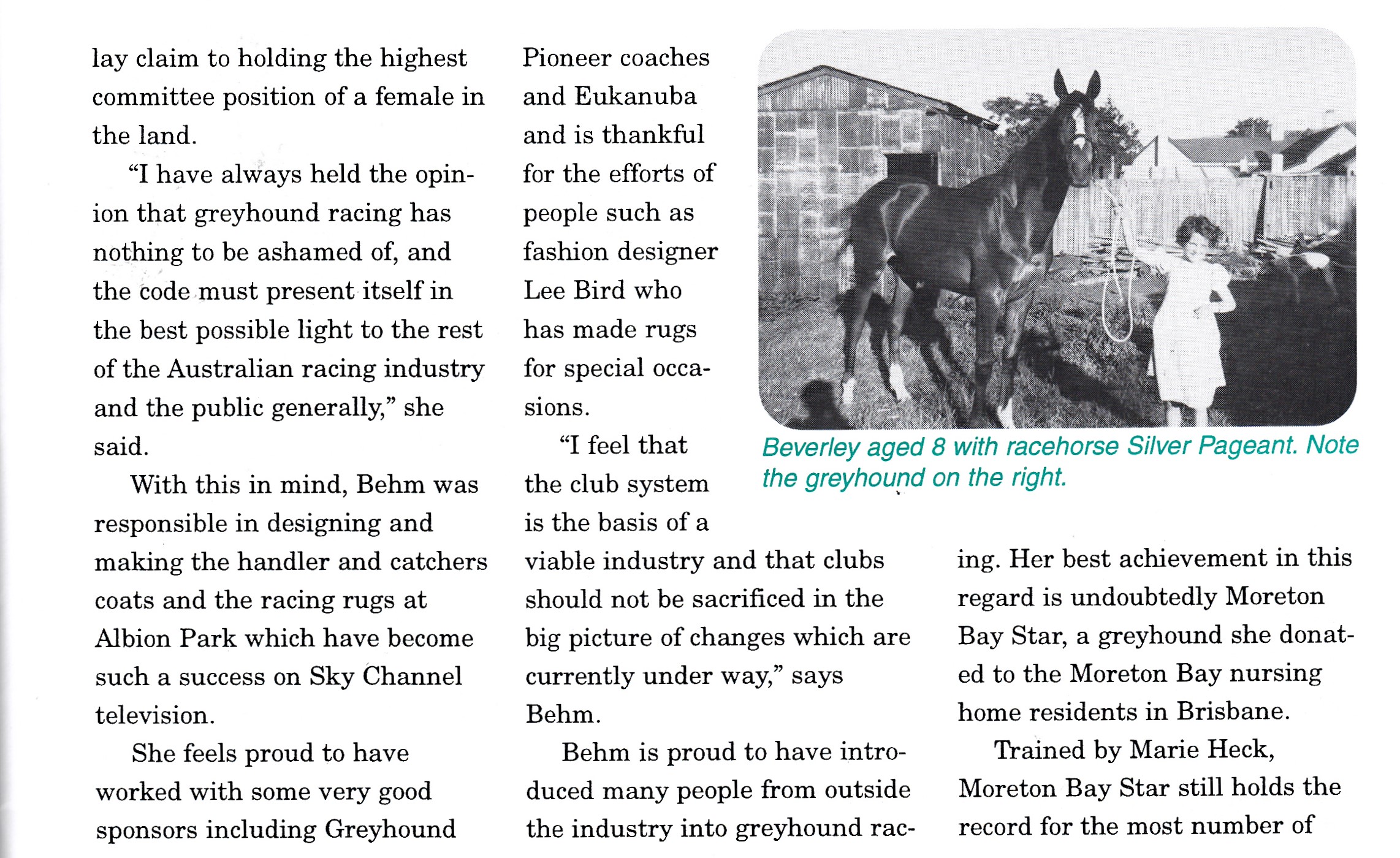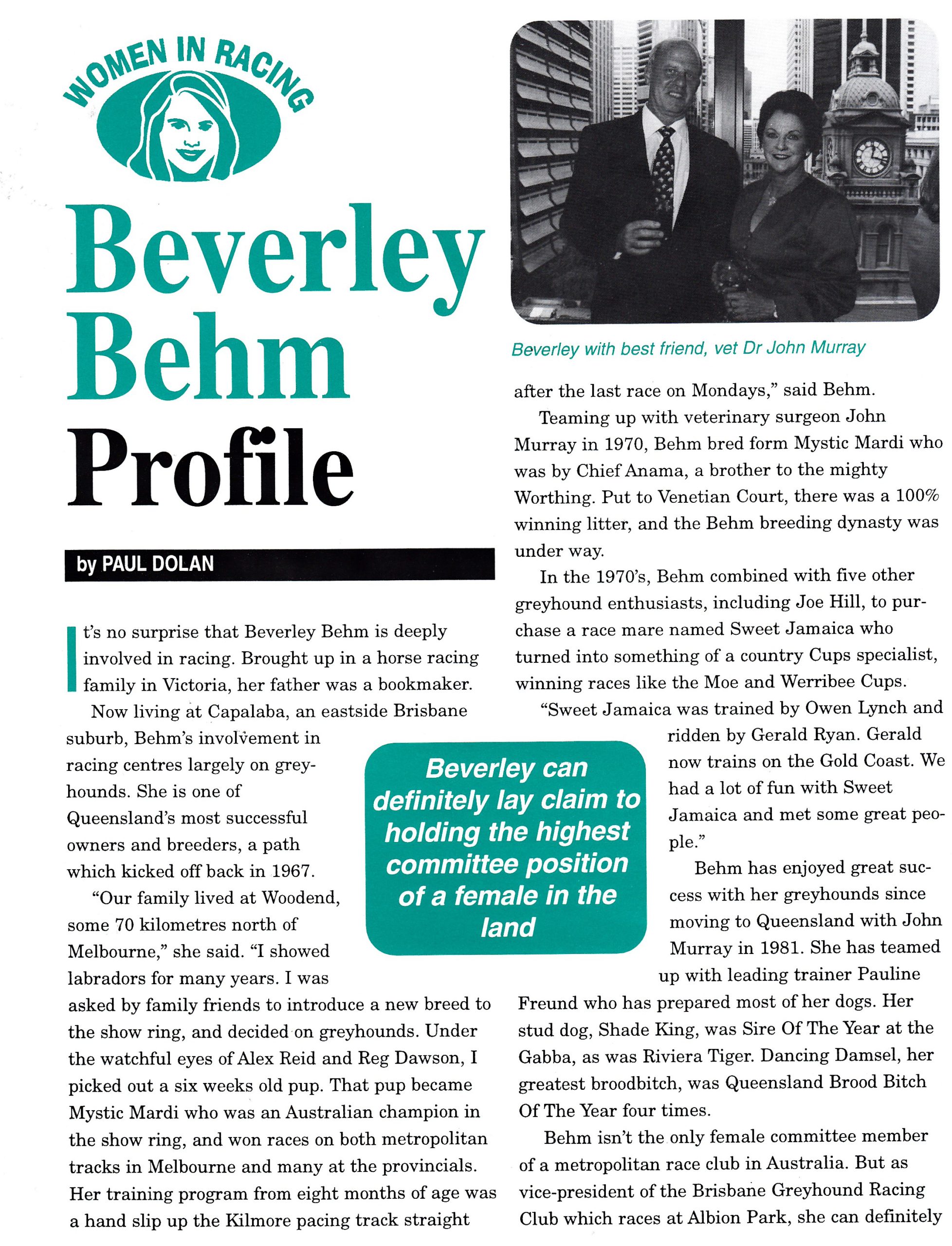Two great Victorians and Queenslanders the late John Murray and Beverley Behm made enormous contributions to Greyhound Racing. Both were inducted into the Queensland Greyhound Hall of Fame as well as elected life members of the Brisbane Greyhound Racing Club. Here is the story of both.