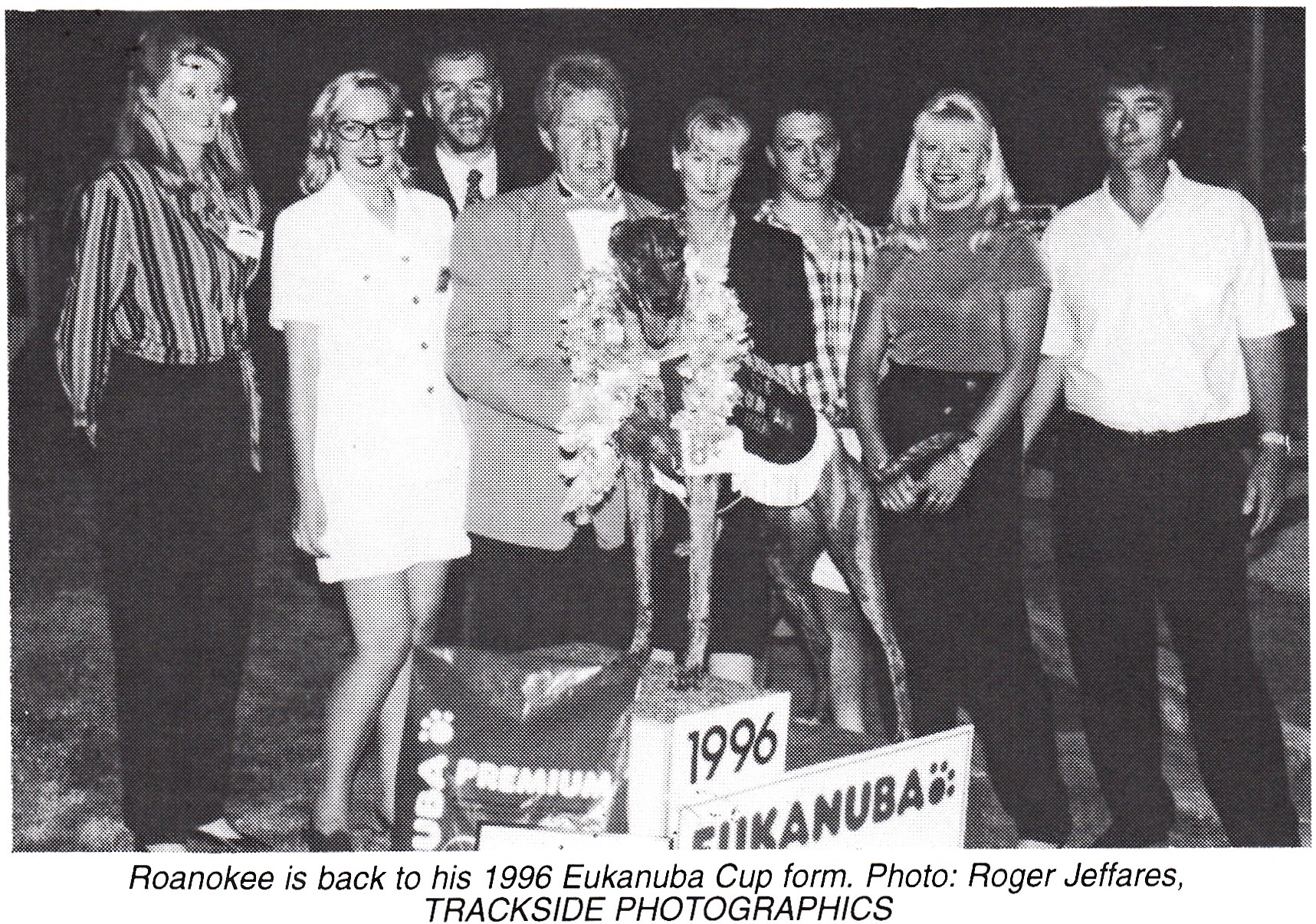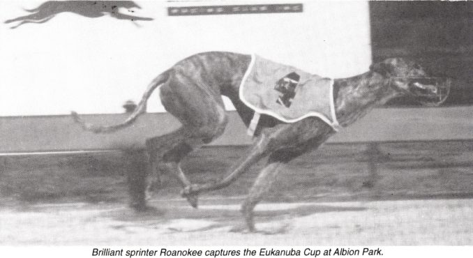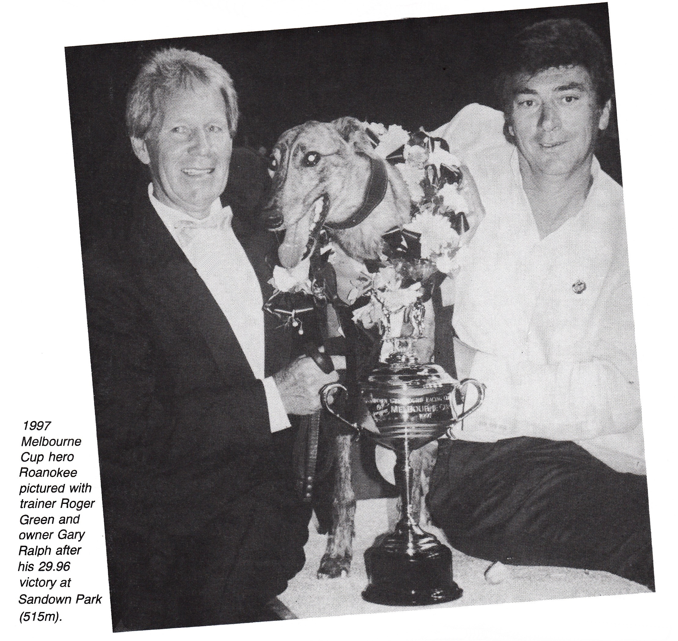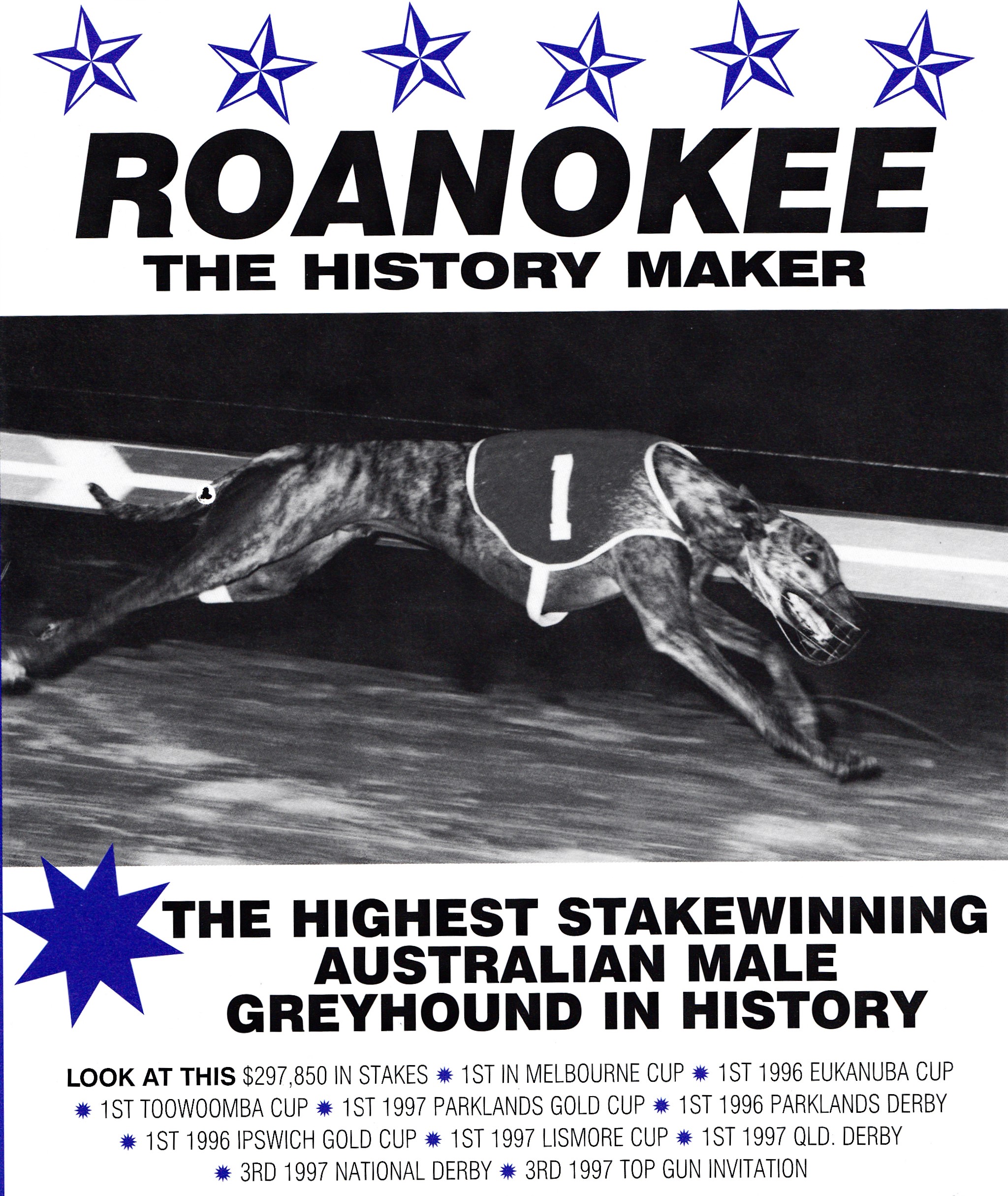 Queenslander Roanokee raced by the late Gary Ralph and trained by Roger Green. New Tears x Free Method whelped November 1994. 59 starts for 40 wins and six placings. $297,850. 4201 offspring in both Australia and Ireland.