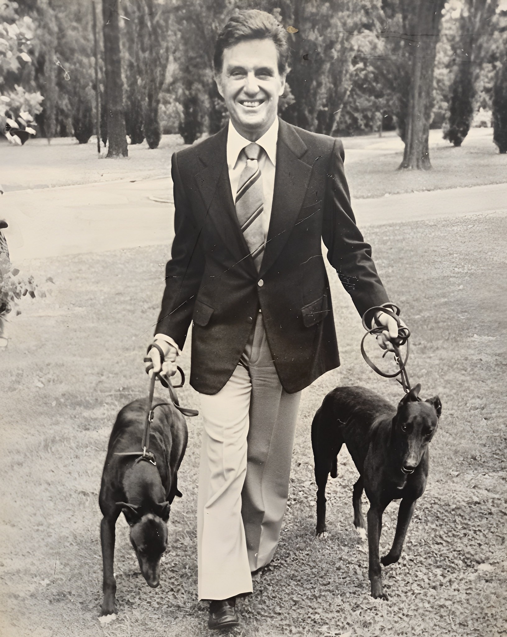 In 1978 Sandown Greyhound Racing Club brought Hollywood actor Robert Stack to Melbourne in an unprecedented Melbourne Cup promotion. Here is a great shot of him with 78 Cup winner Tangaloa and his litter brother Black Smoothie. The Emmy Award winning actor was famous as the star of TV Series ” The Untouchables” which ran from 1959 to 1963. Stack was born in January 1919 and pasted in May 2003 at 84. He was married to his wife actress Rosemarie Bowe from 1956 until his death. He appeared in 47 TV Series from 1951 until 2002 and 51 Movies from 1934 until 2001. The old timers around Sandown told me he was a top bloke.