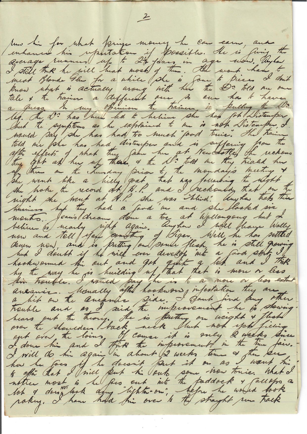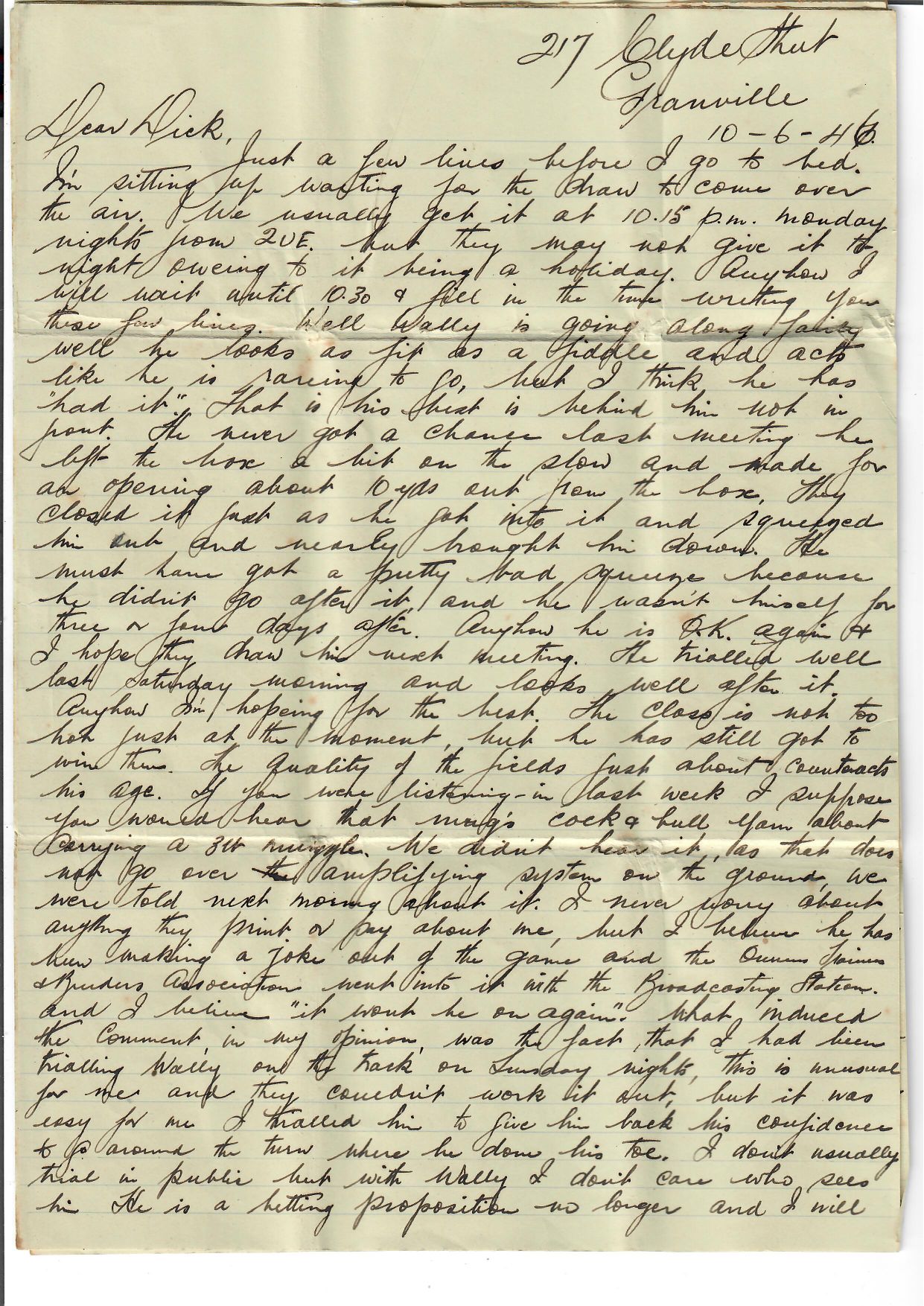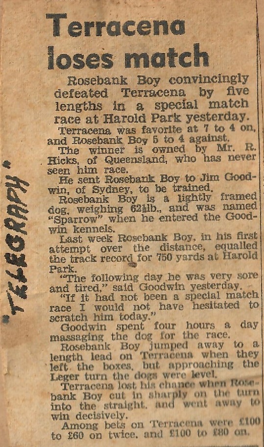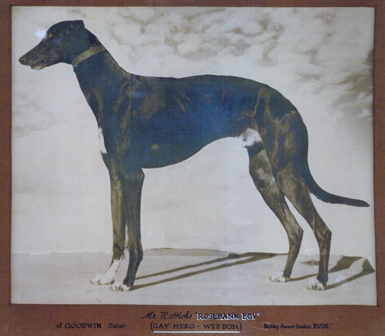 The litter of pups were born in Rosebank NSW. Thus, the greyhound was named Rosebank Boy. His litter December 1941 by Gay Hero from Wee Bon consisted of three pups, his brother was named Lucky Hero and a brindle Bitch was never named. Richard never saw his dog whose kennel name “Wally”, race and listened to every start on the Wireless. Richard sent Rosebank Boy to Granville trainer Jim Goodwin and they corresponded by letter. Richard continued to own and race greyhounds into the late 1980’s. Even though his joy for the sport continued, his persistence did not pay off, as there was never another Rosebank Boy.