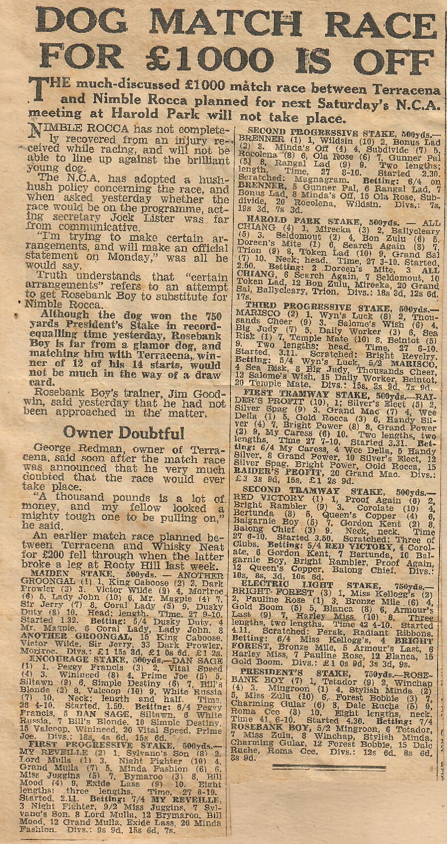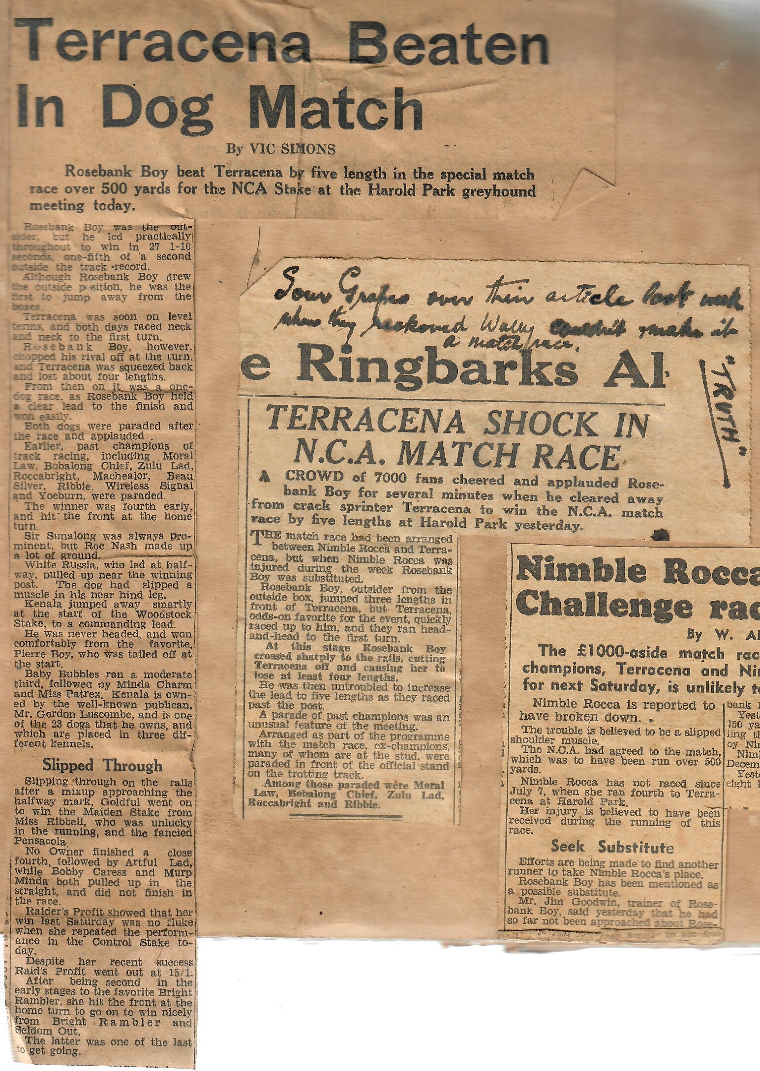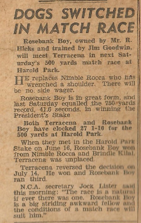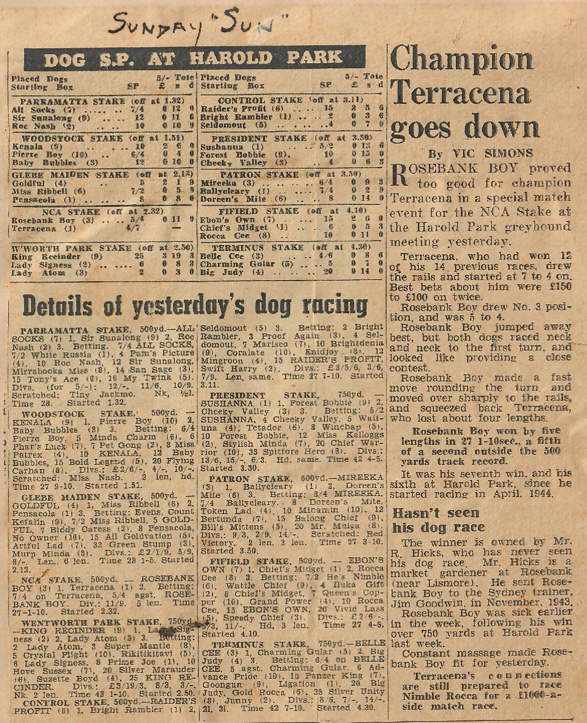 Rosebank Boy did not return to owner Richard Hicks; it was decided he was to be kept by Jim Goodwin who stood him at stud. At the centre of the story is the NCA Stake which I believe to be the first Match Race ever held. It took place at Harold Park over 500 yards on Saturday afternoon August 11, 1945, in front of 7000 cheering fans. A 1000-pound side wager race was scheduled between champs Terracena and Nimble Rocca. However Nimble Rocca was a last-minute scratching due to injury and there seemed to be some question around the 1000-pound side wager. Particularly when the race went ahead with a first prize of 50 pound. The club called on the unsung hero Rosebank Boy to take his place. Given no chance and starting 5/4 with Terracena 4/7. “Wally” came into the race after equalling Nimble Rocca’s Harold Park 750-yard track record, recording 41 3-5ths at the previous meeting. As the reports show Rosebank Boy unusually beginning well, he led, was joined then cut off Terracena at the turn racing away to win by 5 lengths. He ran 27 and 1-10th only one fifth outside the 500 yards record. Yolanda of East Lindfield had to visit her cousin in Queensland to retrieve the scrapbook and painstakingly scanned a mountain of photo’s, press clippings, stud notices, letters and information pertaining to the story. I would like to publicly thank her for her efforts in bringing an amazing historical archive to light, for all greyhound fans to share for all time’s sake. I also need to acknowledge the “Hicks” family regarding the information supplied as well. A number played a part in keeping this material is such good order for over 77 years. So, thank you to Richard Hick’s children and grandchildren. Interesting points races contained 10 runners and box draws were held at the meeting. You will notice Rosebank Boy was one the red but came from box three. What about the number of Bookmakers field that day. Rosebank Boy had a very successful stud career which I will elaborate on in another post. The pic of Rosebank Boy winning in the nine rug he is defeating Nimble Rocca second with Terracena finishing fourth. There also is a pic of Richard Hicks with his wife Edna.