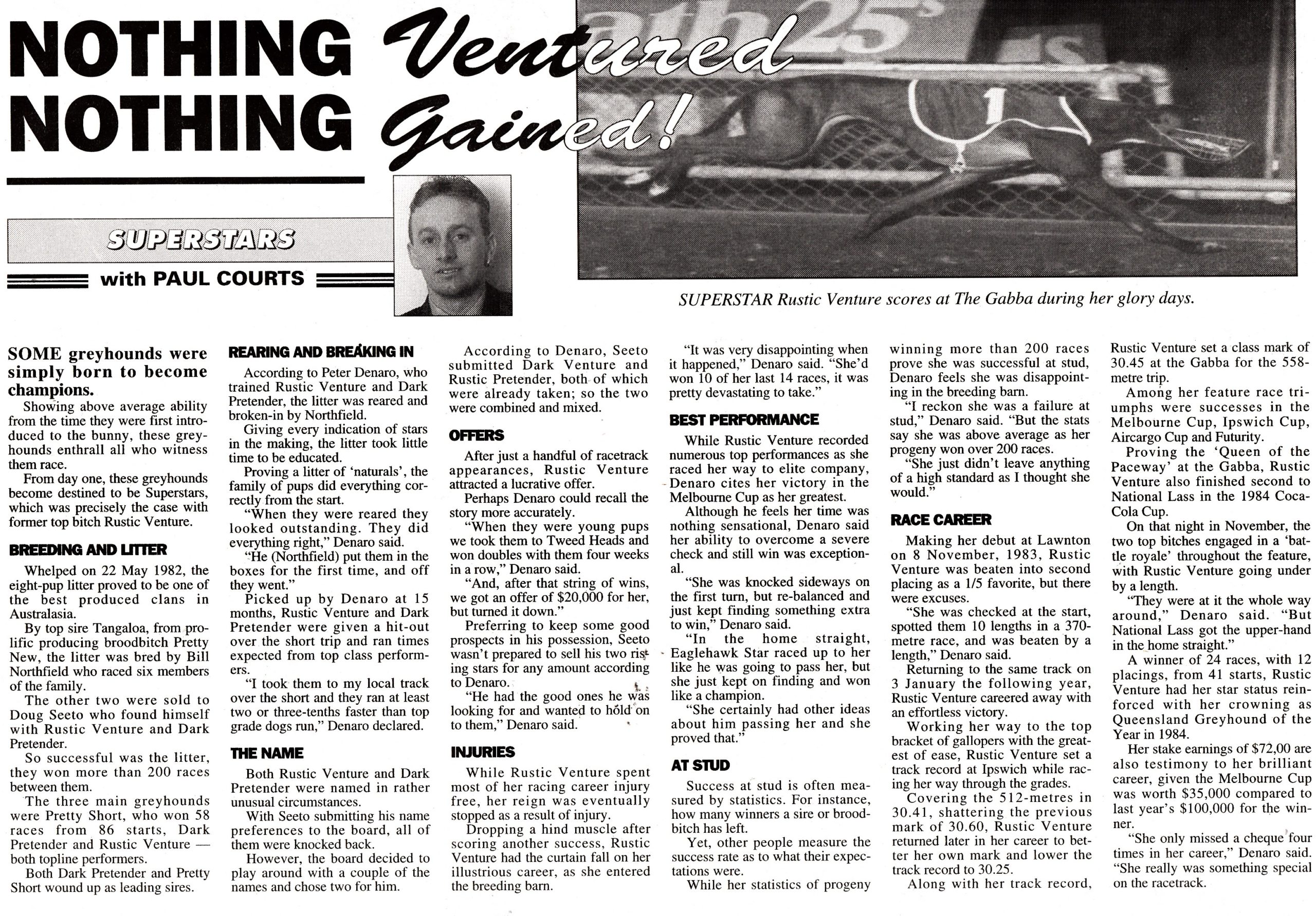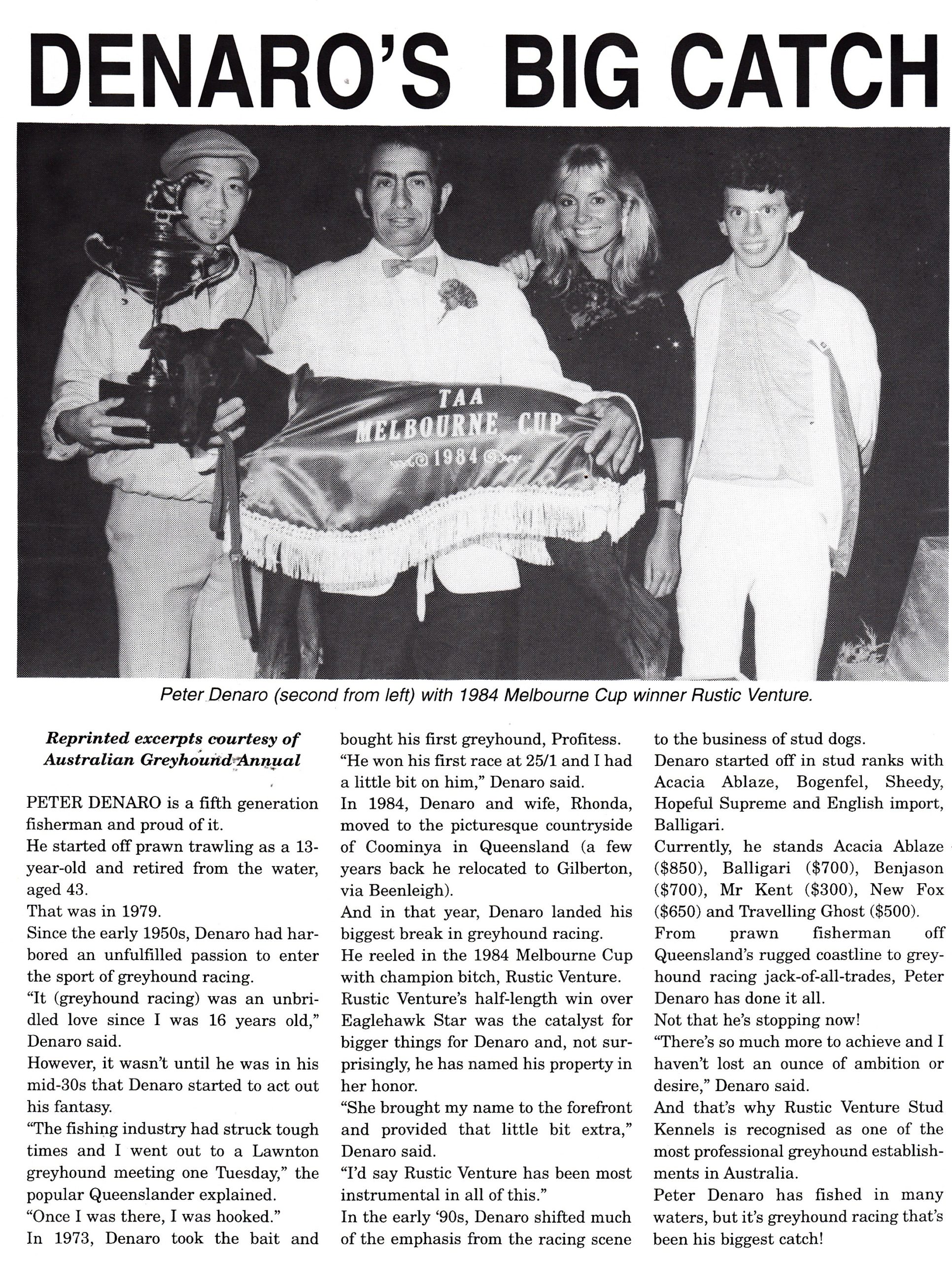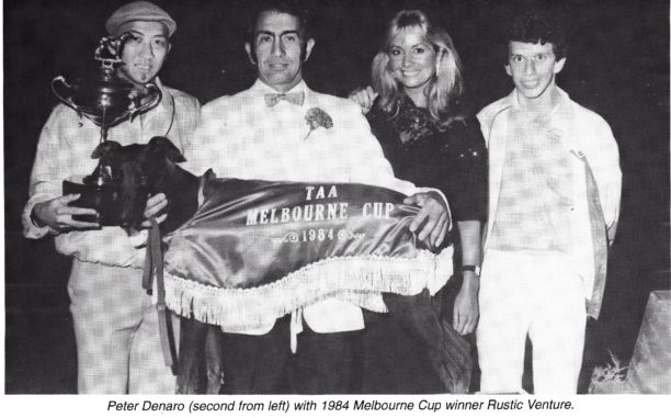 One of my favourite Melbourne Cup winners the mighty Queenslander Rustic Venture. It was the first cup I ever drank out of, celebrating well into the night with my brother. I got firmly into the camp when Peter Denaro stayed for about five weeks at my good friend the late John Weston’s place in Noble Park. John’s wife Margaret looked after my eldest daughter Emma. I was there every day at drop off and pick up when my wife worked in the city. Good trainer Peter and a great bloke, we all got on like a house on fire.