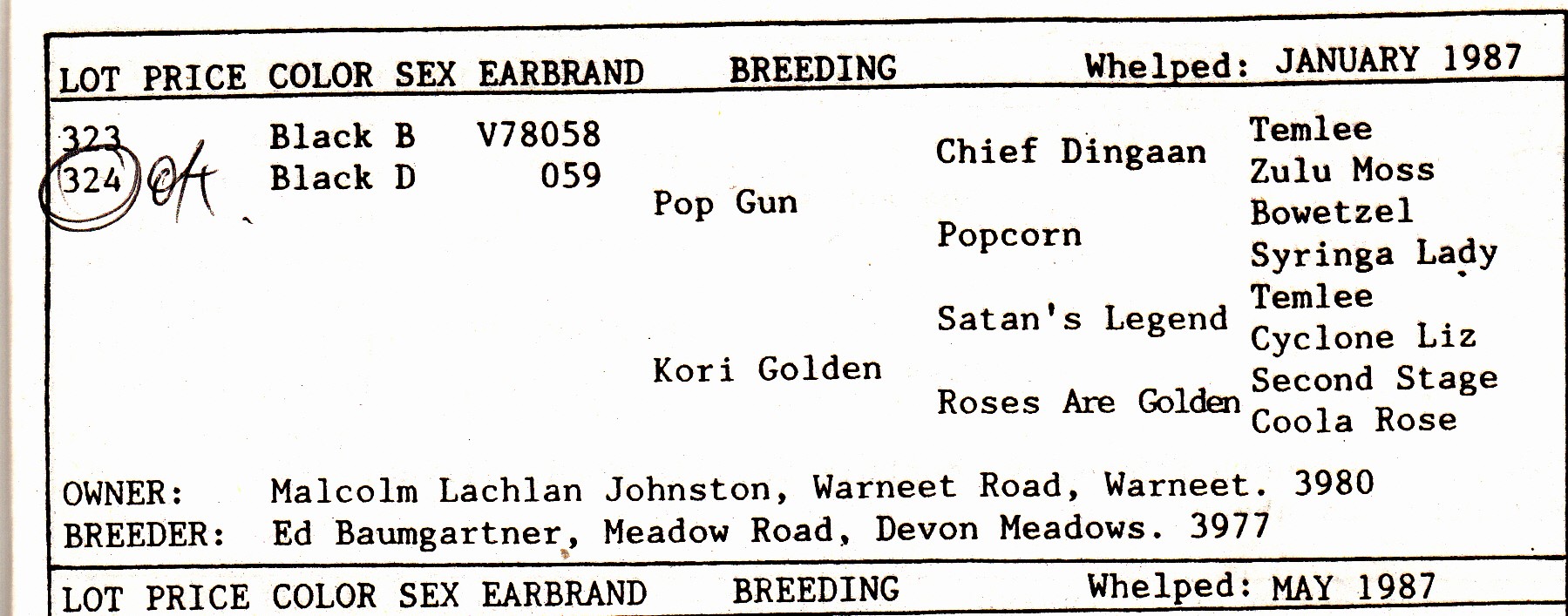 Des Dooley- Neil, I sold several Acacia Park – Secret Agent pups at this auction. The auction was tied to the Sapphire Classic which I think was won by Super Gun. A brindle pup named Joshua may have been runner up. A pup out of Nikki Bairn topped the sale. A red fawn dog out of Secret Agent was 2nd or 3rd top lot.