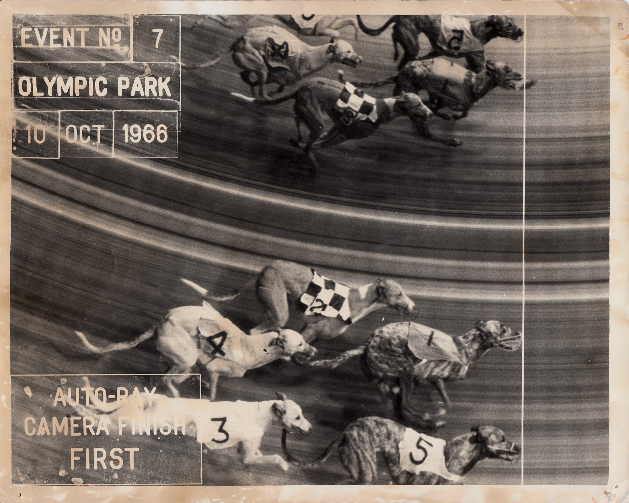 Here is a fascinating shot from Sandown in the 40’s on the old track. Talk about flying the boxes King Richard the three has left them behind. Plus, the old Photo Finish shots, you could bring home this one from 1966 at Olympic Park is of a Dead Heat.