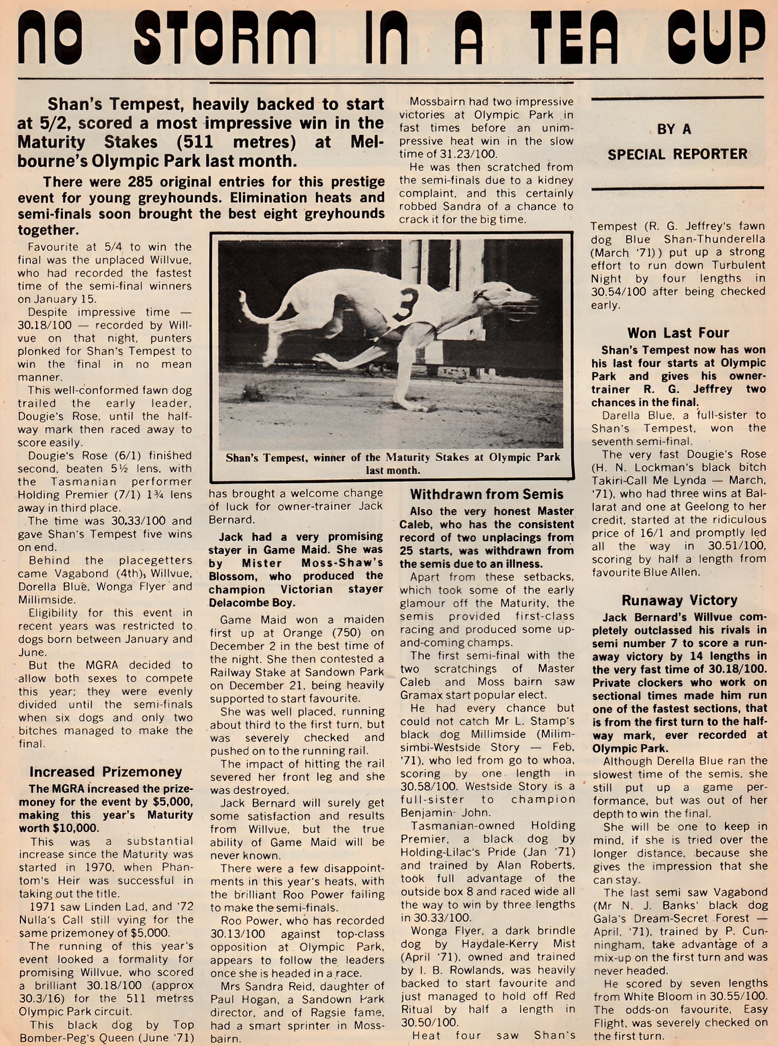 A very handy sprinter of the early 70’s was the 1973 Maturity winner Shan’s Tempest. Loved Olympic Park.