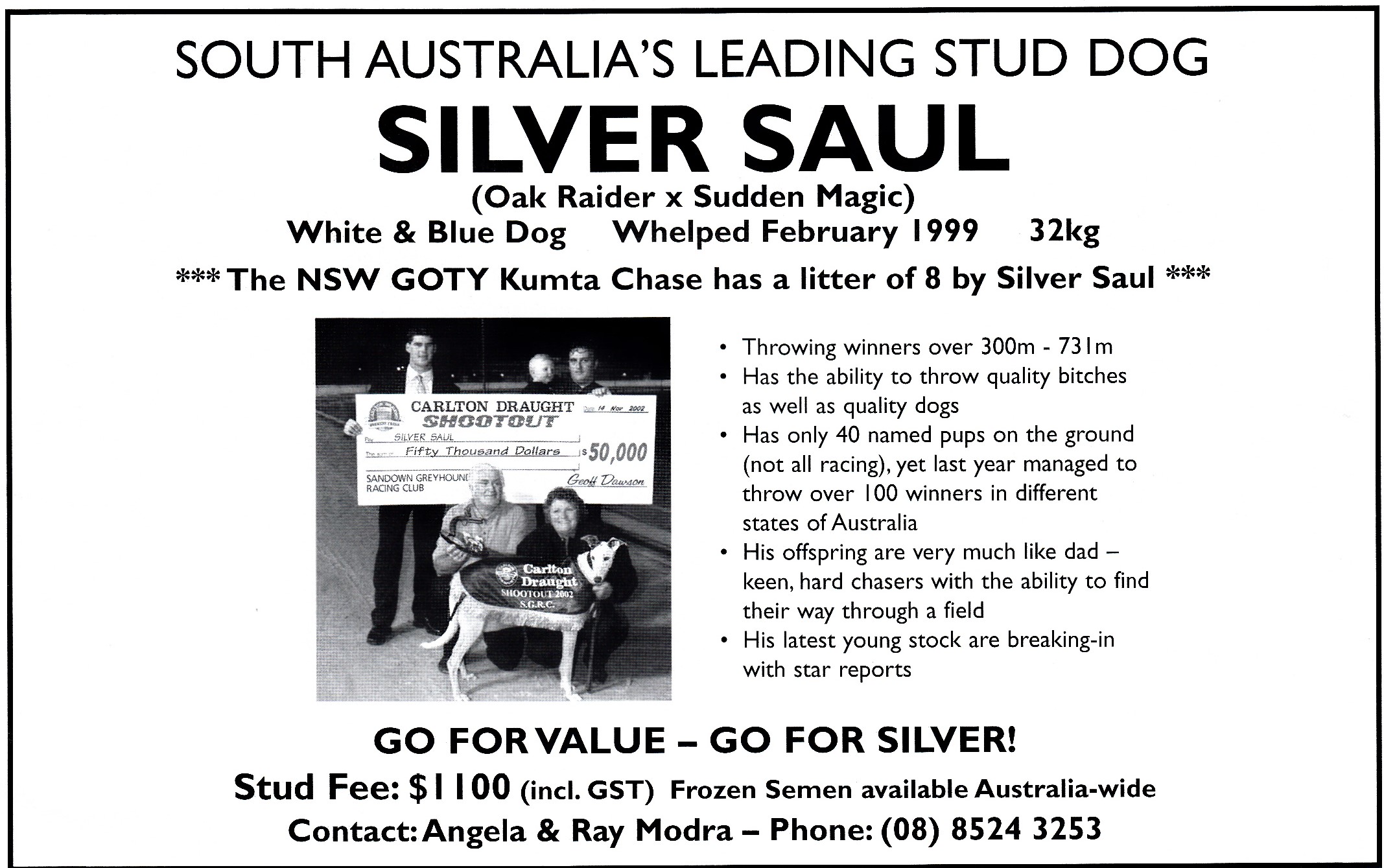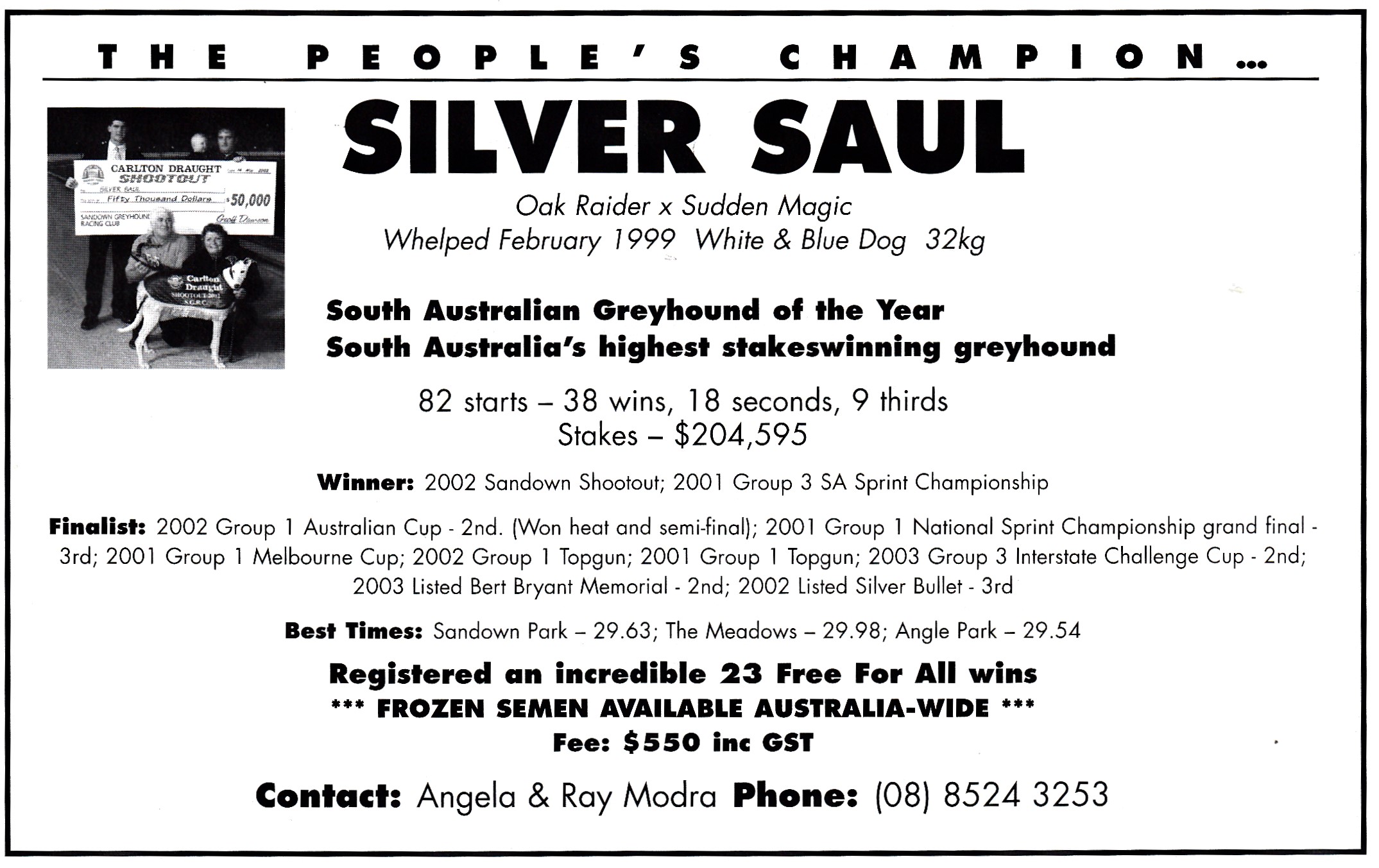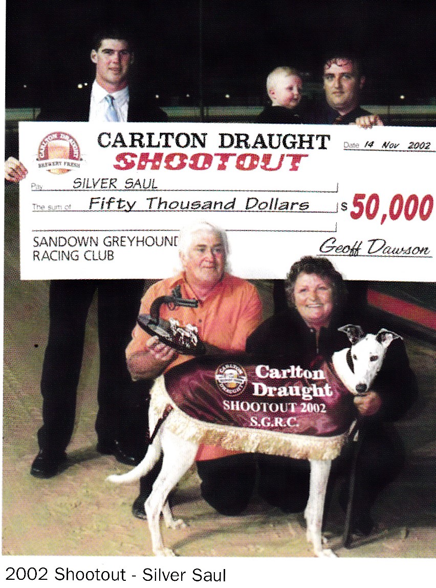 Brilliant South Australian sprinter Silver Saul winning the 2002 Shootout in 29.90 for Angela Modra. I remember the night we had him upstairs after the last in the committee room eating party pies.